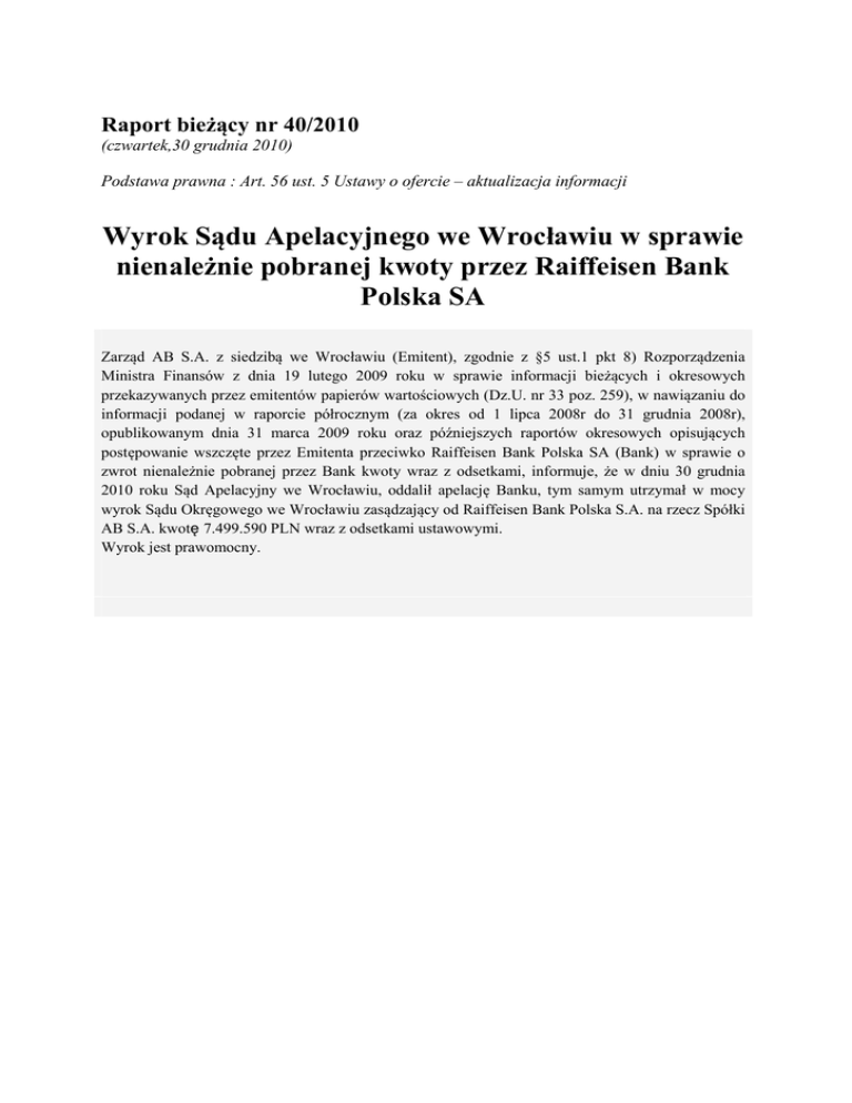 Raport bieżący nr 40/2010 (czwartek,30 grudnia 2010) Podstawa prawna : Art. 56 ust. 5 Ustawy o ofercie – aktualizacja informacji Wyrok Sądu Apelacyjnego we Wrocławiu w sprawie nienależnie pobranej kwoty przez Raiffeisen Bank Polska SA Zarząd AB S.A. z siedzibą we Wrocławiu (Emitent), zgodnie z §5 ust.1 pkt 8) Rozporządzenia Ministra Finansów z dnia 19 lutego 2009 roku w sprawie informacji bieżących i okresowych przekazywanych przez emitentów papierów wartościowych (Dz.U. nr 33 poz. 259), w nawiązaniu do informacji podanej w raporcie półrocznym (za okres od 1 lipca 2008r do 31 grudnia 2008r), opublikowanym dnia 31 marca 2009 roku oraz późniejszych raportów okresowych opisujących postępowanie wszczęte przez Emitenta przeciwko Raiffeisen Bank Polska SA (Bank) w sprawie o zwrot nienależnie pobranej przez Bank kwoty wraz z odsetkami, informuje, że w dniu 30 grudnia 2010 roku Sąd Apelacyjny we Wrocławiu, oddalił apelację Banku, tym samym utrzymał w mocy wyrok Sądu Okręgowego we Wrocławiu zasądzający od Raiffeisen Bank Polska S.A. na rzecz Spółki AB S.A. kwotę 7.499.590 PLN wraz z odsetkami ustawowymi. Wyrok jest prawomocny.
