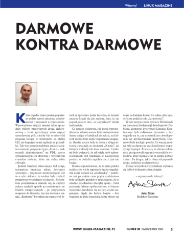 Witamy! LINUX MAGAZINE DARMOWE KONTRA DARMOWE K ilka tygodni temu pewien popularny polski serwis aukcyjny poinformował o zmianach w regulaminie. Wprowadzono między innymi zakaz sprzedaży plików przesyłanych drogą elektroniczną – teraz sprzedający musi nagrać sprzedawany plik, choćby był to niewielki program liczący 10 kilobajtów, na płytkę CD, zaś kupujący musi zapłacić za przesyłkę. Tak więc prawdopodobnie zmaleje zainteresowanie pozycjami typu „Linux – podręcznik administratora” na FDL, często sprzedawanymi za złotówkę i wysyłanymi e-mailem osobom, które nie radzą sobie z Google. Jednak bardziej interesujący był drugi, tajemniczo brzmiący zakaz, dotyczący sprzedaży... magnesów neodymowych! Jest to o tyle ciekawe, że trudno było znaleźć przejrzyste wyjaśnienie tej decyzji. Po krótkim poszukiwaniu okazało się, że chytrzy rodacy znaleźli sposób na oszukiwanie zakładów energetycznych – po przyłożeniu magnesu do licznika, ten ma rzekomo stanąć. „Rzekomo” bo opinie na rozmaitych fo- rach są sprzeczne. Jedni twierdzą, że licznik zaczyna kręcić się jak szalony, inni, że się popsuł, jeszcze inni – że „wynalazek” działa znakomicie. Co jeszcze ciekawsze, tuż przed wprowadzeniem zakazu można było zaobserwować tłumy stające w kolejkach do aukcji, na których można było kupić wspomnane magnesy. Bardzo czesto były to osoby z długą historią transakcji, ze stronami „O mnie”, na których widniały ich dane osobowe. Ciężko mi było uwierzyć, że tak wiele osób zainteresowanych jest kradzieżą w najczystszej postaci, w dodatku zupełnie się z tym nie kryjąc. Można argumentować, że to stara polska tradycja (w wielu regionach kraju rozgałęźnik wciąż nazywa się „złodziejką” – podobno tuż po wojnie cena prądu uzależniona była od liczby gnizdek w mieszkaniu), że to smutne dziedzictwo ubiegłej epoki... Fakt pozostaje faktem: społeczeństwo, w którym wzajemne okradanie się nie jest czymś nagannym, nigdy nie będzie bogate – bez względu na ilość narzekań, które słyszy się WWW.LINUX-MAGAZINE.PL u nas na każdym kroku. To jedno, dość specyficzne podejście do „darmowości”. W tym samym czasie byłem w Helsinkach na corocznej konferencji deweloperów Debiana, darmowej dystrybucji Linuksa. Konferencja była całkowicie darmowa – bez względu na to, czy uczestnik jest deweloperem czy użytkownikiem dystrybucji. Darmowe były noclegi i posiłki. Co więcej, można było za darmo na czas konferencji wypożyczyć laptopa. Pracujący za darmo ochotnicy przygotowali nagrania wszystkich wykładów, które można teraz za darmo pobrać z sieci. To drugie, jakże różne od poprzedniego, podejście do darmowości. Życząc wszystkim Czytelnikom stykania się tylko i wyłącznie z tym drugim – zapraszam do lektury! Artur Skura Redaktor Naczelny NUMER 20 PAŹDZIERNIK 2005 3