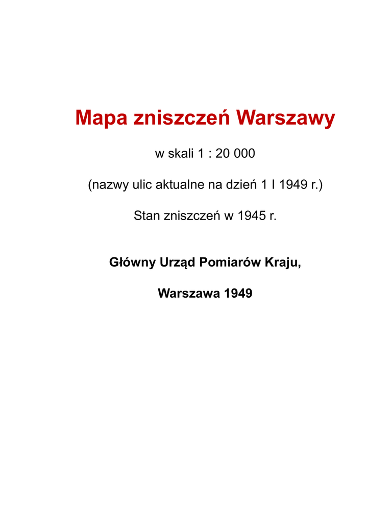 Mapa zniszczeń Warszawy w skali 1 : 20 000 (nazwy ulic aktualne na dzień 1 I 1949 r.) Stan zniszczeń w 1945 r. Główny Urząd Pomiarów Kraju, Warszawa 1949
