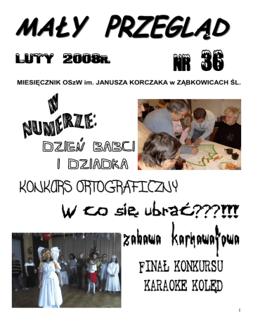 MIESIĘCZNIK OSzW im. JANUSZA KORCZAKA w ZĄBKOWICACH ŚL. 1 Wnęk pojechała do DPSu w Brzeźnicy gdzie wspólnie z pensjonariuszkami świętowali ich święto. Przedstawiliśmy program artystyczny, wspólnie śpiewaliśmy i dekorowaliśmy choinki. KaŜda Pani i Pan otrzymali od nas pamiątkową laurkę z Ŝyczeniami. [Agnieszka Pisarek pod kier. H.W.] 18.01.08 roku delegacja naszych uczniów pod opieką p. Heleny W styczniu uczniowie naszego Ośrodka poddali się torturom ortograficznym. W szkole podstawowej i gimnazjum ostatnie poty ze śmiałków wyciskała p. E. Fedak. W szkole zawodowej męczarnie zadawała p. I. śurakowska-Kik. Zwycięsko z polonistycznych opresji wyszli: W szkole podstawowej: Adrian Stelmaszewski, Adam Górski i Ewelina Woźniak. W gimnazjum: Patryk Dziura W szkole zawodowej: Edyta Gaszyńska, Justyna śandarska Brawo, brawo, brawissimo!!! Nagrodzeni otrzymali zaszczytny tytuł Mistrza Ortografii 2008. [EDZIA] 2 10 stycznia w nowym 2008 roku na świetlicy szkolnej został zorganizowany konkurs plastyczny pod hasłem „Projekt stroju karnawałowego”. Wielkimi krokami zbliŜa się termin zabawy karnawałowej, tak bardzo oczekiwanej przez uczniów. Wart więc było pokusić się o refleksję nad tym w co się ubrać. Do konkursu zgłosili się uczniowie Szkoły Podstawowej i Gimnazjum. Uczestnicy konkursu z duŜym zaangaŜowaniem planowali ubiór karateki, królewny, wojownika Ninja, Zorro. Prace zostały oceniane przez jury w składzie: K.Kik, O. Miernik, U.Jajor. Jury oceniając prace plastyczne brali pod uwagę nie tylko estetykę wykonanych prac ale stopień zaangaŜowania autora. Nagrodzone miejsca otrzymali uczniowie: Ewa Jędryczko, Wojtek Choromański, Katarzyna Jędryczko, Grzegorz Wasilewski, Łukasz Kubicz, Janusz Borek, Beata Przywara, Ola Dądela, Tomasz Grabowski, Izabela Borczyk i Aurelia Natkaniec. Gratulujemy zwycięzcom. Zachęcamy do udziału w konkursach. [Karolina Woźniak pod kier. U.J.] Dnia stycznia 2008 roku w auli szkolnej odbyła się zabawa karnawałowa dla uczniów Szkoły Podstawowej oraz Gimnazjum Um. Uczestnicy balu zebrali się na pięknie udekorowanej auli szkolnej. Na początku balu dzieci zaprezentowały swoje stroje karnawałowe. Przebrania były, tak zróŜnicowane i pomysłowe, Ŝe jury w składzie organizatorów zabawy oraz przybyłych rodziców miało problem z wyborem miejsc. Ostatecznie przyznano wiele wyróŜnień m.in. dla Smoka, Aniołka, Modelki, Zorro, 3 KsięŜniczki, Króliczka, Biedronkiktórych obficie nagrodzono słodyczami. Uczestnicy zabawy mieli okazję zaprezentować równieŜ swoje umiejętności taneczne. Sporo emocji wzbudzały konkursy, szczególnie „Taniec z krzesłami”, którego zwycięzcą została Karolina Woźniak. Czas zabawy uatrakcyjnił biesiadnikom pyszny poczęstunek przygotowany przez kuchnię szkolną w postaci bigosu, sałatki jarzynowej i droŜdŜówki. Tegoroczna zabawa karnawałowa długo pozostanie w pamięci wszystkich jej uczestników, a na kolejnej spotkamy się juŜ…..za rok. [Karolina Woźniak pod kier. U.J.] Dnia 29 stycznia 2008 roku w naszym ośrodku odbył się I Szkolny Festiwal Karaoke Kolęd. Konkurs przebiegał na dwóch etapach. W etapie pierwszym, przeprowadzonym w ramach lekcji religii przez ks. Dariusza miało miejsce wyłonienie finalistów z poszczególnych klas. Drugi etap odbył się juŜ na auli szkolnej. W jury zasiadły p. dyrektor Delfina Grzęda, p. dyrektor Krystyna Mamoń, nauczycielka j. polskiego p. Ewelina Fedak oraz przewodnicząca Kręgu Korczakowskiego p. Iwona Padło. Przed wypełnioną po brzegi widownią zaprezentowało się 18 finalistów. Wg ustalonego regulaminu ocenie podlegały: umiejętności wokalne, umiejętności czytania tekstu wraŜenie ogólne. Grad Prix zdobyła Paulina Widziak za mistrzowskie wykonanie kolędy „Oj maluśki, maluśki”. WyróŜnienie Jury otrzymały: Joanna Kocot, Agnieszka Pisarek, Mada i Renata Weinmann, Justyna śandarmska i Jarosław Kura. Wszyscy uczestnicy konkursu otrzymali dyplomy oraz nagrody ufundowane przez organizatorów, albowiem odnieśli zwycięstwo nad własną nieśmiałością i lękiem przed występami publicznymi. Gratulujemy i Ŝyczymy dalszych sukcesów! [Karolina Woźniak pod kier. U.J.] 4