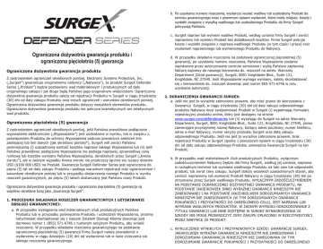 b. Po uzyskaniu numeru roszczenia, wystarczy wysłać wadliwy lub uszkodzony Produkt do serwisu gwarancyjnego wraz z pisemnym opisem wydarzeń, które miały miejsce. Koszty i wydatki związane z wysyłką wadliwego lub uszkodzonego Produktu do firmy SurgeX pokrywają Państwo. c. SurgeX naprawi lub wymieni wadliwy Produkt, według uznania firmy SurgeX i zwróci naprawiony lub wymieni Produkt bez dodatkowych kosztów. Firma SurgeX pokryje koszty i wydatki związane z naprawą wadliwego Produktu (w tym części i prace) oraz wysłaniem naprawionego lub wymienionego Produktu do Nabywcy. Ograniczona dożywotnia gwarancja produktu i ograniczona pięcioletnia (5) gwarancja Ograniczona dożywotnia gwarancja produktu Z zastrzeżeniem ograniczeń określonych poniżej, Electronic Systems Protection, Inc. („SurgeX”) gwarantuje oryginalnemu nabywcy („Nabywca”), że produkt SurgeX Defender Series („Produkt”) będzie pozbawiony wad materiałowych i produkcyjnych od daty oryginalnego zakupu i jak długo będą Państwo jego oryginalnym właścicielem. Ograniczona dożywotnia gwarancja produktu zależy od rejestracji Produktu w SurgeX w ciągu trzydziestu (30) dni od daty zakupu Produktu oraz innych ograniczeń i warunków określonych poniżej. Ograniczona dożywotnia gwarancja produktu dotyczy wszystkich elementów produktu. Ograniczona dożywotnia gwarancja produktu nie pokrywa kosmetycznych ani estetycznych wad produktu. Ograniczona pięcioletnia (5) gwarancja Z zastrzeżeniem ograniczeń określonych poniżej, jeśli Państwa prawidłowo podłączone wyposażenie elektroniczne („Wyposażenie”) jest uszkodzone w wyniku, lub w związk u z, poświęceniem Produktu do ochrony Wyposażenia podczas poważnych zakłóceń linii zasilającej lub linii danych (jak określono poniżej*), SurgeX will zwróci Państwu pomniejszoną (i) uzasadnioną wartość kosztów naprawy takiego Wyposażenia lub (ii) jeśli Państwa prawidłowo podłączone Wyposażenie nie podlega naprawie, sprawiedliwą cenę rynkową lub kosztów wymiany Państwa Wyposażenia, określonych przez SurgeX („Kwota zwrotu”), ale w żadnym wypadku Kwota zwrotu nie przekroczy łącznie stu tysięcy dolarów USD ($100 000 USD) na Produkt. Gwarancja SurgeX Defender Series jest ograniczona do pięciu (5) lat od daty zakupu Produktu i podlega warunkom rejestracji oraz ograniczeniom i warunkom określonym poniżej lub w przypadku dostarczenia nowego Produktu w wyniku roszczeń gwarancyjnych, po pięciu (5) latach dostarczany jest Państwu nowy Produkt. Ograniczona dożywotnia gwarancja produktu i ograniczona pięcioletnia (5) gwarancja są wspólnie określane tutaj jako „Gwarancje SurgeX”. 1. PROCEDURA SKŁADANIA ROSZCZEŃ GWARANCYJNYCH I UZYSKIWANIE OBSŁUGI GWARANCYJNEJ: a. W przypadku wystąpienia wad materiałowych i/lub produkcyjnych Państwa Produktu lub w przypadku poświęcenia Produktu i uszkodzeń Wyposażenia, prosimy natychmiast skontaktować się z naszym Działem Obsługi Klienta dzwoniąc pod darmowy numer 1 (855) 571-6746 z numerem seryjnym Produktu, aby wnieść roszczenie. W przypadku składania roszczenia gwarancyjnego na podstawie ograniczonej pięcioletniej (5) gwarancji firmę SurgeX należy powiadomić o wydarzeniu w ciągu dziesięciu (10) dni od wydarzenia lub w razie zrzeczenia się takiego roszczenia gwarancyjnego. d. W przypadku składania roszczenia na podstawie ograniczonej pięcioletniej (5) gwarancji, po uzyskaniu numeru roszczenia, Państwa Wyposażenie zostanie naprawione przez autoryzowane centrum serwisowe i wyślą Państwo zapłaconą fakturę naprawy do naszego kierownika ds. roszczeń na adres: Warranty Department (Dział gwarancji), SurgeX, 8001 Knightdale Blvd., Suite 121, Knightdale, NC 27545. Jeśli Wyposażenie wymaga wymiany, należy skontaktować się z kierownikiem ds. roszczeń dzwoniąc pod numer 855-571-6746 w celu uzyskania autoryzacji. 2. OGRANICZENIA GWARANCJI SURGEX: a. Jeśli nie jest to wyraźnie zabronione prawem, aby mieć prawo do skorzystania z Gwarancji SurgeX, w ciągu trzydziestu (30) dni od daty zakupu odpowiedniego produktu Nabywca musi zarejestrować Produkt w SurgeX (i) wypełniając formularz rejestracyjny produktu online, który jest dostępny na stronie www.surgex.com/defenderseries lub (ii) wysyłając do SurgeX na adres Warranty Department, SurgeX, 8001 Knightdale Blvd., Suite 121, Knightdale, NC 27545, pismo zawierające przynajmniej nazwę Nabywcy, bieżący adres pocztowy, numer telefonu, adres e-mail Nabywcy, numer seryjny produktu SurgeX oraz datę zakupu odpowiedniego Produktu. Jeśli nie jest to wyraźnie zabronione prawem, brak rejestracji Produktu w SurgeX zgodny z powyższym opisem w ciągu trzydziestu (30) dni od daty zakupu odpowiedniego Produktu unieważnia Gwarancje SurgeX na ten Produkt. b. W przypadku wad materiałowych i/lub produkcyjnych Produktu, wyłącznym zadośćuczynieniem Nabywcy będzie dla firmy SurgeX, według jej uznania, naprawa w rozsądnym terminie lub wymiana wadliwego Produktu na taki sam lub odpowiedni produkt, lub zwrot ceny zakupu. SurgeX dołoży wszelkich uzasadnionych starań, aby zwrócić naprawiony lub wymienić Produkt Nabywcy w ciągu trzydziestu (30) dni po otrzymaniu przez SurgeX wadliwego Produktu. WYŁĄCZNYM ZADOŚĆUCZYNIENIEM NA PODSTAWIE OGRANICZONEJ DOŻYWOTNIEJ GWARANCJI PRODUKTU, NA PODSTAWIE JAKIEJKOWIEK INNEJ WYRAŹNEJ GWARANCJI NINIEJSZYM NIE ZANEGOWANEJ I NA PODSTAWIE JAKICHKOLWIEK DOROZUMIANYCH GWARANCJI NINIEJSZYM NIE ZANEGOWANYCH (W TYM DOROZUMIANYCH GWARANCJI POKUPNOŚCI I PRZYDATNOŚCI DO OKREŚLONEGO CELU), JEST NAPRAWA LUB WYMIANA WADLIWYCH PRODUKTÓW. W ŻADNYM WYPADKU ODSZKODOWANIE Z TYTUŁU GWARANCJI LUB INNE DOSTĘPNE W SURGEX WYNAGRODZENIA ZA SZKODY NIE MOGĄ PRZEKROCZYĆ CENY ZAKUPU OPŁACONEJ W RZECZYWISTOŚCI PRZEZ NABYWCĘ ZA PRODUKT. c. WYKLUCZENIE WYNIKŁYCH I PRZYPADKOWYCH SZKÓD: GWARANCJE SURGEX, JAKAKOLWIEK WYRAŹNA GWARANCJA NINIEJSZYM NIE ZANEGOWANA I DOROZUMIANA GWAR