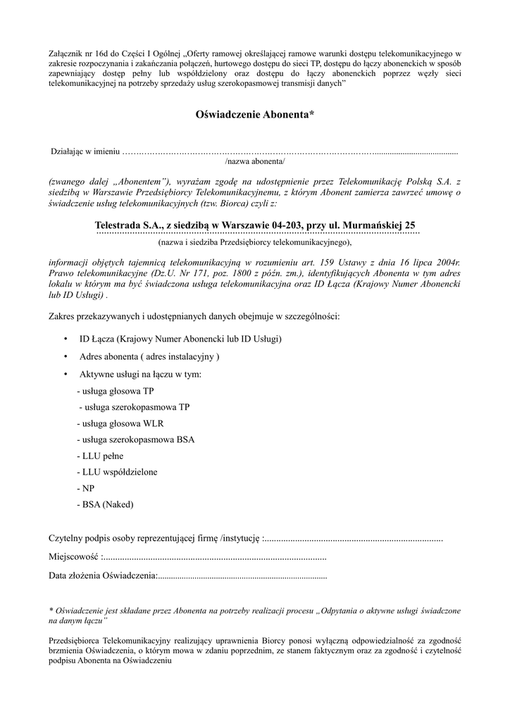 Załącznik nr 16d do Części I Ogólnej „Oferty ramowej określającej ramowe warunki dostępu telekomunikacyjnego w zakresie rozpoczynania i zakańczania połączeń, hurtowego dostępu do sieci TP, dostępu do łączy abonenckich w sposób zapewniający dostęp pełny lub współdzielony oraz dostępu do łączy abonenckich poprzez węzły sieci telekomunikacyjnej na potrzeby sprzedaży usług szerokopasmowej transmisji danych” Oświadczenie Abonenta* Działając w imieniu …….….….….….….….….….….….….….….….….….….….….….….…....................................... /nazwa abonenta/ (zwanego dalej „Abonentem”), wyrażam zgodę na udostępnienie przez Telekomunikację Polską S.A. z siedzibą w Warszawie Przedsiębiorcy Telekomunikacyjnemu, z którym Abonent zamierza zawrzeć umowę o świadczenie usług telekomunikacyjnych (tzw. Biorca) czyli z: Telestrada S.A., z siedzibą w Warszawie 04-203, przy ul. Murmańskiej 25 .............................................................................................................................. (nazwa i siedziba Przedsiębiorcy telekomunikacyjnego), informacji objętych tajemnicą telekomunikacyjną w rozumieniu art. 159 Ustawy z dnia 16 lipca 2004r. Prawo telekomunikacyjne (Dz.U. Nr 171, poz. 1800 z późn. zm.), identyfikujących Abonenta w tym adres lokalu w którym ma być świadczona usługa telekomunikacyjna oraz ID Łącza (Krajowy Numer Abonencki lub ID Usługi) . Zakres przekazywanych i udostępnianych danych obejmuje w szczególności: • ID Łącza (Krajowy Numer Abonencki lub ID Usługi) • Adres abonenta ( adres instalacyjny ) • Aktywne usługi na łączu w tym: - usługa głosowa TP - usługa szerokopasmowa TP - usługa głosowa WLR - usługa szerokopasmowa BSA - LLU pełne - LLU współdzielone - NP - BSA (Naked) Czytelny podpis osoby reprezentującej firmę /instytucję :............................................................................ Miejscowość :............................................................................................... Data złożenia Oświadczenia:............................................................................... * Oświadczenie jest składane przez Abonenta na potrzeby realizacji procesu „Odpytania o aktywne usługi świadczone na danym łączu” Przedsiębiorca Telekomunikacyjny realizujący uprawnienia Biorcy ponosi wyłączną odpowiedzialność za zgodność brzmienia Oświadczenia, o którym mowa w zdaniu poprzednim, ze stanem faktycznym oraz za zgodność i czytelność podpisu Abonenta na Oświadczeniu