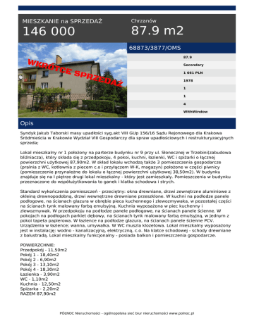 MIESZKANIE na SPRZEDAŻ 146 000 Chrzanów 87.9 m2 68873/3877/OMS 87.9 Secondary 1 661 PLN 1978 1 1 4 WithWindow Opis Syndyk Jakub Taborski masy upadłości syg.akt VIII GUp 156/16 Sądu Rejonowego dla Krakowa Śródmieścia w Krakowie Wydział VIII Gospodarczy dla spraw upadłościowych i restrukturyzacyjnych sprzeda; Lokal mieszkalny nr 1 położony na parterze budynku nr 9 przy ul. Słonecznej w Trzebini(zabudowa bliźniacza), który składa się z przedpokoju, 4 pokoi, kuchni, łazienki, WC i spiżarki o łącznej powierzchni użytkowej 87,90m2. W skład lokalu wchodzą także 3 pomieszczenia gospodarcze (pralnia z WC, kotłownia z piecem c.o i przyłączem W-K, magazyn) położone w części piwnicy (pomieszczenie przynależne do lokalu o łącznej powierzchni użytkowej 38,50m2). W budynku znajduje się na I piętrze drugi lokal mieszkalny - który jest zamieszkały. Pomieszczenia w budynku przeznaczone do współużytkowania to ganek i klatka schodowa i strych. Standard wykończenia pomieszczeń - przeciętny: okna drewniane, drzwi zewnętrzne aluminiowe z okleiną drewnopodobną, drzwi wewnętrzne drewniane przeszklone. W kuchni na podłodze panele podłogowe, na ścianach glazura w obrębie pieca kuchennego i zlewozmywaka, w pozostałej części na ścianach tynk malowany farbą emulsyjną. Kuchnia wyposażona w piec kuchenny i zlewozmywak. W przedpokoju na podłodze panele podłogowe, na ścianach panele ścienne. W pokojach na podłogach parkiet dębowy, na ścianach tynk malowany farbą emulsyjną, w jednym z pokoi tapeta papierowa. W łazience na podłodze glazura, na ścianach panele ścienne PCV. Urządzenia w łazience; wanna, umywalka. W WC muszla klozetowa. Lokal mieszkalny wyposażony jest w instalację: wodno - kanalizacyjną, elektryczną, c.o. Na klatce schodowej - schody drewniane z balustradą. Lokal mieszkalny funkcjonalny - posiada balkon i pomieszczenia gospodarcze. POWIERZCHNIE: Przedpokój - 11,50m2 Pokój 1 - 18,40m2 Pokój 2 - 6,90m2 Pokój 3 - 13,10m2 Pokój 4 - 18,30m2 Łazienka - 3,90m2 WC - 1,10m2 Kuchnia - 12,50m2 Spiżarka - 2,20m2 RAZEM 87,90m2 PÓŁNOC Nieruchomości - ogólnopolska sieć biur nieruchomości www.polnoc.pl + pom. gospodarcze 1 - 13,80m2 pom. gospodarcze 2 - 6,40m2 pom. gospodarcze 3 - 18,30m2 Niuruchomość bez obciążeń. ____________________________________________ KONTAKT: JAKUB TABORSKI 693 380 455 ul. Sądowa 4B, Chrzanów Więcej ofert znajdziesz na naszej stronie www.polnoc.pl * UWAGA! Zamieszczone na naszych stronach oferty nie stanowią oferty w rozumieniu Kodeksu Cywilnego, a dane w nich zawarte mają jedynie charakter informacyjny. Jakub Taborski tel. 693-380-455 email: [email protected] PÓŁNOC Nieruchomości - ogólnopolska sieć biur nieruchomości www.polnoc.pl Powered by TCPDF (www.tcpdf.org)