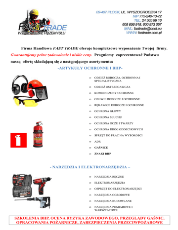 Firma Handlowa FAST TRADE oferuje kompleksowe wyposażenie Twojej firmy. Gwarantujemy pełne zadowolenie i niskie ceny. Pragniemy zaprezentować Państwu naszą ofertę składającą się z następującego asortymentu: -ARTYKUŁY OCHRONNE I BHP• ODZIEŻ ROBOCZA, OCHRONNA I SPECJALISTYCZNA • ODZIEŻ OSTRZEGAWCZA • KOMBINEZONY OCHRONNE • OBUWIE ROBOCZE I OCHRONNE • RĘKAWICE ROBOCZE I OCHRONNE • OCHRONA GŁOWY • OCHRONA SŁUCHU • OCHRONA OCZU I TWARZY • OCHRONA DRÓG ODDECHOWYCH • SPRZĘT DO PRAC NA WYSOKOŚCI • ADR • GAŚNICE • ZNAKI BHP - NARZĘDZIA I ELEKTRONARZĘDZIA – • NARZĘDZIA RĘCZNE • ELEKTRONARZĘDZIA • OSPRZĘT DO ELEKTRONARZĘDZI • NARZĘDZIA OGRODOWE • NARZĘDZIA BUDOWLANE • NARZĘDZIA POMIAROWE I WARSZTATOWE SZKOLENIA BHP, OCENA RYZYKA ZAWODOWEGO, PRZEGLĄDY GAŚNIC, OPRACOWANIA POŻARNICZE, ZABEZPIECZENIA PRZECIWPOŻAROWE - DRABINY I RUSZTOWANIA – • DRABINY POJEDYNCZE • DRABINY Z WEJŚCIEM JEDNOSTRONNYM • DRABINY 3-ELEMENTOWE • DRABINY TELESKOPOWE • DRABINY PRZEGUBOWE • DRABINY LINIOWE • RUSZTOWANIA ALUMINIOWE • RUSZTOWANIA WARSZAWSKIE • PODESTY ROBOCZE • SCHODY I POMOSTY - SPRZĘT BUDOWLANY – • BETONIARKI • AGREGATY PRĄDOTWÓRCZE • MŁOTY • NAGRZEWNICE • OSUSZACZE • ODKURZACZE • ZAGĘSZCZARKI • WCIĄGARKI • TACZKI SZKOLENIA BHP, OCENA RYZYKA ZAWODOWEGO, PRZEGLĄDY GAŚNIC, OPRACOWANIA POŻARNICZE, ZABEZPIECZENIA PRZECIWPOŻAROWE - ARTYKUŁY METALOWE – • ŚRUBY • GWOŹDZIE • WKRĘTY • KOŁKI • NITY • HAKI • KŁÓDKI • OBEJMY ZACISKOWE - SPAWALNICTWO – • SPAWARKI ELEKTRODOWE MMA • SPAWARKI MIG|MAG • SPAWARKI TIG AC|DC • ELEKTRODY I DRUTY SPAWALNICZE • PRZYŁBICE I MASKI SPAWALNICZE • AKCESORIA SZKOLENIA BHP, OCENA RYZYKA ZAWODOWEGO, PRZEGLĄDY GAŚNIC, OPRACOWANIA POŻARNICZE, ZABEZPIECZENIA PRZECIWPOŻAROWE - LINY, ZAWIESIA – • LINY • ZAWIESIA • PASY TRANSPORTOWE - CHEMIA PROFESJONALNA – • PRZEMYSŁOWA • OBIEKTOWA • KUCHENNA • TEKSTYLNA • DEZYNFEKCYJNA • BUDOWLANA - UTRZYMANIE CZYSTOŚCI – • ŚRODKI CZYSTOŚCI • KOSZE I POJEMNIKI NA ŚMIECI • MASZYNY CZYSZCZĄCE • PODAJNIKI I DOZOWNIKI • CZYŚCIWA • MATY GUMOWE I WYKŁADZINY WEWNĘTRZNE I ZEWNĘTRZNE SZKOLENIA BHP, OCENA RYZYKA ZAWODOWEGO, PRZEGLĄDY GAŚNIC, OPRACOWANIA POŻARNICZE, ZABEZPIECZENIA PRZECIWPOŻAROWE - POZOSTAŁE – • REGAŁY • WYPOSAŻENIE PARKINGÓW • SYSTEMY STOJAKÓW WOLNOSTOJĄCYCH • ZNAKI DROGOWE • • BLOKADY PARKINGOWE ODBOJNICE • • PROGI ZWALNIAJĄCE SKRZYNIE NA PIASEK, SÓL I SORBENTY • BARIERY • POPIELNICE • POJEMNIKI TRANSPORTOWE • ŁAWKI • WÓZKI TRANSPORTOWE • SZAFY BHP • PLATFORMY • SZAFY UBRANIOWE • WÓZKI PALETOWE • WIESZAKI • PODNOŚNIKI • SZCZYPCE I CHWYTAKI DO BECZEK Drogi Kliencie. Wyżej przedstawiona oferta jest jedynie ofertą poglądową. Na życzenie każdego klienta przygotowujemy szczegółową ofertę, uwzględniając wybrany asortyment. Prezentując produkty przedstawiamy cennik wraz z możliwymi rabatami już na początku współpracy. Jesteśmy otwarci na Państwa życzenia i sugestie Zapraszamy do współpracy FAST TRADE SZKOLENIA BHP, OCENA RYZYKA ZAWODOWEGO, PRZEGLĄDY GAŚNIC, OPRACOWANIA POŻARNICZE, ZABEZPIECZENIA PRZECIWPOŻAROWE