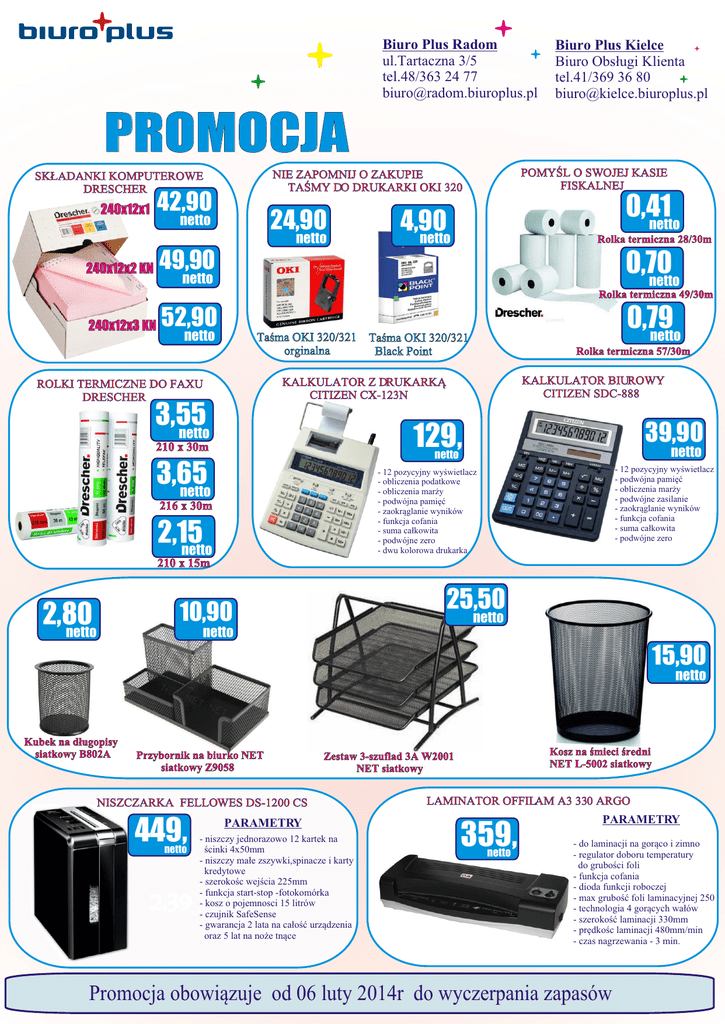 Biuro Plus Radom ul.Tartaczna 3/5 tel.48/363 24 77 [email protected] Biuro Plus Kielce Biuro Obs³ugi Klienta tel.41/369 36 80 [email protected] PROMOCJA 2,39netto 2,39 netto 42,90 240x12x1 24,90 netto netto 240x12x2 KN POMYŒL O SWOJEJ KASIE FISKALNEJ NIE ZAPOMNIJ O ZAKUPIE TAŒMY DO DRUKARKI OKI 320 SK£ADANKI KOMPUTEROWE DRESCHER 2,39 5,99 netto 0,41 netto netto 4,90 netto netto netto Rolka termiczna 28/30m 2,39 49,90 netto 0,70 netto netto 240x12x3 KN 2,39 2,39netto 52,90 netto netto netto Rolka termiczna 49/30m 0,79 netto Taœma OKI 320/321 Taœma OKI 320/321 orginalna Black Point Rolka termiczna 57/30m KALKULATOR BIUROWY CITIZEN SDC-888 KALKULATOR Z DRUKARK¥ CITIZEN CX-123N ROLKI TERMICZNE DO FAXU DRESCHER 2,39netto 2,39netto 2,39 nettonetto netto 3,55 netto netto 39,90 129, 210 x 30m netto netto 3,65 netto - 12 pozycyjny wyœwietlacz - podwójna pamiêæ - obliczenia mar¿y netto - podwójne zasilanie - zaokr¹glanie wyników - funkcja cofania - suma ca³kowita - podwójne zero - 12 pozycyjny wyœwietlacz - obliczenia podatkowe - obliczenia mar¿y - podwójna pamiêæ netto - zaokr¹glanie wyników - funkcja cofania - suma ca³kowita - podwójne zero - dwu kolorowa drukarka 0,34 2,39 216 x 30m 2,39 netto netto 2,15 netto netto netto 210 x 15m 269, netto 25,50 2,39netto 10,90 2,80 netto netto 2,39netto netto netto 15,90 netto Kubek na d³ugopisy siatkowy B802A Przybornik na biurko NET siatkowy Z9058 ¥ 2,39 NISZCZARKA FELLOWES DS-1200 CS 449, netto PARAMETRY - niszczy jednorazowo 12 kartek na œcinki 4x50mm - niszczy ma³e zszywki,spinacze i karty kredytowe - szerokoœc wejœcia 225mm - funkcja start-stop -fotokomórka - kosz o pojemnosci 15 litrów netto - czujnik SafeSense - gwarancja 2 lata na ca³oœæ urz¹dzenia oraz 5 lat na no¿e tn¹ce 2,39 2,39 Kosz na œmieci œredni NET L-5002 siatkowy netto Zestaw 3-szuflad 3A W2001 NET siatkowy LAMINATOR OFFILAM A3 330 ARGO 2,39 2,39netto netto 359, netto PARAMETRY - do laminacji na gor¹co i zimno - regulator doboru temperatury do gruboœci foli - funkcja cofania - dioda funkcji roboczej - max gruboœæ foli laminacyjnej 250 - technologia 4 gor¹cych wa³ów - szerokoœæ laminacji 330mm - prêdkoœc laminacji 480mm/min - czas nagrzewania - 3 min. Promocja obowi¹zuje od 06 luty 2014r do wyczerpania zapasów