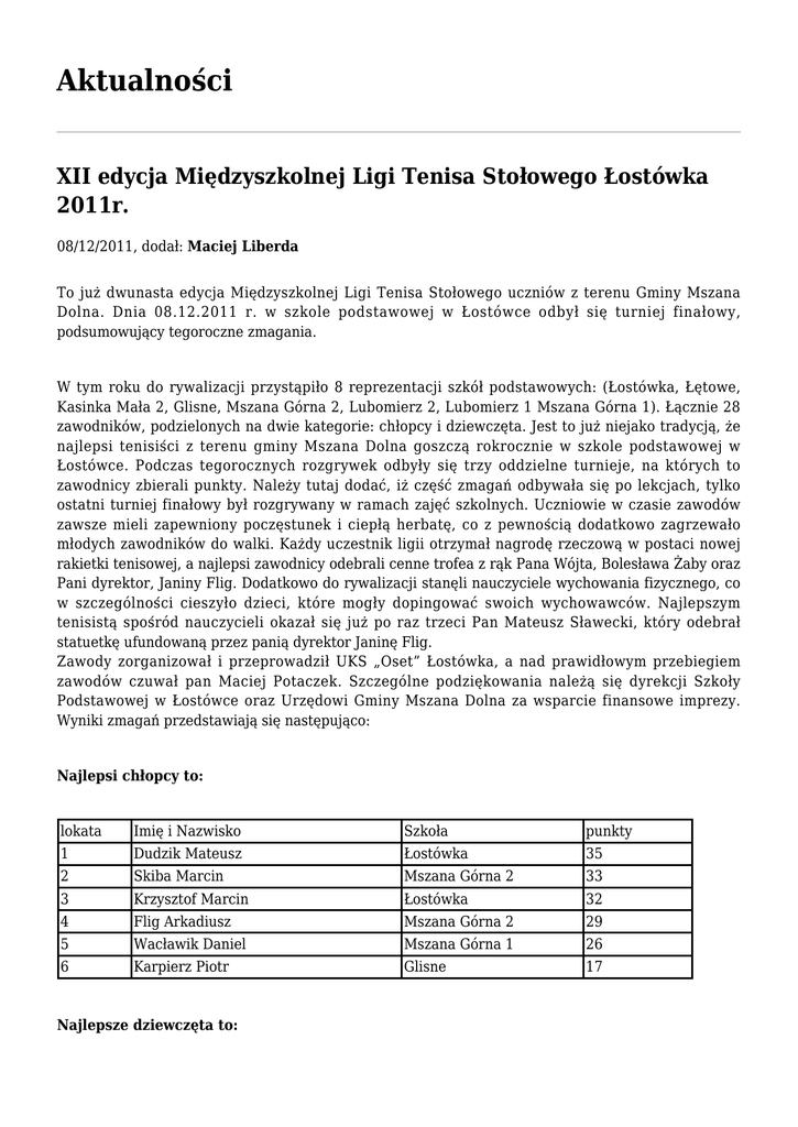 Aktualności XII edycja Międzyszkolnej Ligi Tenisa Stołowego Łostówka 2011r. 08/12/2011, dodał: Maciej Liberda To już dwunasta edycja Międzyszkolnej Ligi Tenisa Stołowego uczniów z terenu Gminy Mszana Dolna. Dnia 08.12.2011 r. w szkole podstawowej w Łostówce odbył się turniej finałowy, podsumowujący tegoroczne zmagania. W tym roku do rywalizacji przystąpiło 8 reprezentacji szkół podstawowych: (Łostówka, Łętowe, Kasinka Mała 2, Glisne, Mszana Górna 2, Lubomierz 2, Lubomierz 1 Mszana Górna 1). Łącznie 28 zawodników, podzielonych na dwie kategorie: chłopcy i dziewczęta. Jest to już niejako tradycją, że najlepsi tenisiści z terenu gminy Mszana Dolna goszczą rokrocznie w szkole podstawowej w Łostówce. Podczas tegorocznych rozgrywek odbyły się trzy oddzielne turnieje, na których to zawodnicy zbierali punkty. Należy tutaj dodać, iż część zmagań odbywała się po lekcjach, tylko ostatni turniej finałowy był rozgrywany w ramach zajęć szkolnych. Uczniowie w czasie zawodów zawsze mieli zapewniony poczęstunek i ciepłą herbatę, co z pewnością dodatkowo zagrzewało młodych zawodników do walki. Każdy uczestnik ligii otrzymał nagrodę rzeczową w postaci nowej rakietki tenisowej, a najlepsi zawodnicy odebrali cenne trofea z rąk Pana Wójta, Bolesława Żaby oraz Pani dyrektor, Janiny Flig. Dodatkowo do rywalizacji stanęli nauczyciele wychowania fizycznego, co w szczególności cieszyło dzieci, które mogły dopingować swoich wychowawców. Najlepszym tenisistą spośród nauczycieli okazał się już po raz trzeci Pan Mateusz Sławecki, który odebrał statuetkę ufundowaną przez panią dyrektor Janinę Flig. Zawody zorganizował i przeprowadził UKS „Oset” Łostówka, a nad prawidłowym przebiegiem zawodów czuwał pan Maciej Potaczek. Szczególne podziękowania należą się dyrekcji Szkoły Podstawowej w Łostówce oraz Urzędowi Gminy Mszana Dolna za wsparcie finansowe imprezy. Wyniki zmagań przedstawiają się następująco: Najlepsi chłopcy to: lokata Imię i Nazwisko Szkoła punkty 1 Dudzik Mateusz Łostówka 35 2 Skiba Marcin Mszana Górna 2 33 3 Krzysztof Marcin Łostówka 32 4 Flig Arkadiusz Mszana Górna 2 29 5 Wacławik Daniel Mszana Górna 1 26 6 Karpierz Piotr Glisne 17 Najlepsze dziewczęta to: lokata Imię i Nazwisko Szkoła punkty 1 Talarek Izabela Mszana Górna 2 30 2 Nawara Anna Kasinka Mała 2 29 3 Surówka Anna Mszana Górna 2 25 4 Myszogląd Daria Łostówka 22 5 Kaczmarczyk Marcelina Glisne 18 6 Więckowska Oliwia Łostówka 16 W klasyfikacji drużynowej wśród chłopców najlepsi okazali się: I. Miejsce - Łostówka II. Miejsce - Mszana Górna 2 III. Miejsce - Glisne Spośród dziewcząt drużynowo zwyciężyły: I. Miejsce - Mszana Górna 2 II. Miejsce - Kasinka Mała 2 III. Miejsce - Łostówka Szczegółowe wyniki : Podsumowanie MLTS 2011 - chłopcy Podsumowanie MLTS 2011 - dziewczęta Maciej Potaczek zdjęcia