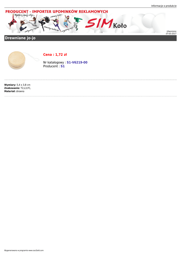 Informacje o produkcie Utworzono 07-03-2017 Drewniane jo-jo Cena : 1,72 zł Nr katalogowy : S1-V6219-00 Producent : S1 Wymiary: 5,4 x 3,8 cm Znakowanie: T2,L3,FC, Materiał: drewno Wygenerowano w programie www.oscGold.com