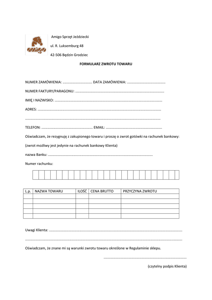 Amigo Sprzęt Jeździecki ul. R. Luksemburg 48 42-506 Będzin Grodziec FORMULARZ ZWROTU TOWARU NUMER ZAMÓWIENIA: .............................. DATA ZAMÓWIENIA: ....................................... NUMER FAKTURY/PARAGONU: .......................................................................................... IMIĘ I NAZWISKO: ............................................................................................................. ADRES: ............................................................................................................................. ......................................................................................................................................... TELEFON: .................................................... EMAIL: ......................................................... Oświadczam, że rezygnuję z zakupionego towaru i proszę o zwrot gotówki na rachunek bankowy: (zwrot możliwy jest jedynie na rachunek bankowy Klienta) nazwa Banku: .......................................................................................................... Numer rachunku: L.p. NAZWA TOWARU ILOŚĆ CENA BRUTTO PRZYCZYNA ZWROTU Uwagi Klienta: ....................................................................................................................................... ............................................................................................................................................................... Oświadczam, że znane mi są warunki zwrotu towaru określone w Regulaminie sklepu. .................................................................................... (czytelny podpis Klienta)