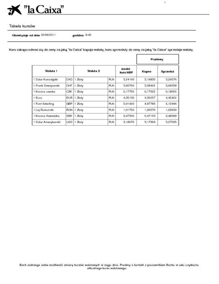1 Tabela kursów Obowiązuje od dnia 20/09/2011 godzina 8:45 Kurs zakupu odnosi się do ceny za jaką "la Caixa" kupuje walutę, kurs sprzedaży do ceny za jaką "la Caixa" sprzedaje walutę. Przelewy Waluta 1 średni kurs NBP Waluta 2 Kupno Sprzedaż 1 Dolar Kanadyjski CAD 1 Zloty PLN 3,24100 3,19835 3,29576 1 Frank Szwajcarski CHF 1 Zloty PLN 3,60760 3,58422 3,69338 1 Korona czeska CZK 1 Zloty PLN 0,17750 0,17522 0,18055 1 Euro EUR 1 Zloty PLN 4,35130 4,32257 4,45422 1 Funt Szterling GBP 1 Zloty PLN 5,01420 4,97785 5,12946 1 Lej Rumunski RON 1 Zloty PLN 1,01750 1,00576 1,03639 1 Korona Szwedzka SEK 1 Zloty PLN 0,47350 0,47153 0,48589 1 Dolar Amerykanski USD 1 Zloty PLN 3,18670 3,17369 3,27035 Bank zastrzega sobie możliwość zmiany kursów walutowych w ciągu dnia. Prosimy o kontakt z pracownikiem Banku w celu uzyskania aktualnego kursu walutowego. 2 Tabela kursów Obowiązuje od dnia 20/09/2011 godzina 8:45 Kurs zakupu odnosi się do ceny za jaką "la Caixa" kupuje walutę, kurs sprzedaży do ceny za jaką "la Caixa" sprzedaje walutę. Przelewy Waluta 1 Waluta 2 średni kurs NBP Kupno Sprzedaż Bank zastrzega sobie możliwość zmiany kursów walutowych w ciągu dnia. Prosimy o kontakt z pracownikiem Banku w celu uzyskania aktualnego kursu walutowego.