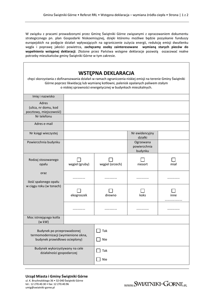 Gmina Świątniki Górne • Referat RRL • Wstępna deklaracja – wymiana źródła ciepła • Strona | 1 z 2 W związku z pracami prowadzonymi przez Gminę Świątniki Górne związanymi z opracowaniem dokumentu strategicznego pn. plan Gospodarki Niskoemisyjnej, dzięki któremu możliwe będzie pozyskanie funduszy europejskich na podjęcie działań wpływających na ograniczenie zużycia energii, redukcję emisji dwutlenku węgla i poprawę jakości powietrza, zachęcamy osoby zainteresowane wymianą starych pieców do wypełnienia wstępnej deklaracji. Złożone przez Państwa wstępne deklaracje pozwolą oszacować realne potrzeby mieszkańców gminy Świątniki Górne w tym zakresie. WSTĘPNA DEKLARACJA chęci skorzystania z dofinansowania działań w ramach ograniczenia niskiej emisji na terenie Gminy Świątniki Górne poprzez likwidację lub wymianę kotłowni, palenisk opalanych paliwem stałym o niskiej sprawności energetycznej w budynkach mieszkalnych. Imię i nazwisko Adres (ulica, nr domu, kod pocztowy, miejscowość) Nr telefonu Adres e-mail Nr księgi wieczystej Nr ewidencyjny działki Ogrzewana powierzchnia budynku Powierzchnia budynku Rodzaj stosowanego opału węgiel (gruby) węgiel (orzech) niesort miał …………… …………… …………… …………… ekogroszek drewno koks inne ………………… …………… …………… …………… …………… oraz ilość spalonego opału w ciągu roku (w tonach) Moc istniejącego kotła (w kW) Budynek po przeprowadzonej termomodernizacji (wymienione okna, budynek prawidłowo ocieplony) Budynek wykorzystywany na cele działalności gospodarczej Tak Nie Tak Nie Urząd Miasta i Gminy Świątniki Górne ul. K. Bruchnalskiego 36 • 32-040 Świątniki Górne tel.: 12 270.40.30 • fax: 12 270.40.96 [email protected] Gmina Świątniki Górne • Referat RRL • Wstępna deklaracja – wymiana źródła ciepła • Strona | 2 z 2 2016 III kwartał IV kwartał Deklarowany termin wymiany źródła ciepła (właściwe zaznaczyć) 2018 I kwartał II kwartał III kwartał IV kwartał 2017 2019 i później I kwartał II kwartał III kwartał IV kwartał Planowane nowe źródło ciepła (rodzaj opału) – właściwe zaznaczyć gaz ziemny gaz płynny (LPG) biomasa węgiel Moc planowanego źródła ciepła w kW ekogroszek olej prąd elektryczny inne ………………………………………………… ………………… kW Wg aktualnych wytycznych Programu PONE - co najmniej 20% niższa moc od istniejącego źródła. W przypadku rozbudowy budynku i zwiększania mocy pieca należy opisać sytuację. W kolejnym etapie prac nad pozyskaniem funduszy europejskich na realizację ww. zadań zostanie ogłoszony otwarty nabór wniosków dla osób zainteresowanych wymianą źródeł ciepła. Zgodnie z art. 23 ust. 1 pkt. 1 ustawy z dnia 29 sierpnia 1997 r. o ochronie danych osobowych (Dz. U. z 2015 r. poz. 2135, z późn. zm.) wyrażam zgodę na przetwarzanie danych osobowych zawartych we wstępnej deklaracji w celu oszacowania realnych potrzeb mieszkańców Gminy Świątniki Górne w zakresie wymiany pieców. Data ……………………. Podpis ……………………………….……… Zgodnie z art. 23 ust. 1 ustawy z dnia 29 sierpnia 1997 r. o ochronie danych osobowych (Dz. U. z 2015 r. poz. 2135, z późn. zm.) informuję, że: 1.Administratorem Państwa danych osobowych jest gmina Świątniki Górne. Adres administratora – UMiG Świątniki Górne, ul. Bruchnalskiego 36, 32-040 Świątniki Górne. 2.Państwa dane osobowe przetwarzane będą w celu oszacowania realnych potrzeb mieszkańców Gminy Świątniki Górne w zakresie wymiany pieców. 3.Posiadają Państwo prawo dostępu do treści swoich danych oraz ich poprawiania. 4.Podanie danych osobowych jest dobrowolne. UWAGA: ZŁOŻENIE WSTĘPNEJ DEKLARACJI NIE JEST RÓWNOZNACZNE Z OTRZYMANIEM DOTACJI Urząd Miasta i Gminy Świątniki Górne ul. K. Bruchnalskiego 36 • 32-040 Świątniki Górne tel.: 12 270.40.30 • fax: 12 270.40.96 [email protected]
