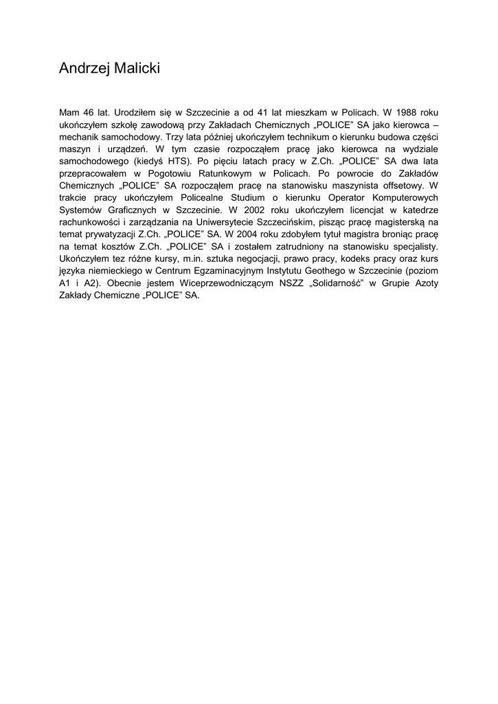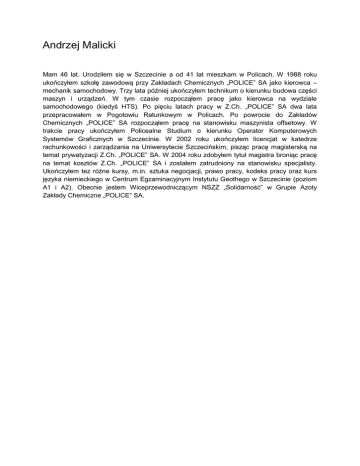 Andrzej Malicki Mam 46 lat. Urodziłem się w Szczecinie a od 41 lat mieszkam w Policach. W 1988 roku ukończyłem szkołę zawodową przy Zakładach Chemicznych „POLICE” SA jako kierowca – mechanik samochodowy. Trzy lata później ukończyłem technikum o kierunku budowa części maszyn i urządzeń. W tym czasie rozpocząłem pracę jako kierowca na wydziale samochodowego (kiedyś HTS). Po pięciu latach pracy w Z.Ch. „POLICE” SA dwa lata przepracowałem w Pogotowiu Ratunkowym w Policach. Po powrocie do Zakładów Chemicznych „POLICE” SA rozpocząłem pracę na stanowisku maszynista offsetowy. W trakcie pracy ukończyłem Policealne Studium o kierunku Operator Komputerowych Systemów Graficznych w Szczecinie. W 2002 roku ukończyłem licencjat w katedrze rachunkowości i zarządzania na Uniwersytecie Szczecińskim, pisząc pracę magisterską na temat prywatyzacji Z.Ch. „POLICE” SA. W 2004 roku zdobyłem tytuł magistra broniąc pracę na temat kosztów Z.Ch. „POLICE” SA i zostałem zatrudniony na stanowisku specjalisty. Ukończyłem tez różne kursy, m.in. sztuka negocjacji, prawo pracy, kodeks pracy oraz kurs języka niemieckiego w Centrum Egzaminacyjnym Instytutu Geothego w Szczecinie (poziom A1 i A2). Obecnie jestem Wiceprzewodniczącym NSZZ „Solidarność” w Grupie Azoty Zakłady Chemiczne „POLICE” SA.
