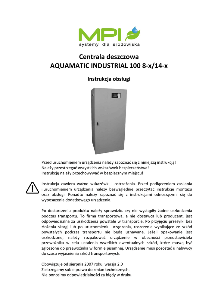 Centrala deszczowa AQUAMATIC INDUSTRIAL 100 8-x/14-x Instrukcja obsługi Przed uruchomieniem urządzenia należy zapoznać się z niniejszą instrukcją! Należy przestrzegać wszystkich wskazówek bezpieczeństwa! Instrukcję należy przechowywać w bezpiecznym miejscu! Instrukcja zawiera ważne wskazówki i ostrzeżenia. Przed podłączeniem zasilania i uruchomieniem urządzenia należy bezwzględnie przeczytać instrukcje montażu oraz obsługi. Ponadto należy zapoznać się z instrukcjami odnoszącymi się do wyposażenia dodatkowego urządzenia. Po dostarczeniu produktu należy sprawdzić, czy nie wystąpiły żadne uszkodzenia podczas transportu. To firma transportowa, a nie dostawca lub producent, jest odpowiedzialna za uszkodzenia powstałe w transporcie. Po przyjęciu przesyłki bez złożenia skargi lub po uruchomieniu urządzenia, roszczenia wynikające ze szkód powstałych podczas transportu nie będą uznawane. Jeżeli opakowanie jest uszkodzone, należy rozpakować urządzenie w obecności przedstawiciela przewoźnika w celu ustalenia wszelkich ewentualnych szkód, które muszą być zgłoszone do przewoźnika w formie pisemnej. Urządzenie musi pozostać u nabywcy do czasu wyjaśnienia szkód transportowych. Obowiązuje od sierpnia 2007 roku, wersja 2.0 Zastrzegamy sobie prawo do zmian technicznych. Nie ponosimy odpowiedzialności za błędy w druku. Spis treści 1.0 Wstęp ........................................................................................................................... 3 1.1 Gwarancja (fragment) .................................................................................................. 3 1.2 Uwagi ogólne................................................................................................................ 3 1.3 Opis produktu............................................................................................................... 3 1.4 Panel sterowania.......................................................................................................... 4 1.5 Konserwacja ................................................................................................................. 7 1.6 Usuwanie usterek......................................................................................................... 8 1.7 Dane techniczne........................................................................................................... 9 1.8 Ważne informacje ...................................................................................................... 10 1.9 Deklaracja zgodności.................................................................................................. 13 Symbole Uwaga! Nieprzestrzeganie tych wskazówek może prowadzić do uszkodzenia urządzenia. Niebezpieczeństwo! Nieprzestrzeganie tych wskazówek może prowadzić do obrażeń osób. Informacja! Dostarcza użytecznych informacji o poszczególnych sekcjach. W kolejnych rozdziałach umieszczono jedynie symbole graficzne. 1 1.0 Wstęp W celu zapewnienia długiej i bezawaryjnej pracy urządzenia należy zapoznać się i przestrzegać zaleceń poniższej instrukcji. Podczas instalacji i uruchomienia należy stosować się do zapisów zawartych w instrukcji montażu. Produkt został gruntownie przetestowany w naszej fabryce. Oznacza to, że dostarczone urządzenie jest pozbawione wad. W przypadku wystąpienia usterki w trakcie pracy urządzenia, zob. rozdział 1.6 “Usuwanie usterek”. W przypadku wystąpienia innych usterek należy skontaktować się z przedstawicielem handlowym lub dystrybutorem. 1.1 Gwarancja (fragment) Zastosowanie mają regulacje krajowe. Okres gwarancji wynosi 24 miesiące od daty zakupu produktu. W okresie gwarancji wszystkie usterki wynikające z wad materiałowych i błędów produkcyjnych będą usuwane bezpłatnie. Są to usterki powstałe pomimo eksploatacji i podłączenia urządzenia zgodnie z instrukcją montażu i obsługi. 1.2 Uwagi ogólne Użytkownik jest odpowiedzialny za: • poprawną instalację, • unikanie zagrożeń związanych z nieprawidłowym użytkowaniem. Urządzenie zostało zaprojektowane wyłącznie: • do zasilania prądem AC 230 V / 50 Hz, • do sterowania systemami zagospodarowania wody deszczowej, • jako stacja pompy zasilającej w systemach zagospodarowania wody deszczowej, • do pracy z wodą o maksymalnej temperaturze 35 °C, • do pracy w pobliżu budynków mieszkalnych, handlowych i w obszarach przemysłowych, jak i w małych przedsiębiorstwach. Nie ponosimy finansowej odpowiedzialności za szkody powstałe w wyniku niewłaściwej instalacji lub eksploatacji urządzenia. Pytania dotyczące urządzenia i zamawiania części zamiennych: • należy skontaktować się z dystrybutorem urządzenia, • podać adres e-mail, • zawsze należy podać numer seryjny urządzenia. 1.3 Opis produktu Aquamatic Industrial 100 jest w pełni wyposażoną jednostką sterującą do systemów zagospodarowania wody deszczowej. Urządzenie składa się z elektrycznego systemu sterowania, wewnętrznego zbiornika buforowego ze szczeliną powietrzną typu AA i zintegrowanego zestawu pomp. Jednostka sterująca monitoruje poziom wody w zbiorniku magazynującym wody deszczowej, jak i w wewnętrznym zbiorniku buforowym. Woda z instalacji wodociągowej jest dostarczana zgodnie normą PN-EN 1717, w zależności od zapotrzebowania, do wewnętrznego zbiornika 3 buforowego ze szczeliną powietrzną typu AA w przypadku niedoboru wody deszczowej, wystąpienia ciśnienia zwrotnego w instalacji kanalizacyjnej (jeżeli zainstalowano czujnik ciśnienia) lub trybu pracy ręcznej. Zawór elektromagnetyczny w zapasowym systemie wody wodociągowej jest regularnie otwierany, aby zapobiec stagnacji wody w rurze doprowadzającej wodę wodociągową. Interfejs beznapięciowy umożliwia zewnętrzne monitorowanie usterek. Jednostka sterująca informuje o usterkach za pomocą sygnałów wizualnych i dźwiękowych, odpowied