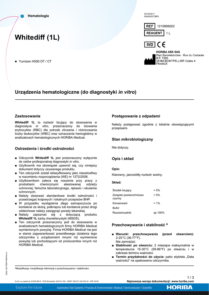 2015/03/11 A95A00273BPL Hematologia 1210906022 1L Whitediff (1L) ■ Yumizen H500 OT / CT Urządzenia hematologiczne (do diagnostyki in vitro) Zastosowanie QUAL-QA-TEMP-0866 Rev.6 Whitediff 1L to roztwór lizujący do stosowania w diagnostyce in vitro, przeznaczony do lizowania erytrocytów (RBC) dla potrzeb zliczania i różnicowania liczby leukocytów (WBC) oraz oznaczania hemoglobiny w analizatorach hematologicznych HORIBA Medical. Postępowanie z odpadami Należy postępować zgodnie z lokalnie obowiązującymi przepisami. Stan mikrobiologiczny Ostrzeżenia i środki ostrożności Nie dotyczy. ■ Odczynnik Whitediff 1L jest przeznaczony wyłącznie do celów profesjonalnej diagnostyki in vitro. ■ Użytkownik ma obowiązek upewnić się, czy niniejszy dokument dotyczy używanego produktu. ■ Ten odczynnik został sklasyfikowany jako nieszkodliwy w rozumieniu rozporządzenia (WE) nr 1272/2008. ■ Użytkownikom zaleca się noszenie przy pracy z produktami chemicznymi atestowanej odzieży ochronnej: fartucha laboratoryjnego, rękawic i okularów ochronnych. ■ Należy stosować standardowe środki ostrożności i przestrzegać krajowych i lokalnych przepisów BHP. ■ W przypadku wystąpienia złego samopoczucia po kontakcie ze skórą, połknięciu lub kontakcie przez drogi oddechowe należy zasięgnąć porady lekarskiej. ■ Należy zapoznać się z dotyczącą produktu Whitediff 1L kartą charakterystyki (MSDS). ■ Ten odczynnik przeznaczony jest do stosowania w analizatorach hematologicznych firmy HORIBA Medical wymienionych powyżej. Firma HORIBA Medical nie jest w stanie zagwarantować prawidłowego działania tego odczynnika z urządzeniami innymi niż wymienione powyżej lub pochodzącymi od producentów innych niż HORIBA Medical. Opis i skład aModyfikacja: Opis: Klarowny, jasnożółty roztwór wodny. Skład: Środek lizujący < 5% Związek powierzchniowo czynny < 5% Konserwant < 1% Bufor Rozcieńczalnik qs 100% Przechowywanie i stabilność a ■ Warunki przechowywania (przed otwarciem): 2-25°C (36-77°F). Nie zamrażać. ■ Stabilność po otwarciu: 2 miesiące maksymalnie w temperaturze 15-30°C (59-86°F) po otwarciu i w zakresie terminu ważności. ■ Termin przydatności do użycia: patrz etykieta „Data ważności” na opakowaniu odczynnika. modyfikacja informacji o przechowywaniu i stabilności. 1/3 S.A.S. au capital de 23,859.980 € - RCS Montpellier 328 031 042 - SIRET 328 031 042 000 42 - APE 332 B Najnowsza wersja dokumentacji: www.horiba.com Hematologia Whitediff (1L) Wymagane wyposażenie niewchodzące w skład produktu ■ Automatyczny analizator hematologiczny ■ Kalibrator: ABX Minocal. ■ Kontrola: zgodnie z instrukcją obsługi preparatu kontrolnego stosowanego z posiadanym analizatorem ■ Standardowy sprzęt laboratoryjny Próbka Pobieranie próbek: Wszystkie próbki krwi należy pobrać przy użyciu właściwej techniki! Wszystkie próbki, odczynniki, kalibratory, kontrole itp. zawierające ekstrakty materiału pochodzenia ludzkiego należy traktować jako potencjalnie zakaźne i podczas pracy z nimi należy stosować zasady bezpieczeństwa biologicznego (1, 2). Dla potrzeb badań zaleca się pobieranie próbek krwi żylnej. W wyjątkowych przypadkach dopuszcza się stosowanie krwi tętniczej. Pobierana krew musi trafiać do probówek próżniowych lub atmosferycznych (3, 4). Probówka do pobierania krwi musi być wypełniona krwią dokładnie do oznaczonego na niej poziomu, co pozwoli uniknąć rozbieżności w wynikach. Zalecany antykoagulant: Zalecanymi antykoagulantami są K3-EDTA i K2-EDTA, przy zachowaniu prawidłowych proporcji objętości krwi do objętości antykoagulantu, zgodnie ze specyfikacją producenta. W innym przypadku mogą powstawać skrzepy. Stabilność próbki krwi: Patrz instrukcja obsługi. Mikropróbkowanie: Obsługiwany przez analizator tryb próbkowania umożliwia pracę z mikropróbkami, co czyni go przydatnym do celów pediatrycznych i geriatrycznych (informacje o minimalnej objętości próbki krwi podano w instrukcji obsługi analizatora). Praca z mikropróbkami wymaga spełnienia następujących warunków: ■ Probówka musi zawsze znajdować się w położeniu pionowym. ■ Krew może być mieszana tylko przez delikatne uderzanie w probówkę. Nie wolno obracać probówki w celu wymieszania jej zawartości, gdyż spowoduje to jej rozprowadzenie po ścianach naczynia i obniżenie jej poziomu w probówce poniżej wymaganego minimum. Mieszanie: Próbki krwi przed pobraniem muszą zostać wymieszane delikatnie, lecz dokładnie, aby zapewnić homogeniczność użytej w oznaczeniach mieszanki. Procedura Ten odczynnik jest gotowy do użycia. 1. Opis sposobu identyfikacji odczynnika Whitediff 1L zawarto w instrukcji obsługi. Identyfikację można przeprowadzić ręcznie lub za pomocą czytnika kodów kreskowych. 2. W razie potrzeby, wyjmij z niej opróżniony pojemnik po odczynniku Whitediff 1L. 3. Otwórz zatyczkę nowej butelki z odczynnikiem. 4. Włóż do butelki rurkę z zatyczką. 5. Dokładnie załóż zatyczkę, upewniając się co do jej szczelności. 6. Zainstaluj odczynnik Whitediff odczynnikowej analizatora. 1L w komorze Postępuj zgodnie ze wskazówkami wyświetlanymi przez oprogramowanie analizatora. Procedurę wykonywania analiz i stosowania odczynników kontrolnych szczegółowo opisano w instrukcji obsługi analizatora. Metodologia Whitediff 1L powoduje rozpad błony komórkowej erytrocytu (RBC), co skutkuje uwolnieniem hemoglobiny, które można zmierzyć spektrofotometrycznie. Whitediff 1L jest selektywnym środkiem lizującym, umożliwiającym ustalenie całkowitej liczby leukocytów oraz różnicowe zliczenie ich 5 populacji (limfocytów, monocytów, neutrofili, eozynofili oraz bazofili). Whitediff 1L pozwala również na wykrywanie nietypowych limfocytów i dużych niedojrzałych komórek. Charakterystyka analityczna i ograniczenia metody Opis charakterystyki analitycznej analizatora i ograni