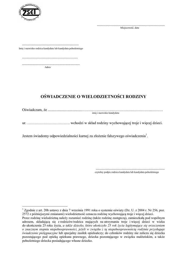 ........................................................................ Miejscowość, data ............................................................ Imię i nazwisko rodzica kandydata lub kandydata pełnoletniego ........................................................... ............................................................. Adres OŚWIADCZENIE O WIELODZIETNOŚCI RODZINY Oświadczam, że ....................................………………………………………………..……… imię i nazwisko kandydata ur. ……………………………. wchodzi w skład rodziny wychowującej troje i więcej dzieci. Jestem świadomy odpowiedzialności karnej za złożenie fałszywego oświadczenia1. ......................................................................... czytelny podpis rodzica kandydata lub kandydata pełnoletniego 1 Zgodnie z art. 20b ustawy z dnia 7 września 1991 roku o systemie oświaty (Dz. U. z 2004 r. Nr 256, poz. 2572 z późniejszymi zmianami) wielodzietność oznacza rodzinę wychowującą troje i więcej dzieci. Przez rodzinę wielodzietną należy rozumieć rodzinę (także rodzinę zastępczą), zamieszkałą pod wspólnym adresem, składającą się z rodziców/rodzica mających na utrzymaniu troje i więcej dzieci w wieku do ukończenia 25 roku życia, a także dziecko, które ukończyło 25 rok życia legitymujące się orzeczeniem o znacznym stopniu niepełnosprawności, jeżeli w związku z tą niepełnosprawnością rodzinie przysługuje świadczenie pielęgnacyjne lub specjalny zasiłek opiekuńczy; do członków rodziny nie zalicza się dziecka pozostającego pod opieką opiekuna prawnego, dziecka pozostającego w związku małżeńskim, a także pełnoletniego dziecka posiadającego własne dziecko.