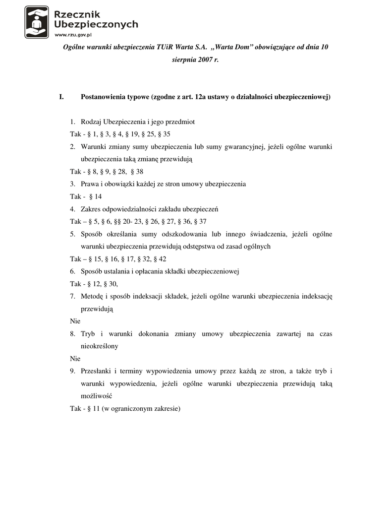 Ogólne warunki ubezpieczenia TUiR Warta S.A. „Warta Dom” obowiązujące od dnia 10 sierpnia 2007 r. I. Postanowienia typowe (zgodne z art. 12a ustawy o działalności ubezpieczeniowej) 1. Rodzaj Ubezpieczenia i jego przedmiot Tak - § 1, § 3, § 4, § 19, § 25, § 35 2. Warunki zmiany sumy ubezpieczenia lub sumy gwarancyjnej, jeżeli ogólne warunki ubezpieczenia taką zmianę przewidują Tak - § 8, § 9, § 28, § 38 3. Prawa i obowiązki każdej ze stron umowy ubezpieczenia Tak - § 14 4. Zakres odpowiedzialności zakładu ubezpieczeń Tak – § 5, § 6, §§ 20- 23, § 26, § 27, § 36, § 37 5. Sposób określania sumy odszkodowania lub innego świadczenia, jeżeli ogólne warunki ubezpieczenia przewidują odstępstwa od zasad ogólnych Tak – § 15, § 16, § 17, § 32, § 42 6. Sposób ustalania i opłacania składki ubezpieczeniowej Tak - § 12, § 30, 7. Metodę i sposób indeksacji składek, jeżeli ogólne warunki ubezpieczenia indeksację przewidują Nie 8. Tryb i warunki dokonania zmiany umowy ubezpieczenia zawartej na czas nieokreślony Nie 9. Przesłanki i terminy wypowiedzenia umowy przez każdą ze stron, a także tryb i warunki wypowiedzenia, jeżeli ogólne warunki ubezpieczenia przewidują taką możliwość Tak - § 11 (w ograniczonym zakresie) II. Przedmiot i zakres odpowiedzialności ubezpieczyciela Analizowane OWU dotyczą ubezpieczenia o charakterze pakietowym. W oparciu nie może zostać zawarta umowa ubezpieczenia następujących przedmiotów: 1) lokal mieszkalny, 2) dom jednorodzinny, 3) garaż, 4) inny budynek, 5) ogrodzenie, 6) stałe elementy lokalu mieszkalnego, 7) ruchomości domowe, znajdujące się na terytorium Rzeczypospolitej Polskiej i do których ubezpieczony posiada tytuł prawny. Lokal mieszkalny lub stałe elementy lokalu oraz dom jednorodzinny mogą być objęty ochroną ubezpieczeniową również na etapie inwestycji (budowy) Co do zasady, przedmioty te mogą być ubezpieczone w zakresie obejmującym zdarzenia losowe i zniszczenia w związku z akcją ratowniczą oraz (ruchomości i stałe elementy wyposażenia) w zakresie kradzieży z włamaniem, rabunku i dewastacji. Ochrona ubezpieczeniowa, oprócz ww. zakresu, dla lokalu, stałych elementów i ruchomości / domu i ruchomości rozszerzona jest o usługi ASSISTANCE Umowa ubezpieczenia może zostać rozszerzona o następujące ubezpieczenia dodatkowe: 1) przedmioty codziennego Użytku – pakiet TOREBKA, 2) odpowiedzialność cywilna osób fizycznych w życiu prywatnym. Na podstawie pakietu TOREBKA, WARTA odpowiada za szkody powstałe na terytorium Rzeczypospolitej Polskiej powstałe w przedmiotach codziennego Użytku wskutek usiłowania lub dokonania rabunku. Przedmiotem ubezpieczenia OC jest odpowiedzialność cywilna ubezpieczonego i jego osób bliskich, jeżeli w związku z czynnościami w życiu prywatnym lub posiadaniem mienia są oni zobowiązani, w myśl przepisów prawa, do naprawienia szkody. III. Wyłączenia bądź ograniczenia odpowiedzialności ubezpieczyciela W myśl § 6, WARTA nie odpowiada za szkody: 1) nieprzekraczające w dniu ustalenia odszkodowania 100 zł, a w przypadku szkód powstałych na skutek stłuczenia szyb lub zalania nieprzekraczające 50 zł, 2) powstałe wskutek: a) zalania wodą pochodzącą z opadów atmosferycznych poprzez dach, obróbki blacharskie, zanieczyszczone lub zamarznięte rynny/rury spustowe, ściany, balkony, tarasy, okna lub inne niewłaściwie zabezpieczone lub niezabezpieczone otwory, jeżeli obowiązek konserwacji tych urządzeń, instalacji lub elementów należał do obowiązków ubezpieczonego, b) przenikania wód z gruntu do budynku, chyba że było ono wynikiem powodzi, c) zawilgocenia stałych elementów, chyba że było ono wynikiem powodzi, d) przemarzania ścian, e) zamarznięcia wody, z wyłączeniem prawidłowo ogrzewanego i zaizolowanego lokalu mieszkalnego/domu jednorodzinnego, f) pleśni i zagrzybienia budynku, g) naturalnego osiadania budynku, szkód górniczych lub prowadzonych robót ziemnych, h) drgań spowodowanych ruchem pojazdów lądowych, powietrznych, podziemnych, i) korozji i utleniania, j) naturalnego zużycia, k) konfiskaty lub wywłaszczenia przez organy państwa, l) błędów w sztuce budowlanej, wad konstrukcyjnych, materiałowych, projektowych, m) rozbiórki przedmiotu ubezpieczenia, n) uszkodzenia, zabrudzenia, poplamienia, odbarwienia tynków zewnętrznych i elewacji na skutek zalania wodą pochodzącą z opadów atmosferycznych, o) działań wojennych, strajków, stanu wyjątkowego, zamieszek, rozruchów, aktów terrorystycznych, p) niewykonania przez ubezpieczonego przeglądów technicznych, badań okresowych lub działań okresowych wynikających z przepisów prawa, q) prowadzenia prac budowlanych bez stosownych pozwoleń lub po dokonaniu nieuprawnionych zmian w projektach, r) prowadzenia prac budowlanych przez osoby nieposiadające stosownych uprawnień, s) nieprzestrzegania obowiązujących przepisów, w szczególności prawa budowlanego, przepisów ppoż, 3) wyrządzone przez ubezpieczonego, jego osoby bliskie lub pomoc domową: a) w związku ze spożyciem alkoholu, narkotyków lub innych środków odurzających, b) umyślnie lub na skutek rażącego niedbalstwa, 4) powstałe w: a) przedmiotach ubezpieczenia, do których ubezpieczony nie posiada tytułu prawnego, b) ruchomościach domowych jeśli budynek, w którym się znajdują, nie posiada pozwolenia na użytkowanie, c) szybach stanowiących zabudowę balkonów/logii/tarasów na skutek przypadkowego uszkodzenia, zniszczenia, porysowania, d) lokalu mieszkalnym/stałych elementach lokalu mieszkalnego w trakcie inwestycji (budowy), jeśli budynek wielorodzinny, w którym się znajdują nie osiągnął stanu surowego zamkniętego, tj. nie nastąpiło wyodrębnienie budowanych lokali stropami, ścianami, oknami i drzwiami zewnętrznymi, e) miejscach parkingowych na skutek zalania lub dewastacji, f) przedmiotach służących działalności gospod