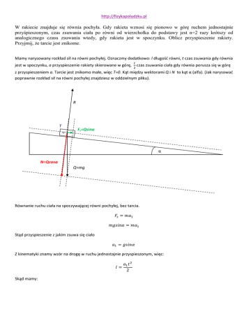 http://fizykapoludzku.pl W rakiecie znajduje się równia pochyła. Gdy rakieta wznosi się pionowo w górę ruchem jednostajnie przyśpieszonym, czas zsuwania ciała po równi od wierzchołka do podstawy jest n=2 razy krótszy od analogicznego czasu zsuwania wtedy, gdy rakieta jest w spoczynku. Oblicz przyspieszenie rakiety. Przyjmij, że tarcie jest znikome. Mamy narysowany rozkład sił na równi pochyłej. Oznaczmy dodatkowo: l długość równi, t czas zsuwania gdy równia jest w spoczynku, a przyspieszenie rakiety skierowane w górę, ௧ ଶ czas zsuwania ciała gdy równia porusza się w górę z przyspieszeniem a. Tarcie jest znikomo małe, więc T=0. Kąt między wektorami Q i N to kąt α (alfa). (Jak narysować poprawnie rozkład sił na równi pochyłej znajdziesz w oddzielnym pliku). R T Fs=Qsinα α N=Qcosα Q=mg Równanie ruchu ciała na spoczywającej równi pochyłej, bez tarcia. ܨ௦ = ݉ܽଵ ݉݃ܽ݉ = ߙ݊݅ݏଵ Stąd przyspieszenie z jakim zsuwa się ciało ܽଵ = ݃ߙ݊݅ݏ Z kinematyki znamy wzór na drogę w ruchu jednostajnie przyspieszonym, więc: Skąd mamy: ܽଵ ݐଶ ݈= 2 http://fizykapoludzku.pl 2݈ 2݈ =ݐඨ =ඨ ܽଵ ݃ߙ݊݅ݏ R T Fs=Qsinα α N=Qcosα Q=mg+ma Gdy rakieta leci w górę z przyspieszeniem a mamy stan przeciążenia, więc na ciało działa „dodatkowy ciężar” równy ma. ܨ௦ = ݉ܽଶ ሺ݉݃ + ݉ܽሻܽ݉ = ߙ݊݅ݏଶ Stąd przyspieszenie z jakim zsuwa się ciało ܽଶ = ሺ݃ + ܽሻߙ݊݅ݏ Z kinematyki znamy wzór na drogę w ruchu jednostajnie przyspieszonym, więc: ݈= Skąd mamy: ܽଶ ݐଶ 2 ݐ 2݈ 2݈ =ඨ =ඨ ሺ݃ + ܽሻߙ݊݅ݏ 2 ܽଶ Więc: 2݈ = ݐ2ඨ ሺ݃ + ܽሻߙ݊݅ݏ http://fizykapoludzku.pl Po porównaniu obydwu wyników otrzymujemy: 2݈ 2݈ ඨ = 2ඨ ሺ݃ + ܽሻߙ݊݅ݏ ݃ߙ݊݅ݏ Podnosimy obustronnie do kwadratu: Po podzieleniu obustronnie przez ଶ ௦ఈ 2݈ 2݈ =4 ሺ݃ + ܽሻߙ݊݅ݏ ݃ߙ݊݅ݏ otrzymujemy: 1 4 = ݃ ሺ݃ + ܽሻ ݃ + ܽ = 4݃ ܽ = 3݃ Odp. Rakieta porusza się z przyspieszeniem 3g.