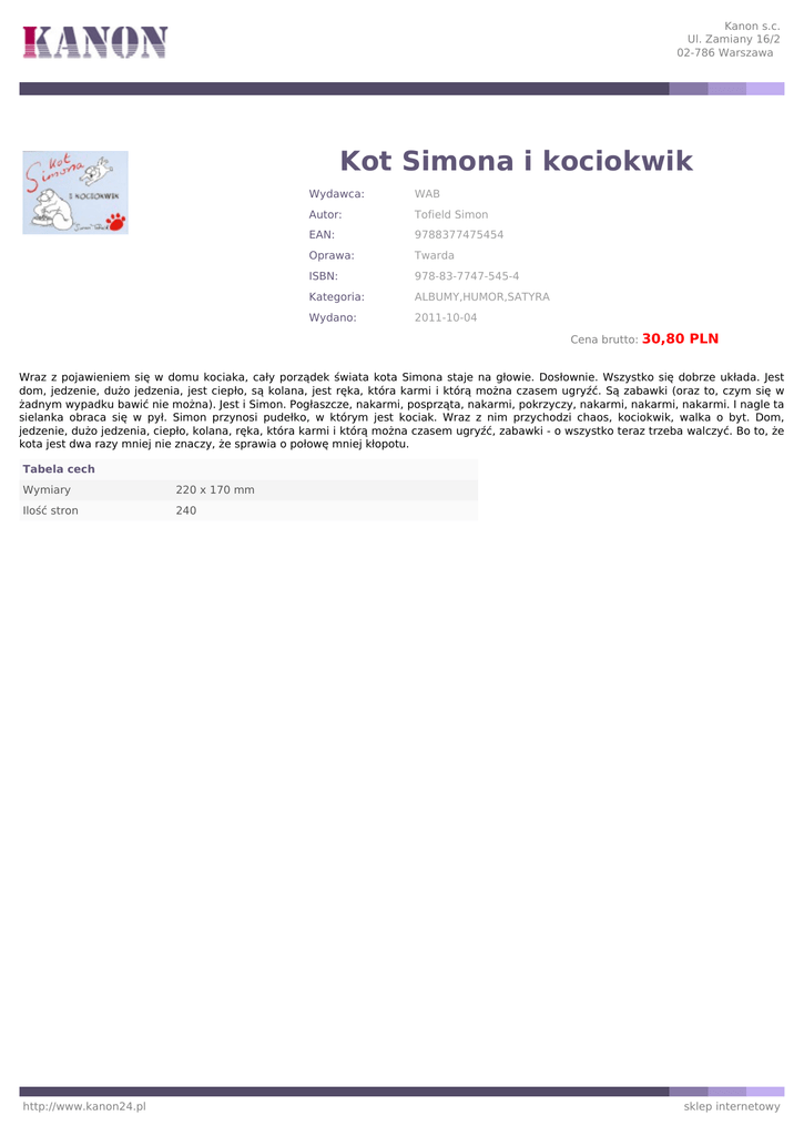 Kanon s.c. Ul. Zamiany 16/2 02-786 Warszawa Kot Simona i kociokwik Wydawca: WAB Autor: Tofield Simon EAN: 9788377475454 Oprawa: Twarda ISBN: 978-83-7747-545-4 Kategoria: ALBUMY,HUMOR,SATYRA Wydano: 2011-10-04 Cena brutto: 30,80 PLN Wraz z pojawieniem się w domu kociaka, cały porządek świata kota Simona staje na głowie. Dosłownie. Wszystko się dobrze układa. Jest dom, jedzenie, dużo jedzenia, jest ciepło, są kolana, jest ręka, która karmi i którą można czasem ugryźć. Są zabawki (oraz to, czym się w żadnym wypadku bawić nie można). Jest i Simon. Pogłaszcze, nakarmi, posprząta, nakarmi, pokrzyczy, nakarmi, nakarmi, nakarmi. I nagle ta sielanka obraca się w pył. Simon przynosi pudełko, w którym jest kociak. Wraz z nim przychodzi chaos, kociokwik, walka o byt. Dom, jedzenie, dużo jedzenia, ciepło, kolana, ręka, która karmi i którą można czasem ugryźć, zabawki - o wszystko teraz trzeba walczyć. Bo to, że kota jest dwa razy mniej nie znaczy, że sprawia o połowę mniej kłopotu. Tabela cech Wymiary 220 x 170 mm Ilość stron 240 http://www.kanon24.pl sklep internetowy