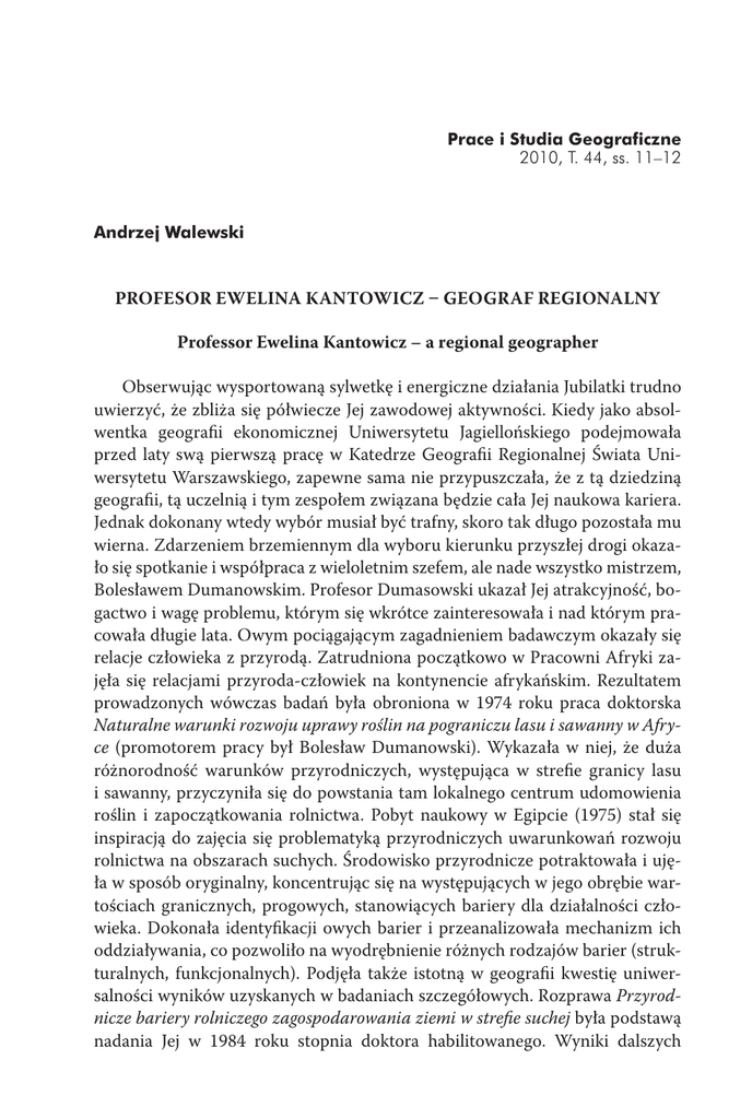 Prace i Studia Geograficzne 2010, T. 44, ss. 11–12 Andrzej Walewski Profesor Ewelina Kantowicz – geograf regionalny Professor Ewelina Kantowicz – a regional geographer Obserwując wysportowaną sylwetkę i energiczne działania Jubilatki trudno uwierzyć, że zbliża się półwiecze Jej zawodowej aktywności. Kiedy jako absolwentka geografii ekonomicznej Uniwersytetu Jagiellońskiego podejmowała przed laty swą pierwszą pracę w Katedrze Geografii Regionalnej Świata Uniwersytetu Warszawskiego, zapewne sama nie przypuszczała, że z tą dziedziną geografii, tą uczelnią i tym zespołem związana będzie cała Jej naukowa kariera. Jednak dokonany wtedy wybór musiał być trafny, skoro tak długo pozostała mu wierna. Zdarzeniem brzemiennym dla wyboru kierunku przyszłej drogi okazało się spotkanie i współpraca z wieloletnim szefem, ale nade wszystko mistrzem, Bolesławem Dumanowskim. Profesor Dumasowski ukazał Jej atrakcyjność, bogactwo i wagę problemu, którym się wkrótce zainteresowała i nad którym pracowała długie lata. Owym pociągającym zagadnieniem badawczym okazały się relacje człowieka z przyrodą. Zatrudniona początkowo w Pracowni Afryki zajęła się relacjami przyroda-człowiek na kontynencie afrykańskim. Rezultatem prowadzonych wówczas badań była obroniona w 1974 roku praca doktorska Naturalne warunki rozwoju uprawy roślin na pograniczu lasu i sawanny w Afryce (promotorem pracy był Bolesław Dumanowski). Wykazała w niej, że duża różnorodność warunków przyrodniczych, występująca w strefie granicy lasu i sawanny, przyczyniła się do powstania tam lokalnego centrum udomowienia roślin i zapoczątkowania rolnictwa. Pobyt naukowy w Egipcie (1975) stał się inspiracją do zajęcia się problematyką przyrodniczych uwarunkowań rozwoju rolnictwa na obszarach suchych. Środowisko przyrodnicze potraktowała i ujęła w sposób oryginalny, koncentrując się na występujących w jego obrębie wartościach granicznych, progowych, stanowiących bariery dla działalności człowieka. Dokonała identyfikacji owych barier i przeanalizowała mechanizm ich oddziaływania, co pozwoliło na wyodrębnienie różnych rodzajów barier (strukturalnych, funkcjonalnych). Podjęła także istotną w geografii kwestię uniwersalności wyników uzyskanych w badaniach szczegółowych. Rozprawa Przyrodnicze bariery rolniczego zagospodarowania ziemi w strefie suchej była podstawą nadania Jej w 1984 roku stopnia doktora habilitowanego. Wyniki dalszych 12 Andrzej Walewski adań dotyczące klimatycznych i glebowych zasobów rolnictwa w tej strefie b oraz zagrożeń środowiskowych występujących na obszarach nawadnianych opublikowała w książce Strefa sucha – zasoby i zagrożenia rolnictwa (1999). Jubilatka zajmowała się zagadnieniem przyrodniczych uwarunkowań rozwoju społeczno-gospodarczego także na innych obszarach i w innej skali. Przez kilkanaście lat uczestniczyła w pracach polsko-francuskiego zespołu badawczego „Languedoc-Mazowsze”, prowadzącego w latach 80. i 90. studia porównawcze nad rozwojem lokalnym w Polsce i we Francji. Badania nad problematyką człowiek-środowisko zrodziły refleksje o charakterze filozoficzno-metodologicznym. Ich owocem są artykuły poświęcone różnym zagadnieniom metodologicznym geografii, a geografii regionalnej w szczególności. Przedstawiła w nich m.in. koncepcję geografii regionalnej jako dyscypliny badającej relacje między środowiskiem przyrodniczym a różnymi formami działalności człowieka. W działalności dydaktycznej Jubilatki, oprócz prowadzenia wykładów, ćwiczeń, seminariów, na szczególne wyróżnienie zasługują studia terenowe. W Sudetach przez blisko 40 lat wprowadzała studentów w tajniki terenowych badań geograficznych, uczyła obserwować, interpretować i rozumieć otaczający krajobraz. Każda forma obcowania z „terenem” sprawia Jej dużą przyjemność. Już podczas studiów w Krakowie dzieliła czas między naukę i tatrzańskie wspinaczki (podobno z tej rywalizacji częściej zwycięsko wychodziły Tatry). Swoją fascynację górami przekazywała później nie tylko studentom, ale i szerokim rzeszom Polaków w popularnonaukowych programach telewizyjnych o Tatrach i Sudetach. Nie mają też przed Nią żadnych tajemnic Dolomity, a zwłaszcza ich najtrudniejsze trasy zjazdowe. Ciekawość świata zaprowadziła Ją w odległe jego regiony. W trakcie zawodowych i turystycznych podróży poznała Afrykę i Spitsbergen, Australię i Bliski Wschód, Amerykę Środkową i Syberię, a także liczne zakątki Europy. Na uniwersytecie pełniła i pełni różne ważne funkcje, m.in. kierowała wydziałowym Studium Doktoranckim, od 10 lat kieruje Zakładem Geografii Regionalnej, a od niemal 20 – Międzywydziałowymi Studiami Ochrony Środowiska. Ochrona środowiska stała się z czasem drugim, obok geografii regionalnej, polem działalności Jubilatki (Jej osiągnięcia w tej dziedzinie przedstawiają w tym tomie prof. E. Lonc i dr M. Roge-Wiśniewska). Zainteresowanie ochroną środowiska było logiczną konsekwencją zajmowania się relacjami łączącymi ludzi z ich przyrodniczym otoczeniem i narastającej świadomości zagrożeń, do jakich działalność człowieka może niekiedy prowadzić. Umacniało to przeświadczenie, że ludzie powinni tak funkcjonować, aby przyrody nie zniszczyć, że mają obowiązek ją chronić i zachować dla przyszłych pokoleń. Zrównoważony rozwój jest jednym z najważniejszych wyzwań stojących obecnie przed światem i jednocześnie jednym z fundamentalnych problemów współczesnej nauki.