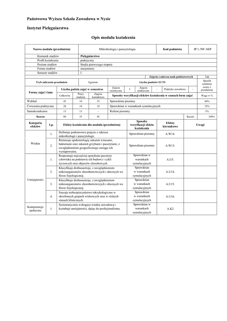 Państwowa Wyższa Szkoła Zawodowa w Nysie Instytut Pielęgniarstwa Opis modułu kształcenia Nazwa modułu (przedmiotu) Kierunek studiów Profil kształcenia Poziom studiów Forma studiów Semestr studiów Mikrobiologia i parazytologia IP.1./NP.-MiP Kod podmiotu Pielęgniarstwo praktyczny Studia pierwszego stopnia stacjonarny I Zajęcia z zakresu nauk podstawowych Tryb zaliczenia przedmiotu Formy zajęć i inne - Sposoby weryfikacji efektów kształcenia w ramach form zajęć Waga w % Liczba punktów ECTS Egzamin Liczba godzin zajęć w semestrze Tak Sposób ustalania oceny z przedmiotu Zajęcia teoretyczne Zajęcia praktyczne 3 - Praktyka zawodowa Całkowita Pracy studenta Zajęcia kontaktowe Wykład 45 10 35 Sprawdzian pisemny 60% Ćwiczenia praktyczne 20 10 10 Sprawdzian w warunkach symulacyjnych 35% Samokształcenie 15 15 - Referat pisemny 5% 80 35 45 Razem: Kategoria efektów Lp. 1. Wiedza 2. 1. 2. Umiejętności Kompetencje społeczne Efekty kształcenia dla modułu (przedmiotu) Definiuje podstawowe pojęcia z zakresu mikrobiologii i parazytologii. Różnicuje epidemiologię zakażeń wirusami, bakteriami oraz zakażeń grzybami i pasożytami, z uwzględnieniem geograficznego zasięgu ich występowania. Rozpoznaje najczęściej spotykane pasożyty człowieka na podstawie ich budowy i cykli życiowych oraz objawów chorobowych. Klasyfikuje drobnoustroje, z uwzględnieniem mikroorganizmów chorobotwórczych i obecnych we florze fizjologicznej. 3. Klasyfikuje drobnoustroje, z uwzględnieniem mikroorganizmów chorobotwórczych i obecnych we florze fizjologicznej. 4. Szacuje niebezpieczeństwo toksykologiczne w określonych grupach wiekowych oraz w różnych stanach klinicznych. 1. Systematycznie wzbogaca wiedzę zawodową i kształtuje umiejętności, dążąc do profesjonalizmu. Razem Sposoby weryfikacji efektu kształcenia Efekty kierunkowe Sprawdzian pisemny A.W14. Sprawdzian pisemny A.W15. Sprawdzian w warunkach symulacyjnych Sprawdzian w warunkach symulacyjnych Sprawdzian w warunkach symulacyjnych Sprawdzian w warunkach symulacyjnych Sprawdzian w warunkach symulacyjnych A.U5. A.U14. A.U15. A.U16. A.K2 100% Uwagi Prowadzący Forma zajęć Prowadzący zajęcia (tytuł/stopień naukowy, imię i nazwisko) Wykład Ćwiczenia praktyczne Samokształcenie Prof. dr hab. n. med. Ewa Ziółko Prof. dr hab. n. med. Ewa Ziółko Prof. dr hab. n. med. Ewa Ziółko Treści kształcenia Wykład Lp. Metody dydaktyczne Tematyka zajęć 1. Wprowadzenie do mikrobiologii: drobnoustroje i człowiek. 2. Klasyfikacja i identyfikacja drobnoustrojów. 3. 4. Genetyka bakterii. Zakażenia wirusem HIV i choroba AIDS. 5. Układ odpornościowy. Rola pielęgniarki w edukowaniu społeczeństwa. 6. Leki przeciwbakteryjne. Znaczenie leków przeciwbakteryjnych w leczeniu objawowym. 7. Dezynfekcja i sterylizacja. Rola pielęgniarki w zapobieganiu zakażeniom wewnątrzoddziałowym i wewnątrzszpitalnym. 8. Oporność bakterii na antybiotyki. Rola pielęgniarki w antybiotykoterapii. 9. Ziarenkowce i Laseczki Gram- dodatnie. Rola pielęgniarki w zapobieganiu chorobom wywoływanym przez ziarenkowce i laseczki gram dodatnie. 10. Bakteriologia kliniczna- diagnostyka laboratoryjna zakażeń bakteryjnych. Flora fizjologiczna. 11. Prątki , krętki, mykoplazmy. Choroby wywoływane przez powyższe bakterie. Rola pielęgniarki w zapobieganiu zakażeniom. 12. Bakterie wewnątrzkomórkowe. 13. Podstawy wirusologii. Rola edukacyjna Wykład z wykorzystaniem technik multimedialnych Tematyczne efekty kształcenia W wyniku kształcenia student: - wyjaśni podstawowe pojęcia mikrobiologiczne i epidemiologiczne (chorobotwórczość, zakażenie), - omówi ekologię drobnoustrojów, - omówi naturalną mikroflorę organizmu człowieka, - omówi wpływ drobnoustrojów na życie człowieka. - omówi sposób rozpoznawania drobnoustrojów, - omówi sposób oznaczania drobnoustrojów na antybiotyki, sulfonamidy, i leki nitrofuranowe. - omówi cechy morfologiczne i fizjologiczne komórki bakteryjnej. - omówi etiologię i patogenezę zakażeń wirusem HIV, - przedstawi obraz kliniczny choroby AIDS, - wyjaśni zasady profilaktyki zakażeń wirusem HIV- rola pielęgniarki. - poda definicję immunologii i jej działy, - omówi czynniki i mechanizmy obronne, - omówi nieswoiste czynniki i mechanizmy odpornościowe (bariery anatomiczne, humoralne mechanizmy obronne, komórkowe mechanizmy obronne), - omówi swoiste czynniki i mechanizmy odpornościowe (antygeny, przeciwciała, klasy immunoglobulin, przeciwciała monoklinalne, dopełniacz, limfocyty B i T, fagocyty i fagocytoza, niedobory odpornościowe). - wyjaśni pojęcia : leki chemioterapeutyczne sulfonamidy, antybiotyki, leki nitrofurazowe, leki przeciwgrzybiczne, - omówi działanie poszczególnych leków, - omówi znaczenie leków w leczeniu objawowym. - zna definicję sterylizacji i dezynfekcji, - potrafi wymienić chemiczne i fizyczne środki odkażające, - zna rodzaje sterylizacji, - wie jak należy przechowywać jałowy materiał medyczny i jałowe narzędzia, - wie jakie są mechanizmy szerzenia zakażeń szpitalnych, - omówi role pielęgniarki w zapobieganiu zakażeniom szpitalnym. - zna rodzaje odporności bakterii na antybiotyki ( oporność nabyta i naturalna), - omówi antybiotyooporność między drobnoustrojami, - omówi antybiotykooporność jako problem kliniczny i epidemiologiczny, - scharakteryzuje rolę pielęgniarki w zapobieganiu zakażeniom. - zna chorobotwórcze dla człowieka gatunki ziarenkowców (dwoinka rzeżączki, dwoinka zapalenia opon mózgowych), - wymieni choroby wywoływane przez ziarenkowce, - zna chorobotwórcze dla człowieka laseczki gram- dodatnie ( laseczka wąglika), - omówi rolę pielęgniarki w zapobieganiu zakażeniom. - omówi pobieranie, przechowywanie i przesyłanie materiału do badań mikrobiologicznych i parazytologicznych, - omówi badania bakteriologiczne krwi, płynu mózgowo- rdzeniowego, plwociny, ropy, kału, wymazy z jamy nosowo- gar