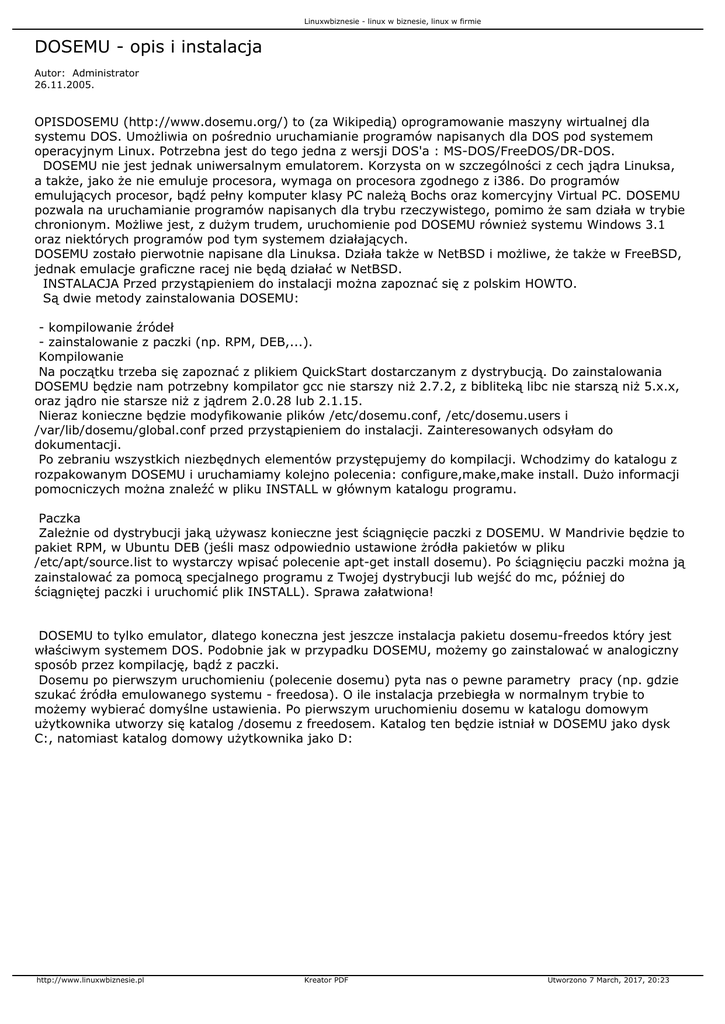 Linuxwbiznesie - linux w biznesie, linux w firmie DOSEMU - opis i instalacja Autor: Administrator 26.11.2005. OPISDOSEMU (http://www.dosemu.org/) to (za Wikipedią) oprogramowanie maszyny wirtualnej dla systemu DOS. Umożliwia on pośrednio uruchamianie programów napisanych dla DOS pod systemem operacyjnym Linux. Potrzebna jest do tego jedna z wersji DOS'a : MS-DOS/FreeDOS/DR-DOS. DOSEMU nie jest jednak uniwersalnym emulatorem. Korzysta on w szczególności z cech jądra Linuksa, a także, jako że nie emuluje procesora, wymaga on procesora zgodnego z i386. Do programów emulujących procesor, bądź pełny komputer klasy PC należą Bochs oraz komercyjny Virtual PC. DOSEMU pozwala na uruchamianie programów napisanych dla trybu rzeczywistego, pomimo że sam działa w trybie chronionym. Możliwe jest, z dużym trudem, uruchomienie pod DOSEMU również systemu Windows 3.1 oraz niektórych programów pod tym systemem działających. DOSEMU zostało pierwotnie napisane dla Linuksa. Działa także w NetBSD i możliwe, że także w FreeBSD, jednak emulacje graficzne racej nie będą działać w NetBSD. INSTALACJA Przed przystąpieniem do instalacji można zapoznać się z polskim HOWTO. Są dwie metody zainstalowania DOSEMU: - kompilowanie źródeł - zainstalowanie z paczki (np. RPM, DEB,...). Kompilowanie Na początku trzeba się zapoznać z plikiem QuickStart dostarczanym z dystrybucją. Do zainstalowania DOSEMU będzie nam potrzebny kompilator gcc nie starszy niż 2.7.2, z bibliteką libc nie starszą niż 5.x.x, oraz jądro nie starsze niż z jądrem 2.0.28 lub 2.1.15. Nieraz konieczne będzie modyfikowanie plików /etc/dosemu.conf, /etc/dosemu.users i /var/lib/dosemu/global.conf przed przystąpieniem do instalacji. Zainteresowanych odsyłam do dokumentacji. Po zebraniu wszystkich niezbędnych elementów przystępujemy do kompilacji. Wchodzimy do katalogu z rozpakowanym DOSEMU i uruchamiamy kolejno polecenia: configure,make,make install. Dużo informacji pomocniczych można znaleźć w pliku INSTALL w głównym katalogu programu. Paczka Zależnie od dystrybucji jaką używasz konieczne jest ściągnięcie paczki z DOSEMU. W Mandrivie będzie to pakiet RPM, w Ubuntu DEB (jeśli masz odpowiednio ustawione żródła pakietów w pliku /etc/apt/source.list to wystarczy wpisać polecenie apt-get install dosemu). Po ściągnięciu paczki można ją zainstalować za pomocą specjalnego programu z Twojej dystrybucji lub wejść do mc, później do ściągniętej paczki i uruchomić plik INSTALL). Sprawa załatwiona! DOSEMU to tylko emulator, dlatego koneczna jest jeszcze instalacja pakietu dosemu-freedos który jest właściwym systemem DOS. Podobnie jak w przypadku DOSEMU, możemy go zainstalować w analogiczny sposób przez kompilację, bądź z paczki. Dosemu po pierwszym uruchomieniu (polecenie dosemu) pyta nas o pewne parametry pracy (np. gdzie szukać źródła emulowanego systemu - freedosa). O ile instalacja przebiegła w normalnym trybie to możemy wybierać domyślne ustawienia. Po pierwszym uruchomieniu dosemu w katalogu domowym użytkownika utworzy się katalog /dosemu z freedosem. Katalog ten będzie istniał w DOSEMU jako dysk C:, natomiast katalog domowy użytkownika jako D: http://www.linuxwbiznesie.pl Kreator PDF Utworzono 7 March, 2017, 20:23