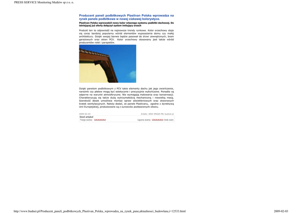 PRESS SERVICE Monitoring Mediów sp z o. o. Producent paneli podbitkowych Plastivan Polska wprowadza na rynek panele podbitkowe w nowej ciekawej kolorystyce. Plastivan Polska wprowadził nowy kolor własnego systemu podbitki dachowej. Do istniejącej już oferty dołączył system imitujący orzech Produkt ten to odpowiedź na najnowsze trendy rynkowe. Kolor orzechowy staje się coraz bardziej popularny wśród elementów wyposażenia domu czy małej architektury. Dzięki swojej barwie będzie pasował do drzwi zewnętrznych, bram garażowych oraz okien PCV. Kolor orzechowy stosowany jest także wśród producentów rolet i parapetów. Dzięki panelom podbitkowym z PCV takie elementy dachu jak jego zwieńczenie, narożnik czy płatew mogą być estetycznie i precyzyjnie wykończone. Ponadto są odporne na warunki atmosferyczne. Nie wymagają malowania oraz konserwacji. Charakteryzują się także dużą wytrzymałością mechaniczną i niewielką masą. Szerokość desek umożliwia montaż opraw oświetleniowych oraz otworowych kratek wentylacyjnych. Należy dodać, że panele Plastivanu, zgodne z dyrektywą Unii Europejskiej, produkowane są z surowców pozbawionych ołowiu. 2009-02-03 Oceń artykuł Twoja ocena: Zródło: ARW IMAGE PR/ budnet.pl Łączna ocena: brak ocen http://www.budnet.pl/Producent_paneli_podbitkowych_Plastivan_Polska_wprowadza_na_rynek_pane,aktualnosci_budowlane,i=12533.html 2009-02-03