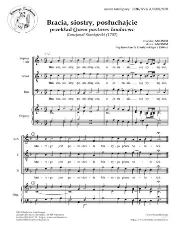 numer katalogowy: 382b/XVI/A/0202/STB Bracia, siostry, posłuchajcie przekład Quem pastores laudavere Kancjonał Staniątecki (1707) muzyka: ANONIM słowa: ANONIM (wg Kancjonału Staniąteckiego z 1586 r.) 3 œ ˙ &b 2 œ œ ˙ ˙ œ ˙ Sopran / Alt ˙ œ œ œ œ œ œ œ œ ˙ œ œ Bra - cia, sio - stry, po - słu - chaj - cie, o 3 œ œ ˙ ˙ œ œ ˙ ˙ b V 2 Tenor ˙ ˙ Bra - cia, sio - stry, po - słu - chaj - cie, Bas o Org. œ &b ˙ œ ˙ Vb ˙ œ ˙ ?b ˙ œ ˙ jest œ po - ro - dzi - ła któ - re - go jest po - ro - dzi - ła & b ˙w œ ˙ . ?b ˙ œ ˙ 5 Je - zu - sie taj - cie, ˙ œ œ œ œ œ œ œ œ œ n œ œœ œœ ˙˙ .. w. ˙. ˙ œ œ œ œ œ ˙œ ˙. œ któ - re - go B się py - œ œ œ œ nœ œ œ ˙ œ & b 32 œ œ ˙ ˙ œœ œœ w˙ ˙ w. ˙˙ ˙ ˙ w ? b 32 ˙ w ˙ któ - re - go T taj - cie, ˙ œ œ œ œ œ œ œ 5 S/A się py - ? b 32 œ œ ˙ ˙ œ œ ˙ ˙ Bra - cia, sio - stry, po - słu - chaj - cie, Organy Je - zu - sie jest œ œ œ 2009 © Federacja Caecilianum Zarząd Główny: ul. Dewajtis 3 , 01-815 Warszawa tel./fax: (22) 561 01 38 , http://www.caecilianum.eu mailto: [email protected] ˙ œ ˙ œ ˙ œ ˙ œ ˙ œ ˙ po - ro - dzi - ła ˙ œ ˙ w. ˙˙ . œ ˙ ˙. œ œ œ o ˙ Je - zu - sie œ œ œ się py - œ œ œ œ Ma - ry - ja przez bo ˙ œ œ œ - œ ˙ Ma - ry - ja przez bo ˙ œ œ œ ˙. œ œ œ ˙ œ œ - - taj - cie, U ˙. ści. œ U̇. le - ści. œ œ œ œ U̇. Ma - ry - ja przez bo ˙. ˙ le ˙ œ - le - œœ œ˙ œ œ œ ści. U ˙. ˙. œ œ œ œ U̇. Do uŜytku publicznego http://www.biblioteka.caecilianum.eu Bracia, siostry, posłuchajcie - ANONIM 1. Bracia, siostry, posłuchajcie, O Jezusie się pytajcie, Którego jest porodziła Maryja przez boleści. 2. Trze Królowie przyjechali, Jemu cześć i chwałę dali. Przynieśli mu dary za to: Mirrę, kadzidło, złoto. 3. Weselmy się dziś z Maryją, IŜ nam dała światłość wieczną Narodzenim Syna BoŜego, Jen nas zbawił wszego złego. 4. Jezu, królu narodzony, Od Boga Ojca zesłany, Tobie cześć i chwałę dawamy, Racz się zmiłować nad nami. -2- http://www.biblioteka.caecilianum.eu
