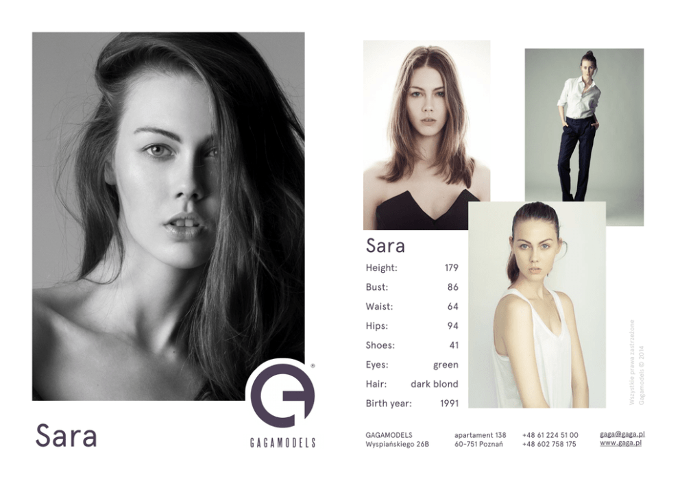 Height: 179 Bust: 86 Waist: 64 Hips: 94 Shoes: 41 Eyes: green Hair: dark blond Birth year: Sara GAGAMODELS Wyspiańskiego 26B Wszystkie prawa zastrzeżone Gagamodels © 2014 Sara 1991 apartament 138 60-751 Poznań +48 61 224 51 00 +48 602 758 175 [email protected] www.gaga.pl