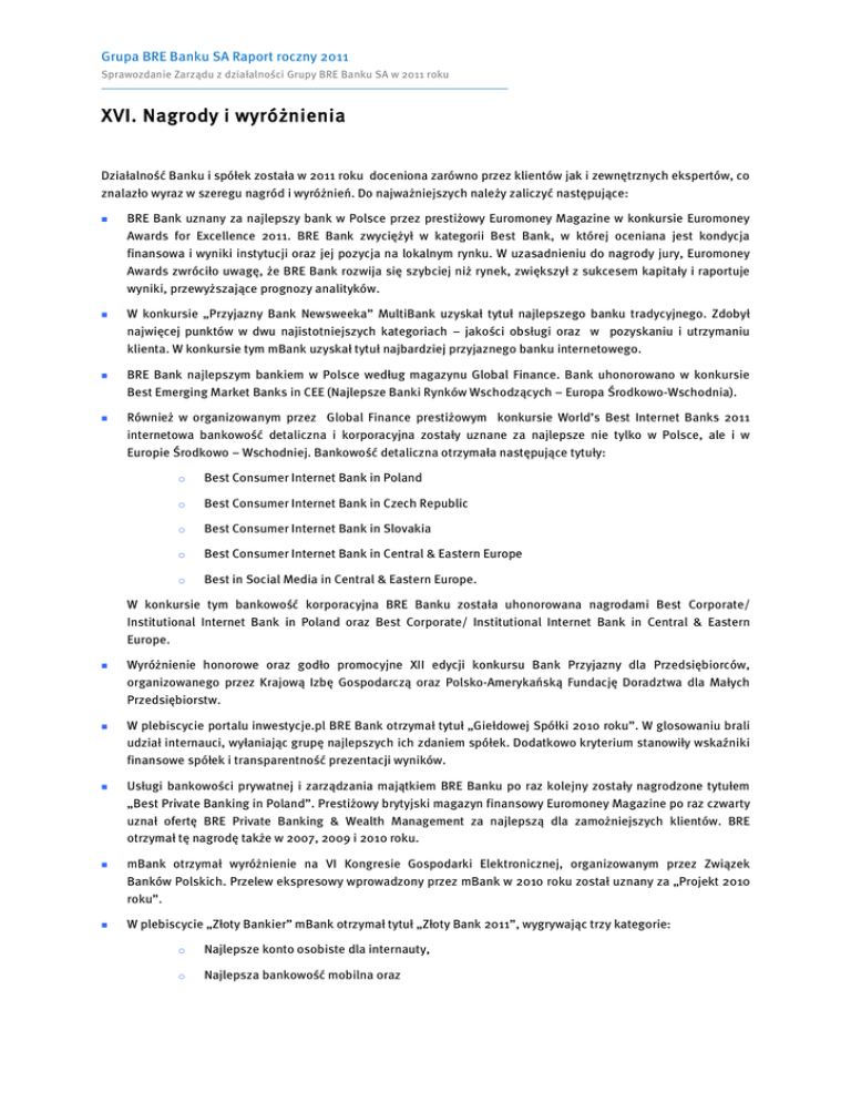 Grupa BRE Banku SA Raport roczny 2011 Sprawozdanie Zarządu z działalności Grupy BRE Banku SA w 2011 roku XVI. Nagrody i wyróżnienia Działalność Banku i spółek została w 2011 roku doceniona zarówno przez klientów jak i zewnętrznych ekspertów, co znalazło wyraz w szeregu nagród i wyróżnień. Do najważniejszych należy zaliczyć następujące: BRE Bank uznany za najlepszy bank w Polsce przez prestiżowy Euromoney Magazine w konkursie Euromoney Awards for Excellence 2011. BRE Bank zwyciężył w kategorii Best Bank, w której oceniana jest kondycja finansowa i wyniki instytucji oraz jej pozycja na lokalnym rynku. W uzasadnieniu do nagrody jury, Euromoney Awards zwróciło uwagę, że BRE Bank rozwija się szybciej niż rynek, zwiększył z sukcesem kapitały i raportuje wyniki, przewyższające prognozy analityków. W konkursie „Przyjazny Bank Newsweeka” MultiBank uzyskał tytuł najlepszego banku tradycyjnego. Zdobył najwięcej punktów w dwu najistotniejszych kategoriach – jakości obsługi oraz w pozyskaniu i utrzymaniu klienta. W konkursie tym mBank uzyskał tytuł najbardziej przyjaznego banku internetowego. BRE Bank najlepszym bankiem w Polsce według magazynu Global Finance. Bank uhonorowano w konkursie Best Emerging Market Banks in CEE (Najlepsze Banki Rynków Wschodzących – Europa Środkowo-Wschodnia). Również w organizowanym przez Global Finance prestiżowym konkursie World’s Best Internet Banks 2011 internetowa bankowość detaliczna i korporacyjna zostały uznane za najlepsze nie tylko w Polsce, ale i w Europie Środkowo – Wschodniej. Bankowość detaliczna otrzymała następujące tytuły: o Best Consumer Internet Bank in Poland o Best Consumer Internet Bank in Czech Republic o Best Consumer Internet Bank in Slovakia o Best Consumer Internet Bank in Central & Eastern Europe o Best in Social Media in Central & Eastern Europe. W konkursie tym bankowość korporacyjna BRE Banku została uhonorowana nagrodami Best Corporate/ Institutional Internet Bank in Poland oraz Best Corporate/ Institutional Internet Bank in Central & Eastern Europe. Wyróżnienie honorowe oraz godło promocyjne XII edycji konkursu Bank Przyjazny dla Przedsiębiorców, organizowanego przez Krajową Izbę Gospodarczą oraz Polsko-Amerykańską Fundację Doradztwa dla Małych Przedsiębiorstw. W plebiscycie portalu inwestycje.pl BRE Bank otrzymał tytuł „Giełdowej Spółki 2010 roku”. W glosowaniu brali udział internauci, wyłaniając grupę najlepszych ich zdaniem spółek. Dodatkowo kryterium stanowiły wskaźniki finansowe spółek i transparentność prezentacji wyników. Usługi bankowości prywatnej i zarządzania majątkiem BRE Banku po raz kolejny zostały nagrodzone tytułem „Best Private Banking in Poland”. Prestiżowy brytyjski magazyn finansowy Euromoney Magazine po raz czwarty uznał ofertę BRE Private Banking & Wealth Management za najlepszą dla zamożniejszych klientów. BRE otrzymał tę nagrodę także w 2007, 2009 i 2010 roku. mBank otrzymał wyróżnienie na VI Kongresie Gospodarki Elektronicznej, organizowanym przez Związek Banków Polskich. Przelew ekspresowy wprowadzony przez mBank w 2010 roku został uznany za „Projekt 2010 roku”. W plebiscycie „Złoty Bankier” mBank otrzymał tytuł „Złoty Bank 2011”, wygrywając trzy kategorie: o Najlepsze konto osobiste dla internauty, o Najlepsza bankowość mobilna oraz Grupa BRE Banku SA Raport roczny 2011 Sprawozdanie Zarządu z działalności Grupy BRE Banku SA w 2011 roku o Najlepsze konto firmowe dla przedsiębiorcy. Raport roczny Grupy BRE Banku otrzymał nagrodę „The Best of the Best” w konkursie organizowanym przez Instytut Rachunkowości i Podatków (IRiP) dla najlepszego banku, który w ostatnich latach trzy razy zajmował pierwsze miejsce w konkursie. Ernest Pytlarczyk i Marcin Mazurek zwyciężyli w prestiżowym konkursie na najlepszych analityków makroekonomicznych roku, organizowanym przez Narodowy Bank Polski. Oprócz zwycięstwa w kategorii głównej, zespół analityków BRE Banku zajął pierwsze miejsca w kategoriach "inflacja" i "bilans płatniczy" i trzecie w kategorii "PKB". Konkurs organizowany przez NBP obejmował prognozy na rok 2010. Wzięło w nim udział 34 analityków i zespołów analitycznych. W dziesiątym rankingu analityków giełdowych przygotowywanym przez Gazetę Giełdy Parkiet, analitycy Domu Inwestycyjnego BRE Banku zajęli, podobnie jak w ubiegłych latach, pierwsze miejsce. BRE Bank znalazł się w gronie najlepszych pracodawców w rankingu TOP 100 Idealny Pracodawca 2011 przygotowanym na podstawie ankiet przeprowadzonych wśród studentów. Grupa BRE Banku została wyróżniona w rankingu dotyczącym najbardziej pożądanych pracodawców, opracowanym przez Antal International, międzynarodową firmę specjalizującą się w rekrutacji specjalistów i menedżerów średniego i wyższego szczebla z różnych sektorów rynku.