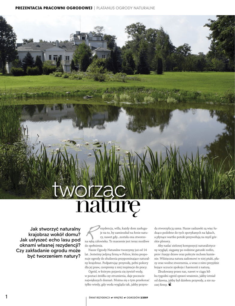 prezentacja pracowni ogrodowej | platanus ogrody naturalne tworząc naturę Jak stworzyć naturalny krajobraz wokół domu? Jak usłyszeć echo lasu pod oknami własnej rezydencji? Czy zakładanie ogrodu może być tworzeniem natury? 1 R ezydencja, willa, każdy dom zasługuje na to, by zamieszkał na łonie natury, nawet gdy...została ona stworzona ręką człowieka. To marzenie jest teraz możliwe do spełnienia. Nasze Ogrody Naturalne tworzymy już od 14 lat. Jesteśmy jedyną firmą w Polsce, która proponuje ogrody do złudzenia przypominające naturalny krajobraz. Podpatrując przyrodę, pełni pokory dla jej praw, czerpiemy z niej inspiracje do pracy. Ogród, w którym pojawia się żywioł wody, w postaci źródła czy strumienia, daje poczucie największych doznań. Można się o tym przekonać tylko wtedy, gdy woda wygląda tak, jakby przyro- ŚWIAT REZYDENCJI u WNĘTRZ u OGRODÓW 2/2009 da stworzyła ją sama. Nasze sadzawki są więc łudząco podobne do tych spotykanych na łąkach, a płynące wartko potoki przywołują na myśl górskie plenery. Aby nadać zielonej kompozycji naturalistyczny wygląd, sięgamy po rodzime gatunki roślin, pnie i karpy drzew oraz pokryte mchem kamienie. Wdzięczna natura zadomowi w niej ptaki, płazy oraz wodne stworzenia, a wraz z nimi przyjdzie kojące uczucie spokoju i harmonii z naturą. Zbudowany przez nas, nawet w ciągu kilku tygodni ogród sprawi wrażenie, jakby istniał od dawna, jakby był dziełem przyrody, a nie naszej firmy. q arch. krajobrazu Przemysław Sochański PLATANUS OGRODY NATURALNE ® arch. krajobrazu Przemysław Sochański 05-503 Głosków, ul. Milenium 35 tel. kom. 0 603 533 511 e‑mail: [email protected] www.ogrodynaturalne.pl ŚWIAT REZYDENCJI u WNĘTRZ u OGRODÓW 2/2009 2