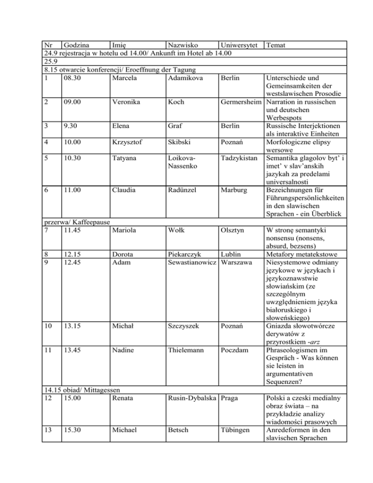 Nr Godzina Imię Nazwisko Uniwersytet 24.9 rejestracja w hotelu od 14.00/ Ankunft im Hotel ab 14.00 25.9 8.15 otwarcie konferencji/ Eroeffnung der Tagung 1 08.30 Marcela Adamikova Berlin 2 09.00 Veronika Koch 3 9.30 Elena Graf 4 10.00 Krzysztof Skibski 5 10.30 Tatyana LoikovaNassenko 6 11.00 Claudia Radünzel Unterschiede und Gemeinsamkeiten der westslawischen Prosodie Germersheim Narration in russischen und deutschen Werbespots Berlin Russische Interjektionen als interaktive Einheiten Poznań Morfologiczne elipsy wersowe Tadzykistan Semantika glagolov byt’ i imet’ v slav’anskih jazykah za predelami universalnosti Marburg Bezeichnungen für Führungspersönlichkeiten in den slawischen Sprachen - ein Überblick przerwa/ Kaffeepause 7 11.45 Mariola Wołk 8 9 12.15 12.45 Dorota Adam Piekarczyk Lublin Sewastianowicz Warszawa 10 13.15 Michał Szczyszek Poznań 11 13.45 Nadine Thielemann Poczdam Olsztyn 14.15 obiad/ Mittagessen 12 15.00 Renata Rusin-Dybalska Praga 13 Betsch 15.30 Michael Temat Tübingen W stronę semantyki nonsensu (nonsens, absurd, bezsens) Metafory metatekstowe Niesystemowe odmiany językowe w językach i językoznawstwie słowiańskim (ze szczególnym uwzględnieniem języka białoruskiego i słoweńskiego) Gniazda słowotwórcze derywatów z przyrostkiem -arz Phraseologismen im Gespräch - Was können sie leisten in argumentativen Sequenzen? Polski a czeski medialny obraz świata – na przykładzie analizy wiadomości prasowych Anredeformen in den slavischen Sprachen 14 16.00 Anna Jakubowska Warszawa Głupota we frazeologii polskiej, czeskiej i górnołużyckiej 15 16.30 Marek Łaziński Warszawa Czy Murzyn znaczy Czarny? Konotacje nazw przynależności grupowej w polszczyźnie 16 17.00 Jakob Fruchtmann Germersheim Statistische Analyse in der Computerlinguistik 17 17.30 Elżbieta WierzbickaWarszawa Pragmatyczna Piotrowska klasyfikacja leksemów na części mowy 18.00 wycieczka po Zamościu, kolacja/ Rungang in Zamość, Abendessen 26.9 18 08.15 Natalija Vus Lwów Środki modalne w tekstach reklamy (analiza funkcjonalna i semantyczna) 19 08.45 Jan Hajduk Lublin Czy kury są zwierzętami? O granicach kategorii kognitywnej 20 09.15 Rafał Zimny Bydgoszcz Stereotypy stulatków w tekstach doniesień prasowych 21 9.45 Magdalena Horodeńska Warszawa Symetryczność pod względem płci w polszczyźnie na materiale leksykalnym USJP (2003) 22 10.15 Svetlana Terekhova Kijów Ways of expressing of indications in Ukrainian comparing with Russian and English 23 10.45 Panasiuk Jolanta Lublin Zaburzenia czytania i pisania u chorych z afazją w perspektywie komunikacyjnej 11.15-11.30 przerwa/ Kaffeepause 24 11.30 Alla Krawczuk Lwów Jakiej polskiej skladni uczyć Ukraincow? (glottodydaktyka a zróżnicowanie normy)" 25 12.00 Lesia Korol Lwów Szkolnictwo jezyka polskiego we Lwowie 26 12.30 Saska Stumberger Lublana Zweisprachigkeit bei den Slowenen in Deutschland. 27 13.00 Elżbieta Kaczmarska Warszawa Kreowanie wizerunku po polsku i czesku, czyli rzecz o języku public 28 13.30 Vladislava 14.00 obiad/ Mittagesssen 29 15.00 Dorota Zhdanova relation Germersheim Russkij jazyk diaspory i ego lingvisticheskij status Filar Lublin 30 15.30 Katarzyna DróżdżŁuszczyk Warszawa 31 16.00 Bernhard Brehmer Tübingen 32 16.30 Marta Falkowska Warszawa 17.00-17.15 przerwa/ Kaffeepause 33 17.15 Paweł Nowak Lublin 34 17.45 Svetlana Poljakova Frankfurt 35 18.15 Olexandr Motornyy Lwów 36 18.45 Martina Smejkalova Praga 19.15-19.30 przerwa/ Pause, 19.30 zebranie plenarne/ Plenum 20.30 uroczysta kolacja 27.9 37 08.15 Danuta Kępa-Figura Lublin 38 08.45 Izabela Domaciuk Lublin 39 09.15 Monika Szewczyk Warszawa 40 09.45 Jan Zgrzywa Poznań Językowy obraz snu w polszczyźnie (w słownikach i wtekstach) Rozwój semantyczny wyrazów tolerancja i tolerować. Wstęp do ornitolingwistyki kontrastywnej: Motywacja semantyczna nazw ptaków w języku polskim i niemieckim. Pole leksykalne 'winy' we współczesnej polszczyźnie (wstępny ogląd leksemów i relacji semantycznych Skrypty komunikacyjne w informacjach medialnych Partikeln und Konnektoren Frazeologizmy języka łużyckiego z komponentem-części ciała zwierząt Vyvoj pojetilingvistickeho uciva ve starsich skolskych mluvnicich cestiny (1918 - 1945) Gry językowe w komunikacji przez Internet Nekrolog jako gatunek prasowy Polszczyzna internetowa czy polszczyzna w Internecie? Porównanie - klucz do tekstu 41 10.15 Joanna Rabiega Warszawa 42 11.15 Marzena Stępień Warszawa 11.15-11.30 przerwa/ Kaffeepause 43 11.30 Radosław Guz Lublin 44 12.00 Julia Dilna Lwów 45 12.30 Monika Bednarczuk Lublin 46 13.00 Edyta Migałka Lublin 47 13.30 Magdalena Piechota Lublin 48 14.00 Mariusz Migałka Lublin 14.30 zamknięcie konferencji, obiad/ Konferenzschliessung, Mittagessen O eksperymentach nad produktywnością Mówienie i prawda. O czasownikach twierdzić i oświadczać Intencje nadawców i odbiorców w nauczaniu zdalnym a fortunność komunikacji Frazeologia w utworach Malgorzaty Musierowicz Polskie świadectwa fascynacji faszyzmem w Dwudziestoleciu ideologia a język Świat przemocy w tekstach wiadomości radiowych Żargon w reportażach prasowych na przykładzie tygodnika „Polityka” Rola maski w relacji nadawczo-odbiorczej na przykładzie prasy muzycznej