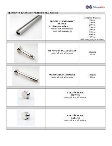 ELEMENTY KARNISZY PERFECT ALU-NIKIEL PROFIL ALUMINIOWY Ø 20mm · dostępne kolory: chrom mat, szampański, inox stal nierdzewna Dostępne długości: 120cm 150cm 200cm 250cm 300cm 350cm 400cm 450cm 600cm w jednym odcinku WSPORNIK POJEDYNCZY materiał: stal niklowana Długość 11cm WSPORNIK PODWÓJNY materiał: stal niklowana Długość 16cm ZAKOŃCZENIE BOSTON materiał: stal niklowana ZAKOŃCZENIE DALLAS materiał: stal niklowana ELEMENTY KARNISZY PERFECT ALU-NIKIEL ZAKOŃCZENIE VEGAS materiał: stal niklowana ŁĄCZNIK KARNISZA ALUMINIOWEGO materiał: mosiądz WKRĘT DOCISKOWY M 4 x 4mm materiał: stal nierdzewna WKRĘT DOCISKOWY M 4 x 6mm materiał: stal nierdzewna KLUCZ IMBUSOWY NOŚNIK SUFITOWY POJEDYNCZY materiał: aluminium anodowane w kolorze chrom mat NOŚNIK SUFITOWY PODWÓJNY materiał: aluminium anodowane w kolorze chrom mat HACZYK Z ROLKĄ materiał: tworzywo sztuczne ŻABKA OBROTOWA BEZBARWNA materiał: tworzywo sztuczne