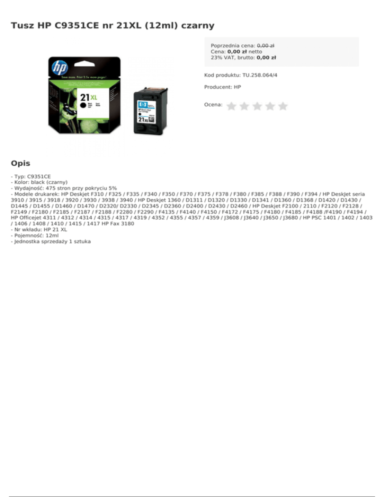 Tusz HP C9351CE nr 21XL (12ml) czarny Poprzednia cena: 0,00 zł Cena: 0,00 zł netto 23% VAT, brutto: 0,00 zł Kod produktu: TU.258.064/4 Producent: HP Ocena: Opis - Typ: C9351CE - Kolor: black (czarny) - Wydajność: 475 stron przy pokryciu 5% - Modele drukarek: HP Deskjet F310 / F325 / F335 / F340 / F350 / F370 / F375 / F378 / F380 / F385 / F388 / F390 / F394 / HP DeskJet seria 3910 / 3915 / 3918 / 3920 / 3930 / 3938 / 3940 / HP Deskjet 1360 / D1311 / D1320 / D1330 / D1341 / D1360 / D1368 / D1420 / D1430 / D1445 / D1455 / D1460 / D1470 / D2320/ D2330 / D2345 / D2360 / D2400 / D2430 / D2460 / HP Deskjet F2100 / 2110 / F2120 / F2128 / F2149 / F2180 / F2185 / F2187 / F2188 / F2280 / F2290 / F4135 / F4140 / F4150 / F4172 / F4175 / F4180 / F4185 / F4188 /F4190 / F4194 / HP Officejet 4311 / 4312 / 4314 / 4315 / 4317 / 4319 / 4352 / 4355 / 4357 / 4359 / J3608 / J3640 / J3650 / J3680 / HP PSC 1401 / 1402 / 1403 / 1406 / 1408 / 1410 / 1415 / 1417 HP Fax 3180 - Nr wkładu: HP 21 XL - Pojemność: 12ml - Jednostka sprzedaży 1 sztuka Powered by TCPDF (www.tcpdf.org)