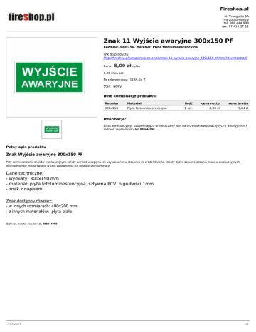 Fireshop.pl ul. Traugutta 9A 49-200 Grodków tel: 888 444 998 fax: 77 415 37 11 Znak 11 Wyjście awaryjne 300x150 PF Rozmiar: 300x150, Materiał: Płyta fotoluminescencyjna, link do produktu: http://fireshop.pl/uzupelniajace-ewak/znak-11-wyjscie-awaryjne-300x150-pf.html?download.pdf Cena: 8,00 zł netto 8,00 zł za szt. Nr referencyjny: 1135-04 Z Stan: Nowy Inne kombinacje produktu: Rozmiar Materiał ilość cena netto cena brutto 300x150 Płyta fotoluminescencyjna 1 szt. 8,00 zł 9,84 zł Informacje: Znak ewakuacyjny, uzupełniającu umieszczany jest na drzwiach ewakuacyjnych ( awaryjnych ) Zadzwoń, zapytaj doradcy tel. 888444998 Pełny opis produktu Znak Wyjście awaryjne 300x150 PF Przy rozmieszczaniu znaków ewakuacyjnych należy zwrócić uwagę na ich usytuowanie w stosunku do źródeł światła. Należy dążyć do umieszczania znaków ewakuacyjnych możliwie blisko źródła światła w celu zapewnienia ich dostatecznej luminacji. Dane techniczne: - wymiary: 300x150 mm - materiał: płyta fotoluminestencyjna, sztywna PCV o grubości 1mm - znak z napisem Znak dostępny również: - w innych rozmiarach: 400x200 mm - z innych materiałów: płyta biała Zadzwoń, zapytaj doradcy tel. 888444998 7-03-2017 1/1