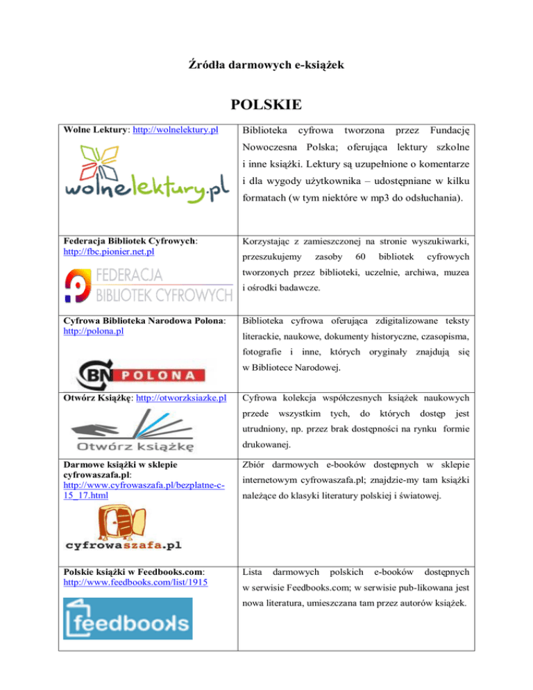 Źródła darmowych e-książek POLSKIE Wolne Lektury: http://wolnelektury.pl Biblioteka cyfrowa tworzona przez Fundację Nowoczesna Polska; oferująca lektury szkolne i inne książki. Lektury są uzupełnione o komentarze i dla wygody użytkownika – udostępniane w kilku formatach (w tym niektóre w mp3 do odsłuchania). Federacja Bibliotek Cyfrowych: http://fbc.pionier.net.pl Korzystając z zamieszczonej na stronie wyszukiwarki, przeszukujemy zasoby 60 bibliotek cyfrowych tworzonych przez biblioteki, uczelnie, archiwa, muzea i ośrodki badawcze. Cyfrowa Biblioteka Narodowa Polona: http://polona.pl Biblioteka cyfrowa oferująca zdigitalizowane teksty literackie, naukowe, dokumenty historyczne, czasopisma, fotografie i inne, których oryginały znajdują się w Bibliotece Narodowej. Otwórz Książkę: http://otworzksiazke.pl Cyfrowa kolekcja współczesnych książek naukowych przede wszystkim tych, do których dostęp jest utrudniony, np. przez brak dostępności na rynku formie drukowanej. Darmowe książki w sklepie cyfrowaszafa.pl: http://www.cyfrowaszafa.pl/bezplatne-c15_17.html Zbiór darmowych e-booków dostępnych w sklepie Polskie książki w Feedbooks.com: http://www.feedbooks.com/list/1915 Lista internetowym cyfrowaszafa.pl; znajdzie-my tam książki należące do klasyki literatury polskiej i światowej. darmowych polskich e-booków dostępnych w serwisie Feedbooks.com; w serwisie pub-likowana jest nowa literatura, umieszczana tam przez autorów książek. Zagraniczne Europeana: http://europeana.eu Jedna z największych kolekcji e-książek oraz innych cyfrowych materiałów pochodzących z europejskich bibliotek, muzeów, archiwów i innych. Wśród zasobów można znaleźć między innymi pamiętniki, czasopisma, listy i książki z całej Europy. Project Gutenberg: http://gutenberg.org Pierwszy w Internecie zbiór darmowych, pełnych e-booków. Znajdują się tu książki nieobjęte prawami autorskimi, a także materiały, których autorzy wyrazili zgodę na publikację. Darmowe książki w FeedBooks: http://www.feedbooks.com/publicdomain W serwisie publikowana jest nowa literatura, umieszczana tam przez autorów książek. Wiele z nich jest publikowanych za darmo. Google Books: http://books.google.com/books Projekt firmy Google, skupiający się na gromadzeniu książek i czasopism w formie cyfrowej. Na stronie znajduje się wygodny czytnik, umożliwiający przeglądanie książek w przeglądarce. Niektóre materiały dostępne są do ściągnięcia w formie pliku PDF. Open Library: http://openlibrary.org/ Internetowy katalog książek oraz e-książek. Strona zawiera informacje o ich lokalizacji w bibliotekach (głównie amerykańskich), a oprócz tego umożliwia przeglądanie, pobieranie i czytanie ebooków. Źródło: Bibliosfera.net