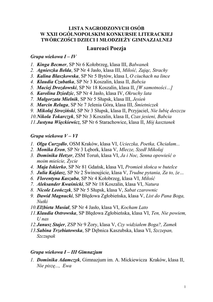 LISTA NAGRODZONYCH OSÓB W XXII OGÓLNOPOLSKIM KONKURSIE LITERACKIEJ TWÓRCZOŚCI DZIECI I MŁODZIEśY GIMNAZJALNEJ Laureaci Poezja Grupa wiekowa I – IV 1. Kinga Becmer, SP Nr 6 Kołobrzeg, klasa III, Bałwanek 2. Agnieszka Bełda, SP Nr 4 Jasło, klasa III, Miłość, Zając, Strachy 3. Kalina Błaszkowska, SP Nr 5 Bytów, klasa I, O ciuchach na lince 4. Klaudia Czubatka, SP Nr 3 Koszalin, klasa II, Babcia 5. Maciej Drozdowski, SP Nr 18 Koszalin, klasa II, [W samotności…] 6. Karolina Dziedzic, SP Nr 4 Jasło, klasa IV, Okruchy lata 7. Małgorzata Mielnik, SP Nr 5 Słupsk, klasa III, Jesień 8. Marcin Reluga, SP Nr 7 Jelenia Góra, klasa III, Śmietniczek 9. Mikołaj Stroziński, SP Nr 3 Słupsk, klasa II, Przyjaciel, Nie lubię deszczu 10.Nikola Tokarczyk, SP Nr 3 Koszalin, klasa II, Czas jesieni, Babcia 11.Justyna Więckiewicz, SP Nr 6 Starachowice, klasa II, Mój kasztanek Grupa wiekowa V – VI 1. Olga Curzydło, OSM Kraków, klasa VI, Ucieczka, Poetka, Chciałam... 2. Monika Eron, SP Nr 3 Lębork, klasa V, Mlecze, Szedł Mikołaj 3. Dominika Hetzer, ZSM Toruń, klasa VI, Ja i Noc, Senna opowieść o moim mieście, śycie 4. Maja Iskierko, SP Nr 81 Gdańsk, klasa VI, Promień słońca w butelce 5. Julia Kajdasz, SP Nr 2 Świnoujście, klasa V, Trudne pytania, Za to, Ŝe… 6. Florentyna Kaszuba, SP Nr 4 Kołobrzeg, klasa VI, Miłość 7. Aleksander Kwaśnicki, SP Nr 18 Koszalin, klasa VI, Natura 8. Nicole Leończyk, SP Nr 5 Słupsk, klasa V, Sabat czarownic 9. Dawid Magnucki, SP Błędowa Zgłobieńska, klasa V, List do Pana Boga, Nutki 10.ElŜbieta Musiał, SP Nr 4 Jasło, klasa VI, Kocham Lato 11.Klaudia Ostrowska, SP Błędowa Zgłobieńska, klasa VI, Ten, Nie powiem, U nas 12.Janusz Stajer, ZSP Nr 9 śory, klasa V, Czy widziałem Boga?, Zamek 13.Sabina Trzebiatowska, SP Dębnica Kaszubska, klasa VI, Szczepan, Szczupak Grupa wiekowa I – III Gimnazjum 1. Dominika Adamczyk, Gimnazjum im. A. Mickiewicza Kraków, klasa II, Nie piszę..., Ewa 1 2. Paulina Gierchard, Gimnazjum Podedwórze, klasa III, Pozwólmy, Koperta 3. Aleksandra Grzegory, Gimnazjum Publiczne Nowe Zduny, klasa III, Moja muza 4. Marta Kapała, Gimnazjum Nr 18 Częstochowa, klasa III, Malarz, Manekiny, Nieznajoma 5. Magdalena Kołeczek, Gimnazjum Nr 1 Sandomierz, klasa II, Deszcz 6. Anna Korzeniewska, Gimnazjum Nr 2 Słupsk, klasa II, Ból serca 7. Katarzyna Kornek, Gimnazjum Publiczne Lądek Zdrój, klasa II, Ślubny portret 8. Adam Kowalczyk, Szczytno, [Wyobraź sobie…], [Złamany człowiek…] 9. Karolina Masełkowska, Gimnazjum Nr 2 Słupsk, klasa I, Modlitwa, Wiatr 10.Agnieszka Mielcarek, Gimnazjum Nr 6 Koszalin, klasa III, Sen o wieczorze w międzywojennej kafejce…, Przyszedł 11.Anna Orendorz, Gimnazjum Brynek, klasa III, [Niebieskie na górze…], Pytanie 12.Izabela Solarz, Gimnazjum Publiczne Lądek Zdrój, klasa II, Samotne drzewo 13.Natalia Szkurłat, Gimnazjum Nr 2 Słupsk, klasa II, Tylko dla Ciebie 14.Marta Wierzbicka, Gimnazjum Stopnica, klasa III, Ojcze, Jesteś 15.Joanna Wilkans, ZSM gimnazjum Toruń, klasa II, [I tańczymy…], [Modlitwa…] 16.Julian Wypasek, Gimnazjum Nr 1 Polkowice, Moja Poezja WyróŜnienia Poezja Grupa wiekowa I – IV 1. Weronika Andzel, SP Nr 81 Gdańsk, klasa IV, Schody 2. Monika Bojarska, SP Nr 3 Krasnystaw, klasa IV, Najświętsza Rodzina 3. Patrycja Ciepłuch, SP Nr 5 Bytów, klasa II, O jajku 4. Nadia Dutkiewicz, SP Nr 3 Koszalin, klasa II, Babcia 5. Michalina Filimoniak, SP Nr 3 Słupsk, klasa I, Zima 6. Dawid Gardzielewski, SP Łupawa, klasa I, Wiosna 7. Jakub Hesse, SP Nr 4 Kołobrzeg, klasa III, Morze 8. Anna KałuŜyńska, Prywatna SP „Liber” Gdynia, klasa III, Miód 9. Monika Kucharska, SP Nr 1 Wyszków, klasa III, Pingwin 10.Kamil Kujawa, SP Nr 7 Jelenia Góra, klasa III, Drzewa jesienną porą 11.Bartosz Lindstedt, SP Nr 9 Słupsk, klasa II, Wiosna 12.Mateusz Mojsak, Przedszkole Nr 29 „Fantazja” Białystok, lat 6, Pan Bóg 13.Wojciech Musiał, SP Nr 3 Słupsk, klasa III, Dzikie zwierzę 14.Kuba Nazarewicz, SP Nr 4 Kołobrzeg, klasa IV, Babcia 15.Anna Maria Perkowska, SP Białystok, klasa III, Tęczowy miś, Na łące, 2 16.Aleksandra Poźniak, SP Nr 9 Słupsk, klasa II, ŚnieŜynka 17.Natalia Rodziewicz, SP Nr 3 Słupsk, klasa III, Deszczowa olimpiada, Marzenia aniołka 18.Monika Róg, SP Nr 4 Jasło, klasa IV, Spóźniony taniec 19.Kacper Saweryn, SP Nr 3 Słupsk, klasa III, Odbicie 20.Karolina Szyca, SP Nr 2 Miastko, klasa III, Zapach wiosny 21.Katarzyna Świątek, SP Nr 143 Łódź, klasa IV, KsiąŜka 22.Agata Skrzypalik, SP Nr 8 Lębork, klasa III, Mój brat 23.Joanna Toczyńska, SP Łupawa, klasa I, Bo to juŜ wiosna 24.Kinga Tomicka, SP Nr 9 Słupsk, klasa II, Mama 25.Justyna Wojczuk, SP Nr 3 Słupsk, klasa III, [Z bliska…] 26.Anna Wronowska, SP Paszki DuŜe, klasa IV, Mój dom 27.Karolina Zięba, SP Nr 6 Starachowice, klasa II, Zięba Grupa wiekowa V – VI 1. Iwona Aleksandrowicz, SP Nr 3 Myślenice, klasa V, Janowi Pawłowi II 2. Łukasz Ceremus, SP Nr 5 Słupsk, klasa VI, To słowo, Przyjaźń 3. Florentyna Kaszuba, SP Nr 4 Kołobrzeg, klasa VI, [śycie jak ptak…], [Toczy się Ŝycie…] 4. Aleksandra Kryger, SP Biała Błota, klasa VI, [Świat…] 5. Michał Lubański, SP Izabelin, klasa VI, JeŜ, Idzie wiosna 6. Aleksandra Sandułow, SP Nr 18 Koszalin, klasa V, Radość i smutek 7. Patrycja Serkowska, SP Cewice, klasa V, Moja Ojczyzna 8. Monika Smętkowska, SP Nr 139 Warszawa, klasa VI, Taniec Natury 9. Rafał Szczypek, SP Nr 139 Warszawa, klasa V, Pusty hotel 10.Karolina Tabała, SP Kobylnica, klasa VI, Czym jest miłość od pierwszego wejrzenia? 11.Michalina Wytrykowska, SP Nr 18 Koszalin, klasa V, [Las…] 12.Filip Zaszewski, SP Nr 4 Kołobrzeg, klasa V, Maj Grupa wiekowa I – III Gimnazjum 1. Kamila Bracha, Gimnazjum Nr 23 Kielce, klasa II, Zwyczajny wiersz o jesieni 2. Agata Czerchawska, Gimnazjum Nr 2 Słupsk, klasa I, Nostalgia 3. Justyna Gacek, Gimnazjum Nr 2 Myślenice, klasa II, Ja?, Było… 4. Klaudia Glińska, Gimn