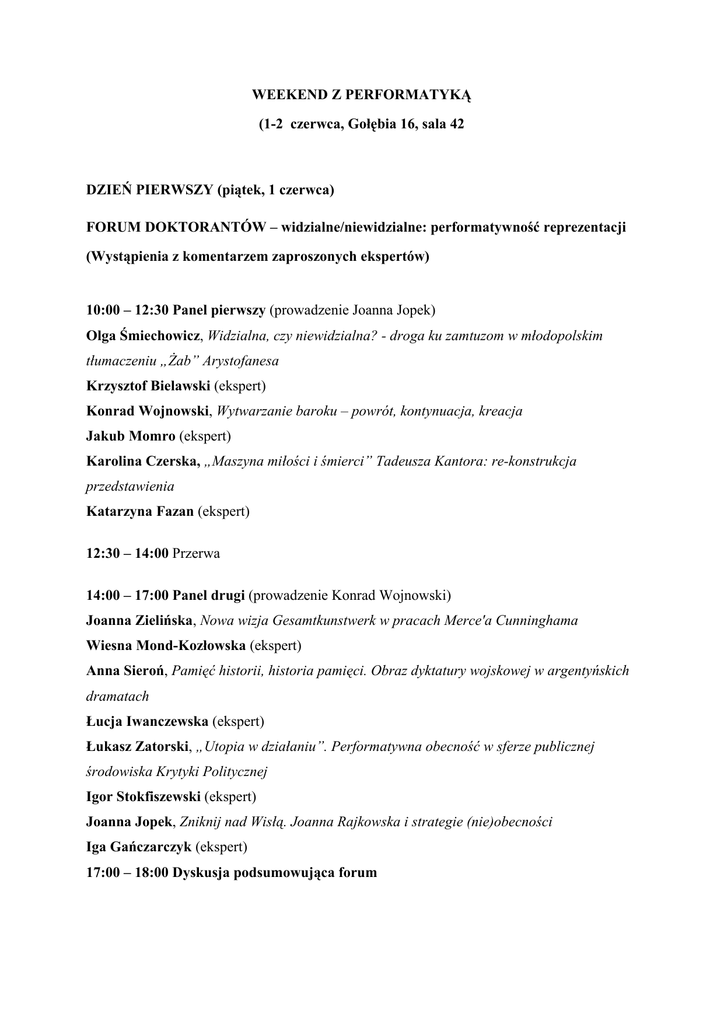 WEEKEND Z PERFORMATYKĄ (1-2 czerwca, Gołębia 16, sala 42 DZIEŃ PIERWSZY (piątek, 1 czerwca) FORUM DOKTORANTÓW – widzialne/niewidzialne: performatywność reprezentacji (Wystąpienia z komentarzem zaproszonych ekspertów) 10:00 – 12:30 Panel pierwszy (prowadzenie Joanna Jopek) Olga Śmiechowicz, Widzialna, czy niewidzialna? - droga ku zamtuzom w młodopolskim tłumaczeniu „Żab” Arystofanesa Krzysztof Bielawski (ekspert) Konrad Wojnowski, Wytwarzanie baroku – powrót, kontynuacja, kreacja Jakub Momro (ekspert) Karolina Czerska, „Maszyna miłości i śmierci” Tadeusza Kantora: re-konstrukcja przedstawienia Katarzyna Fazan (ekspert) 12:30 – 14:00 Przerwa 14:00 – 17:00 Panel drugi (prowadzenie Konrad Wojnowski) Joanna Zielińska, Nowa wizja Gesamtkunstwerk w pracach Merce'a Cunninghama Wiesna Mond-Kozłowska (ekspert) Anna Sieroń, Pamięć historii, historia pamięci. Obraz dyktatury wojskowej w argentyńskich dramatach Łucja Iwanczewska (ekspert) Łukasz Zatorski, „Utopia w działaniu”. Performatywna obecność w sferze publicznej środowiska Krytyki Politycznej Igor Stokfiszewski (ekspert) Joanna Jopek, Zniknij nad Wisłą. Joanna Rajkowska i strategie (nie)obecności Iga Gańczarczyk (ekspert) 17:00 – 18:00 Dyskusja podsumowująca forum DZIEŃ DRUGI (2 czerwca 2012) PRZEDSTAWIAMY SIĘ – interwencje pracowników Katedry Performatyki 11:00 – 11: 15 Małgorzata Sugiera Co to jest performatyka – jednym spojrzeniem 11:15 – 12:30 Interwencji część pierwsza (prowadzenie Małgorzata Sugiera) Dariusz Kosiński Lekcja performatyki doktora House'a Wanda Świątkowska Performatywne aspekty kultu flagi amerykańskiej Ewa Bal Zagrywanie wariata. Palikot, Begnini, Berlusconi. Kto robi to lepiej i po co? 12:30 – 13:00 Przerwa na kawę 13:00 – 15:00 Interwencji część druga (prowadzenie Dariusz Kosiński) Wojciech Baluch Bądź sobą – zostań celebrytą! Rozważania o tożsamości Mateusz Borowski Między naturą i technologią. Pokazy mody a eksperymenty sztuki współczesnej Łucja Iwanczewska Olewaj system i performuj się sam – performatywny wymiar polskiej kultury punkowej Małgorzata Sugiera Sedes jako źródło cierpień – toalety publiczne i performatywność płci ULOTKA: PRZEDSTAW NAM SIĘ! Nowa specjalizacja PERFORMATYKA PRZEDSTAWIEŃ na poziomie studiów magisterskich Wiedzy o Teatrze prowadzona przez Katedrę Performatyki WP UJ Informacje: www.polonistyka.uj.edu.pl/katedra‐performatyki