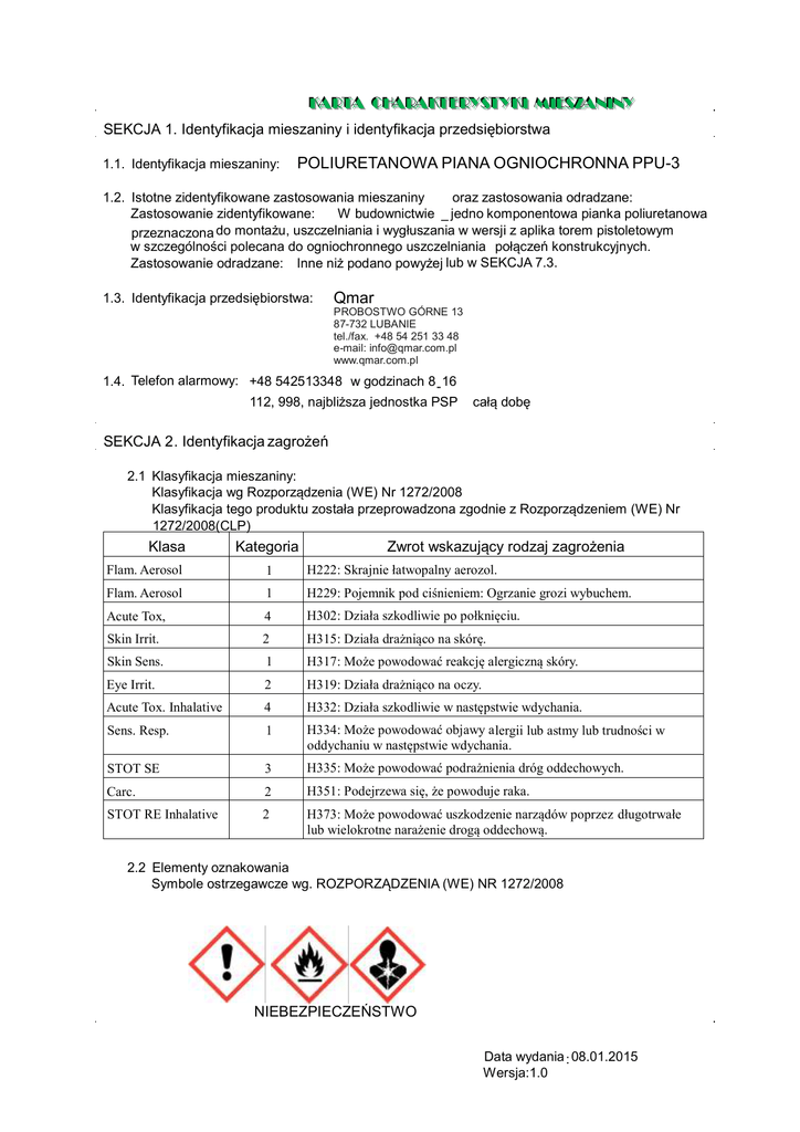 K AR AC AR AK AN CH MIIEESSZZA NIIN NY KA HA KT YSST YK KII M Y RT TA RA TEER RY TY SEKCJA 1. Identyfikacja mieszaniny i identyfikacja przedsiębiorstwa 1.1. Identyfikacja mieszaniny: POLIURETANOWA PIANA OGNIOCHRONNA PPU-3 1.2. Istotne zidentyfikowane zastosowania mieszaniny oraz zastosowania odradzane: Zastosowanie zidentyfikowane: W budownictwie – jedno komponentowa pianka poliuretanowa przeznaczona do montażu, uszczelniania i wygłuszania w wersji z aplika torem pistoletowym w szczególności polecana do ogniochronnego uszczelniania połączeń konstrukcyjnych. Zastosowanie odradzane: Inne niż podano powyżej lub w SEKCJA 7.3. 1.3. Identyfikacja przedsiębiorstwa: Qmar PROBOSTWO GÓRNE 13 87-732 LUBANIE tel./fax. +48 54 251 33 48 e-mail: [email protected] www.qmar.com.pl 1.4. Telefon alarmowy: +48 542513348 w godzinach 8 - 16 112, 998, najbliższa jednostka PSP całą dobę SEKCJA 2. Identyfikacja zagrożeń 2.1 Klasyfikacja mieszaniny: Klasyfikacja wg Rozporządzenia (WE) Nr 1272/2008 Klasyfikacja tego produktu została przeprowadzona zgodnie z Rozporządzeniem (WE) Nr 1272/2008(CLP) Klasa Flam. Aerosol Flam. Aerosol Acute Tox, Kategoria Zwrot wskazujący rodzaj zagrożenia 1 H222: Skrajnie łatwopalny aerozol. 4 H302: Działa szkodliwie po połknięciu. 1 H229: Pojemnik pod ciśnieniem: Ogrzanie grozi wybuchem. Skin Irrit. 2 H315: Działa drażniąco na skórę. Eye Irrit. 2 H319: Działa drażniąco na oczy. Skin Sens. 1 Acute Tox. Inhalative 4 STOT SE 3 Sens. Resp. Carc. STOT RE Inhalative 1 2 2 H317: Może powodować reakcję alergiczną skóry. H332: Działa szkodliwie w następstwie wdychania. H334: Może powodować objawy alergii lub astmy lub trudności w oddychaniu w następstwie wdychania. H335: Może powodować podrażnienia dróg oddechowych. H351: Podejrzewa się, że powoduje raka. H373: Może powodować uszkodzenie narządów poprzez długotrwałe lub wielokrotne narażenie drogą oddechową. 2.2 Elementy oznakowania Symbole ostrzegawcze wg. ROZPORZĄDZENIA (WE) NR 1272/2008 NIEBEZPIECZEŃSTWO Data wydania : 08.01.2015 Wersja:1.0 K AR AC AR AK AN MIIEESSZZA NIIN NY CH KA HA KT YSST YK KII M Y RT TA RA TEER RY TY Zwroty H wskazujące rod zaj zagrożenia: H222: Skrajnie łatwopalny aerozol. H229: Pojemnik pod ciśnieniem: Ogrzanie grozi wybuchem. H302: Działa szkodliwie po połknięciu. H315: Działa drażniąco na skórę. H317: Może powodować reakcję alergiczną skóry. H319: Działa drażniąco na oczy . H332: Działa szkodliwie w następstwie wdychania. H334: Może powodować objawy alergii lub astmy lub trudności w oddychaniu w następstwie wdychania. H335: Może powodować podrażnienia dróg oddechowych. H351: Podejrzewa się, że powoduje raka. H373: Może powodować uszkodzenie narządów poprzez długotrwałe lub wielokrotne narażenie drogą oddechową. Zwroty P wskazujące środki ostrożności: P101: W razie konieczności zasięgnięcia porady lekarza należy pokazać pojemnik lub etykietę . P102: Chronić prze dziećmi . P103: Przed użyciem przeczytać etykietę. P302+P352: W PRZYPADKU KONTAKTU ZE SKÓRĄ: U myć dużą ilością wody z mydłem. P304+P340: W PRZYPADKU DOSTANIA SIĘ DO DRÓG ODDECHOWYCH: Wyprowadzić lub wynieść poszkodowanego na świeże powietrze i zapewnić warunki do odpoczynku w pozycji umożliwiającej swobodne oddychanie. P305+P351+P338: W PRZYPADKU DOSTANIA SIĘ DO OCZU: Ostrożnie płukać wodą przez kilka minut. Wyjąć soczewki kontaktowe, jeżeli są i można je łatwo wyjąć. Nadal płukać. P501: Zawartość/pojemnik usuwać zgodnie z krajowymi przepisami Informacje dodatkowe: Pojemnik podciśnieniem . Nie przekłuwać ani nie spalać, nawet po zużyciu. Chronić przed światłem słonecznym. Nie wystawiać na działanie temperatury przekraczającej 50 oC/122o F. Informacje ostrzegawcze: Zawiera izocyjaniany. Może powodować wystąpienie reakcji alergicznej. Zapoznaj się z instrukcją dostarczoną przez producenta. W razie konieczności zasięgnąć porady lekarza, należy pokazać pojemnik lub etykietę. Zawiera gaz pod ciśnieniem; ogrzewanie grozi wybuchem. Nie rozpylać nad otwartym ogniem lub innym źródłem zapłonu. Zawartość/pojemnik usuwać do/zgodnie z krajowymi przepisami dotyczącymi gospodarki odpadami. Powtarzające się narażenie może powodować wysuszenie lub pękanie skóry. Stosowanie tego produ ktu może wywołać reakcje alergiczne u osób uczulonych na diizocyjaniany. Osoby cierpiące na astmę, egzemę lub inne dolegliwości skórne powinny unikać kontaktu skórnego z tym produktem. Ten produkt nie powinien być stosowany przy słabej wentylacji, chyba że stosowana jest maska ochronna z odpowiednim filtrem przeciwgazowym (np. typu A1 zgodnie z normą EN 14387). 2.3. Inne zagrożenia: Brak informacji na temat spełnienia kryteriów PBT i vPvB zgodnie z załącznikiem XIII REACH. SEKCJA 3 Skład / Informacja o składnikach . 3.1. Substancje: Nie dotyczy 3.2. Mieszaniny: Data wydania : 08.01.2015 Wersja:1.0 Składniki K AR AC AR AK AN NIIN NY CH MIIEESSZZA KA HA KT YSST YK KII M Y RT TA RA TEER RY TY Numer rejestracji REACH Diizocyjanian metylenodifenylu izomery i homologi Trójchlorek fosforu, produkty reakcji z tlenkiem propylen u 01-2119486772 -26 -xxxx Propan 01-2119486944-21-xxxx Butan 01-2119474691-32-xxxx Izobutan 01-2119485395 -27- xxxx Eter dimetylowy 01-2119472128 -37-xxxx 1,1-difluoroetan Zawartość Nr WE Nr CAS 25-<50% - 9016-87-9 10-<25% 911-815-4 1244733 77-4 1-<2,5% 200-827-9 74-98-6 2,5-<10% 200-857-2 204-065-8 115- 10-6 2,5-<10% 200-866- 1 75-37-6 <1% 2,5-<10% 203-448-7 106-97-8 75-28-5 Klasyfikacja wg ROZPORZĄDZENIA (WE) NR 1272/2008 Carc. 2 H351 Acute Tox. 4 H332 STOT RE 2 H373 Eye Irrit. 2 H319 STOT SE 3 H335 Skin Irrit. 2 H315 Resp. Sens. 1 H334 Skin Sens. 1 H317 Acute Tox. 4 H302 Flam. Gas 1 H220 Press. Gas H280 Aby uzyskać więcej informacji na temat ryzyka związanego z substancjami sprawdź w sekcjach 8,11, 12 i 16. SEKCJA 4 Środki pierwszej pomocy . 4.1. O