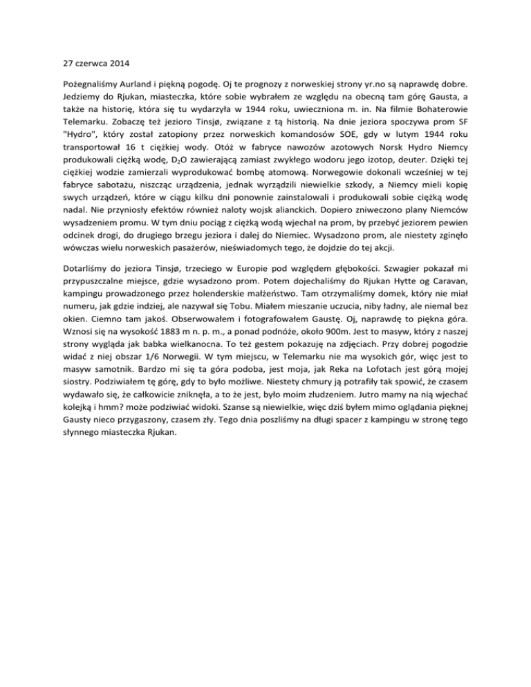 27 czerwca 2014 Pożegnaliśmy Aurland i piękną pogodę. Oj te prognozy z norweskiej strony yr.no są naprawdę dobre. Jedziemy do Rjukan, miasteczka, które sobie wybrałem ze względu na obecną tam górę Gausta, a także na historię, która się tu wydarzyła w 1944 roku, uwieczniona m. in. Na filmie Bohaterowie Telemarku. Zobaczę też jezioro Tinsjø, związane z tą historią. Na dnie jeziora spoczywa prom SF "Hydro", który został zatopiony przez norweskich komandosów SOE, gdy w lutym 1944 roku transportował 16 t ciężkiej wody. Otóż w fabryce nawozów azotowych Norsk Hydro Niemcy produkowali ciężką wodę, D2O zawierającą zamiast zwykłego wodoru jego izotop, deuter. Dzięki tej ciężkiej wodzie zamierzali wyprodukować bombę atomową. Norwegowie dokonali wcześniej w tej fabryce sabotażu, niszcząc urządzenia, jednak wyrządzili niewielkie szkody, a Niemcy mieli kopię swych urządzeń, które w ciągu kilku dni ponownie zainstalowali i produkowali sobie ciężką wodę nadal. Nie przyniosły efektów również naloty wojsk alianckich. Dopiero zniweczono plany Niemców wysadzeniem promu. W tym dniu pociąg z ciężką wodą wjechał na prom, by przebyć jeziorem pewien odcinek drogi, do drugiego brzegu jeziora i dalej do Niemiec. Wysadzono prom, ale niestety zginęło wówczas wielu norweskich pasażerów, nieświadomych tego, że dojdzie do tej akcji. Dotarliśmy do jeziora Tinsjø, trzeciego w Europie pod względem głębokości. Szwagier pokazał mi przypuszczalne miejsce, gdzie wysadzono prom. Potem dojechaliśmy do Rjukan Hytte og Caravan, kampingu prowadzonego przez holenderskie małżeństwo. Tam otrzymaliśmy domek, który nie miał numeru, jak gdzie indziej, ale nazywał się Tobu. Miałem mieszanie uczucia, niby ładny, ale niemal bez okien. Ciemno tam jakoś. Obserwowałem i fotografowałem Gaustę. Oj, naprawdę to piękna góra. Wznosi się na wysokość 1883 m n. p. m., a ponad podnóże, około 900m. Jest to masyw, który z naszej strony wygląda jak babka wielkanocna. To też gestem pokazuję na zdjęciach. Przy dobrej pogodzie widać z niej obszar 1/6 Norwegii. W tym miejscu, w Telemarku nie ma wysokich gór, więc jest to masyw samotnik. Bardzo mi się ta góra podoba, jest moja, jak Reka na Lofotach jest górą mojej siostry. Podziwiałem tę górę, gdy to było możliwe. Niestety chmury ją potrafiły tak spowić, że czasem wydawało się, że całkowicie zniknęła, a to że jest, było moim złudzeniem. Jutro mamy na nią wjechać kolejką i hmm? może podziwiać widoki. Szanse są niewielkie, więc dziś byłem mimo oglądania pięknej Gausty nieco przygaszony, czasem zły. Tego dnia poszliśmy na długi spacer z kampingu w stronę tego słynnego miasteczka Rjukan.