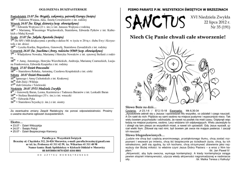 OGŁOSZENIA DUSZPASTERSKIE Poniedziałek 23.07 Św. Brygidy, zakonnicy, patronki Europy (święto) 1800 + Tadeusza Wiejasa, Jana, Anielę Czwartoszów z int. rodziny Wtorek 24.07 Św. Kingi, dziewicy (wsp. obowiązkowe) 700 + Edwarda Wojtysia (23 r. śm.) z int. Janusza Wojtysia z rodziną 1800 + Mariannę, Wincentego Więcławskich, Stanisława, Edwarda Pytków z int. Kubickich z Małej Kowali Środa 25.07 Św. Jakuba Apostoła (święto) 700 Do SPJ i MB dziękczynna z prośbą o dalsze bł. w życiu w 20-tą r. ślubu Ewy i Krzysztofa z int. dzieci 1800 + Leszka Kurtka, Bogusława, Genowefę, Stanisława Zawadzkich z int. rodziny Czwartek 26.07 Św. Joachima i Anny, rodziców NMP (wsp. obowiązkowe) 700 + Władysława Nowaka, Mariannę i Henryka Nowaków z int. synowej Stefanii z rodziną 1800 + Annę, Antoniego, Henryka Wierzbickich, Andrzeja, Mariannę Czarneckich, Lucjana Frankowicza, Edwarda Kasperka z int. rodziny Piątek 27.07 Dzień Powszedni 1800 + Stanisława Robaka, Antoninę, Czesława Krupińskich z int. córki Sobota 28.07 Dzień Powszedni 1500 Ignacego i Annę Cichońskich z int. Krukowej 1600 ślub Znój i Wikleja 1700 ślub Górecka i Tetelewski Niedziela 29.07 XVII Niedziela Zwykła 800 + Genowefę Baran, Leona, Kazimierza i Tadeusza Baranów z int. Leokadii Baran 1000 + Stefana Barańskiego (35 r. śm.) z int. wnuczki 1200 + Edwarda Pyka 1600 + Stanisława Szyszkę (r. śm.) z int. siostry PISMO PARAFII P.W. WSZYSTKICH ŚWIĘTYCH W BRZEZINACH SANCTUS XVI Niedziela Zwykła 22 lipca 2012 r. Nr 35 (191) Niech Cię Panie chwali całe stworzenie! Słowo Boże na dziś… Za ewentualne zmiany Zespół Redakcyjny nie ponosi odpowiedzialności. Prosimy o uważne słuchanie ogłoszeń duszpasterskich. Ekstra… × 23.07 - Dzień Włóczykija × 24.07 - Święto Policji × 25.07 - Dzień Bezpiecznego Kierowcy Czytania: Jr 23,1-6 / Ef 2,13-18 Ewangelia: Mk 6,30-34 „Apostołowie zebrali się u Jezusa i opowiedzieli Mu wszystko, co zdziałali i czego nauczali. A On rzekł do nich: Pójdźcie wy sami osobno na miejsce pustynne i wypocznijcie nieco. Tak wielu bowiem przychodziło i odchodziło, że nawet na posiłek nie mieli czasu. Odpłynęli więc łodzią na miejsce pustynne, osobno. Lecz widziano ich odpływających. Wielu zauważyło to i zbiegli się tam pieszo ze wszystkich miast, a nawet ich uprzedzili. Gdy Jezus wysiadł, ujrzał wielki tłum. Zlitował się nad nimi, byli bowiem jak owce nie mające pasterza. I zaczął ich nauczać.” Słowa błogosławionych… Parafia p.w. Wszystkich Świętych Brzeziny ul. Chęcińska 312, 26-026 Morawica, e-mail: [email protected] nr tel. ks. Proboszcz 41 311 42 59, ks. Wikariusz 41 311 48 98 Numer konta: Bank Spółdzielczy w Kielcach Oddział w Morawicy 08 84930004 0070 0205 4104 0001 D O U Ż Y T K U W E W N Ę T R Z N E G O „Ludzie nie chcą być częścią anonimowego, przelęknionego tłumu, chcą zostać rozpoznani i wezwani po imieniu, chcą iść bezpiecznie po ścieżkach życia, chcą, by ich odnaleziono, jeśli się zgubią, by ich kochano, chcą otrzymywać zbawienie jako najwyższy dar Bożej miłości: to właśnie czyni Jezus Dobry Pasterz – a wraz z Nim kapłani.” /bł. Jan Paweł II/ „Aktywność, aby była owocna, wymaga kontemplacji. A kiedy kontemplacja osiąga pewien stopień intensywności, użycza wtedy aktywności nagromadzonej w nadmiarze siły. /bł. Matka Teresa z Kalkuty/ A w parafii… Boży człowiek… - św. Krzysztof (25 lipca) ▪ 5 sierpnia rozpoczyna się XXXI Kielecka Piesza Pielgrzymka na Jasną Górę. Po noclegu w Wiślicy pielgrzymi wyruszą na szlak pątniczy 6 sierpnia. Zachęcamy wszystkich parafian do wyruszenia na te wyjątkowe rekolekcje w drodze. ▪ Dziś na placu za organistówką odbędzie się IV Brzeziński Piknik Artystyczny. Zapraszamy do uczestnictwa w imprezie. Przewidziano wiele różnych atrakcji. O życiu św. Krzysztofa brak pewnych wiadomości. Według późniejszych, ale prawdopodobnych świadectw, opartych na tradycji, św. Krzysztof miał pochodzić z Małej Azji, z prowincji rzymskiej Licji i tam ponieść śmierć męczeńską za panowania cesarza Decjusza ok. 250 roku. Z powodu braku szczegółowych informacji o św. Krzysztofie, średniowiecze na podstawie imienia "niosący Chrystusa" stworzyło popularną legendę o tym świętym. Według niej pierwotne imię Krzysztofa miało brzmieć Reprobus (z greckiego Odrażający), gdyż miał on mieć głowę podobną do psa. Wyróżniał się za to niezwykłą siłą. Postanowił więc oddać się w służbę najpotężniejszemu na ziemi panu. Służył najpierw królowi swojej krainy. Kiedy przekonał się, że król ten bardzo boi się szatana, wstąpił w jego służbę. Pewnego dnia przekonał się jednak, że szatan boi się imienia Chrystusa. To wzbudziło w nim ciekawość, kim jest ten Chrystus, którego boi się szatan. Opuścił więc służbę u szatana i poszedł w służbę Chrystusa. Zapoznał się z nauką chrześcijańską i przyjął Chrzest św. Za pokutę i dla zadośćuczynienia, że służył szatanowi, postanowił zamieszkać nad Jordanem, w miejscu, gdzie woda była płytsza, by przenosić na swoich potężnych barkach pielgrzymów, idących ze Wschodu do Ziemi Świętej.Pewnej nocy usłyszał głos Dziecka, które prosiło go o przeniesienie na drugi brzeg. Kiedy je wziął na ramiona, poczuł ogromny ciężar, który go przytłaczał tak, iż zdawało mu się, że zapadnie się w ziemię. Zawołał: "Kto jesteś, Dziecię?" Otrzymał odpowiedź: "Jam jest Jezus, twój Zbawiciel. Dźwigając Mnie, dźwigasz cały świat". Pan Jezus miał mu wtedy przepowiedzieć rychłą śmierć męczeńską. Modlitwa: Święty Krzysztofie módl się za nami. Dzwony olimpijskie Dźwięk dzwonów wszystkich kościołów chrześcijańskich różnych wyznań słychać będzie 27 lipca - w dniu rozpoczęcia Letnich Igrzysk Olimpijskich w Londynie. Zabrzmią one o godzinie 8.12 w całej Wielkiej Brytanii. Za