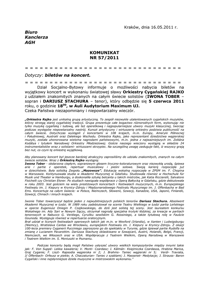 Kraków, dnia 16.05.2011 r. Biuro Kanclerza AGH KOMUNIKAT NR 57/2011 ================================ Dotyczy: biletów na koncert. ================================ Dział Socjalno-Bytowy informuje o możliwości nabycia biletów na wyjątkowy koncert w wykonaniu światowej sławy Orkiestry Cygańskiej RAJKO z udziałem znakomitych znanych na całym świecie solistów (IWONA TOBER – sopran i DARIUSZ STACHURA – tenor), który odbędzie się 5 czerwca 2011 roku, o godzinie 1800, w Auli Audytorium Maximum UJ. Czeka Państwa niezapomniany i niepowtarzalny wieczór. „Orkiestra Rajko jest unikalną grupą artystyczną. To zespół niezwykle utalentowanych cygańskich muzyków, którzy strzegą starej cygańskiej tradycji. Grupa prezentuje całe bogactwo różnorodnych form, wykonując nie tylko muzykę cygańską i ludową, ale też operetkową i najpopularniejsze utwory muzyki klasycznej, tworząc podczas występów niepowtarzalny nastrój. Kunszt artystyczny i wirtuozerię orkiestry podziwia publiczność na całym świecie. Dotychczas wystąpili z koncertami w 108 krajach, m.in. Europy, Ameryki Północnej i Południowej, Australii oraz Dalekiego Wschodu. Orkiestra Rajko, jako reprezentant dziedzictwa węgierskiej muzyki, została uhonorowana wieloma nagrodami państwowymi, m.in. jedna z najważniejszych im. Zoltána Kodálya i tytułem Narodowej Orkiestry Młodzieżowej. Goście naszego wieczoru wystąpią w składzie 24 instrumentalistów wraz z solistami- wirtuozami skrzypiec. Na szczególną uwagę zasługuje fakt, iż wszyscy grają bez nut, co czyni tę orkiestrę wyjątkową. Aby planowany koncert był jeszcze bardziej atrakcyjny zaprosiliśmy do udziału znakomitych, znanych na całym świecie solistów. Wraz z Orkiestrą Rajko wystąpią: Iwona Tober - obdarzona ciepłym, sopranowym głosem liryczno-koloraturowym oraz niezwykłą urodą, śpiewa arie i partie z operetek, repertuar musicalowy i pieśni solowe. Swoją karierę rozpoczęła już w dzieciństwie. Była solistką Zespołu „Mazowsze”. Edukację wokalną rozpoczęła w ZPSM im. F. Chopina w Warszawie. Kontynuowała studia w Akademii Muzycznej w Gdańsku. Studiowała również w Hochschule für Musik und Theater w Hamburgu, a doskonaliła sztukę belcanta u takich mistrzów, jak Katia Ricciarelli, Salvatore Fisichelli czy Christian Elsner. Po studiach nawiązała współprace z Operą Bałtycką w Gdańsku, gdzie debiutowała w roku 2003. Jest gościem na wielu prestiżowych koncertach i festiwalach muzycznych, m.in. Europejskiego Festiwalu im. J. Kiepury w Krynicy-Zdroju i Międzynarodowego Festivalu Muzycznego im. J. Offenbacha w Bad Ems. Koncertuje na całym świecie: w Polsce, Niemczech, Słowenii, Szwecji, Kanadzie, USA, Japonii, Finlandii, Szwecji, Chinach i innych krajach. Iwonie Tober towarzyszył będzie jeden z najwybitniejszych polskich tenorów Dariusz Stachura. Absolwent Akademii Muzycznej w Łodzi. W 1989 roku zadebiutował na scenie Teatru Wielkiego w Łodzi partia Leńskiego w operze Eugeniusz Oniegin P. Czajkowskiego, do dziś jest solistą tej sceny. Jest laureatem konkursu Wokalnego im. Ady Sari w Nowym Sączu, otrzymał nagrodę specjalna krytyki łódzkiej, za kreacje w partiach tenorowych w Nabucco G. Verdiego, Cyruliku sewilskim G. Rossiniego, a także tytułową rolę w Fauście Gounoda. Występuje również w repertuarze oratoryjnym. Brał udział w licznych festiwalach operowych takich jak m.in. w Wexford (Irlandia), w Xanten i Ludwigsburgu (Niemcy), Wratislava Cantas we Wrocławiu, europejskim Festiwalu im. J. Kiepury w Krynicy-Zdroju. Z okazji 100-lecia premiery Cyganerii Pucciniego zaproszono go do spektaklu w Turynie, gdzie śpiewał partie Rudolfa na zmianę z Lucianem Pavarottim. Dariusza Stachurę oklaskiwano w Szwajcarii, Austrii, Holandii, Belgii, Francji, Niemczech, we Włoszech oraz w USA. Współpracuje z Teatrem Wielkim, Operą Narodową w Warszawie i Teatrem Wielkim im. S. Moniuszki w Poznaniu. Podczas koncertu będą mogli Państwo usłyszeć utwory wielkich kompozytorów między innymi takie jak: F. Von Suppé- Lekka kawaleria; V. Monti- Czardasz; I. Kálmán- Księżniczka Czardasza, Hrabina Marica, Graj Cyganie; F. Liszt- Rapsodia węgierska nr 2; J. Brahms- Taniec węgierski nr 5; Verdi- Traviata, J/ Offenbach- Orfeusz w piekle; A. Chaczaturian- Taniec z szablami; J. Massenet- Medytacje; J. Strauss- Baron Cygański i inne najsłynniejsze dzieła muzyczne w mistrzowskim wykonaniu.” Koszt biletu: 80,00 zł. Koszt ulgowego biletu dla pracowników AGH wynosi 40,00 zł. Dofinansowanie z ZFŚS wynosi 40,00 zł. Bilety do nabycia od zaraz, w paw. C-2 , pok. 114, tel. 32-75. Dyrektor ds. Pracowniczych mgr inż. Andrzej Pogonowski