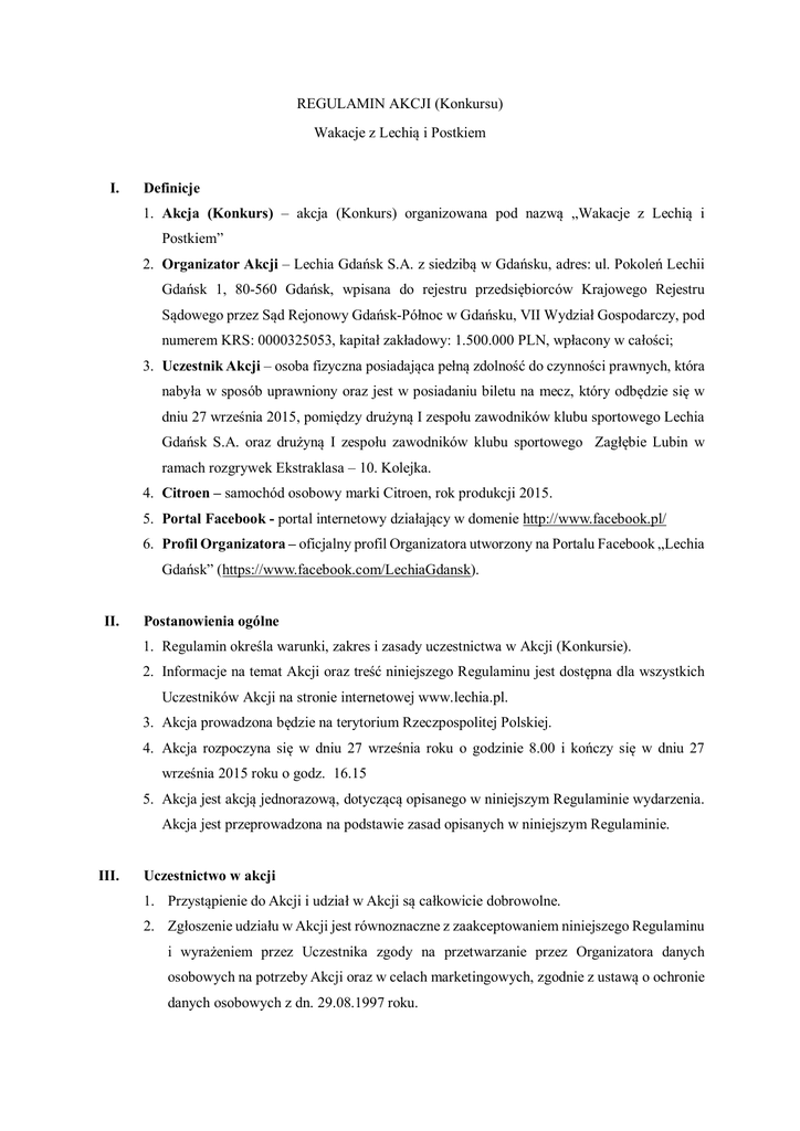REGULAMIN AKCJI (Konkursu) Wakacje z Lechią i Postkiem I. Definicje 1. Akcja (Konkurs) – akcja (Konkurs) organizowana pod nazwą „Wakacje z Lechią i Postkiem” 2. Organizator Akcji – Lechia Gdańsk S.A. z siedzibą w Gdańsku, adres: ul. Pokoleń Lechii Gdańsk 1, 80-560 Gdańsk, wpisana do rejestru przedsiębiorców Krajowego Rejestru Sądowego przez Sąd Rejonowy Gdańsk-Północ w Gdańsku, VII Wydział Gospodarczy, pod numerem KRS: 0000325053, kapitał zakładowy: 1.500.000 PLN, wpłacony w całości; 3. Uczestnik Akcji – osoba fizyczna posiadająca pełną zdolność do czynności prawnych, która nabyła w sposób uprawniony oraz jest w posiadaniu biletu na mecz, który odbędzie się w dniu 27 września 2015, pomiędzy drużyną I zespołu zawodników klubu sportowego Lechia Gdańsk S.A. oraz drużyną I zespołu zawodników klubu sportowego Zagłębie Lubin w ramach rozgrywek Ekstraklasa – 10. Kolejka. 4. Citroen – samochód osobowy marki Citroen, rok produkcji 2015. 5. Portal Facebook - portal internetowy działający w domenie http://www.facebook.pl/ 6. Profil Organizatora – oficjalny profil Organizatora utworzony na Portalu Facebook „Lechia Gdańsk” (https://www.facebook.com/LechiaGdansk). II. Postanowienia ogólne 1. Regulamin określa warunki, zakres i zasady uczestnictwa w Akcji (Konkursie). 2. Informacje na temat Akcji oraz treść niniejszego Regulaminu jest dostępna dla wszystkich Uczestników Akcji na stronie internetowej www.lechia.pl. 3. Akcja prowadzona będzie na terytorium Rzeczpospolitej Polskiej. 4. Akcja rozpoczyna się w dniu 27 września roku o godzinie 8.00 i kończy się w dniu 27 września 2015 roku o godz. 16.15 5. Akcja jest akcją jednorazową, dotyczącą opisanego w niniejszym Regulaminie wydarzenia. Akcja jest przeprowadzona na podstawie zasad opisanych w niniejszym Regulaminie. III. Uczestnictwo w akcji 1. Przystąpienie do Akcji i udział w Akcji są całkowicie dobrowolne. 2. Zgłoszenie udziału w Akcji jest równoznaczne z zaakceptowaniem niniejszego Regulaminu i wyrażeniem przez Uczestnika zgody na przetwarzanie przez Organizatora danych osobowych na potrzeby Akcji oraz w celach marketingowych, zgodnie z ustawą o ochronie danych osobowych z dn. 29.08.1997 roku. 3. W Akcji nie mogą brać udziału pracownicy Organizatora oraz pracownicy podmiotów współpracujących przy przygotowaniu i realizacji Akcji, lub inne osoby biorące udział w jakikolwiek sposób w organizacji i przeprowadzeniu Akcji. 4. Uczestnikiem Akcji może być każda pełnoletnia osoba fizyczna, posiadająca pełną zdolność do czynności prawnych, która w dniu rozpoczęcia Konkursu posiada miejsce stałego zamieszkania na terytorium Rzeczypospolitej Polskiej. 5. Warunkiem udziału w Akcji jest kolejno: a) nabycie, w punkcie sprzedaży lub w ramach sprzedaży internetowej karnetu na sezon 2015/2016 lub rundę jesienną sezonu 2015/2016; b) posiadanie karnetu na sezon 2015/2016 lub rundę jesienną sezonu 2015/2016; c) posiadanie dowodu zakupu karnetu na sezon 2015/2016 lub rundę jesienną sezonu 2015/2016, tj. paragonu zakupu karnetu na sezon 2015/2016 lub rundę jesienną sezonu 2015/2016 w punkcie sprzedaży biletów albo potwierdzenia obciążenia rachunku bankowego zakupem karnetu na sezon 2015/2016 lub rundę jesienną sezonu 2015/2016, w przypadku zakupu przez Internet. 6. Organizator zastrzega sobie prawo do weryfikacji spełnienia przez Uczestnika warunków uczestnictwa, w tym zastrzega możliwość weryfikacji posiadanych potwierdzeń zakupu biletów oraz ma prawo do wyrażania odmowy zgody na uczestnictwo w Akcji. 7. Organizator zastrzega, iż w przypadku gdy karnet na mecze Lechii będzie uszkodzony, podarty lub w jakikolwiek inny sposób zniszczony, w taki sposób, że nie będzie możliwe jego zweryfikowanie, a w szczególności ustalenie za jaką cenę oraz na jaki sektor i miejsce został zakupiony, to Uczestnik może zostać wykluczony z Akcji. IV. Zasady akcji 1. Warunkiem udziału w Akcji jest: a) Zamieszczenie na oficjalnym profilu Lechii Gdańsk w komentarzu do posta konkursowego odpowiedzi na pytanie „Dlaczego to Ty powinieneś wygrać Citroena na weekend”. 2. Niedopuszczalne jest zgłoszenie przez Uczestnika do Konkursu, które zawiera treści sprzeczne z prawem, uznawane powszechnie za społecznie niewłaściwe, obraźliwe, wulgarne, sprzeczne z dobrymi obyczajami, sprzeczne z zasadami współżycia społecznego, które mogą być odebrane jako społecznie naganne. V. Zasady oceny i wyboru laureatów. Nagrody. 1. Nagrodą w Akcji jest udostępnienie samochodu marki Citroen na 3 dni, które zostaną ustalone pomiędzy zwycięzcą Akcji, a partnerem Akcji Citroen Auto Postek. Zwycięzca Akcji nie może przenieść praw do otrzymania nagrody na osoby trzecie. Nie może także żądać wymiany nagrody na inną. 2. Wyboru zwycięzcy Akcji dokona na podstawie decyzji uznaniowej Komisja Konkursowa w składzie trzy osobowym, wybrana przez Organizatora. 3. Zwycięzcą Akcji zostanie jedna osoba, której odpowiedź na pytanie w poście konkursowym zostanie przez Komisję Konkursową uznane za najciekawsze spośród opublikowanych przez Uczestników Konkursu na Portalu Facebook, zgodnie z zasadami niniejszego Regulaminu. 4. Decyzje podjęte przez Komisję Konkursową są ostateczne i prawnie wiążące dla wszystkich uczestników Konkursu. 5. Uczestnicy Akcji zostaną poinformowani o wynikach Akcji przez Organizatora poprzez podanie informacji o Zwycięzcy na w przerwie meczu. Dodatkowo, Zwycięzca zostanie poinformowany o wygranej poprzez przesłanie mu prywatnej wiadomości. 6. Zwycięzca Akcji wyraża zgodę na przetwarzanie swoich danych osobowych dla potrzeb niezbędnych do realizacji procesu Akcji. Z chwilą wydania nagrody Zwycięzcy, Organizator nabywa prawo do rozpowszechniania wizerunku zwycięzcy akcji na następujących polach eksploatacji: wykorzystania i rozpowszechniania na stronie internetowej Organizatora, Profilu Org