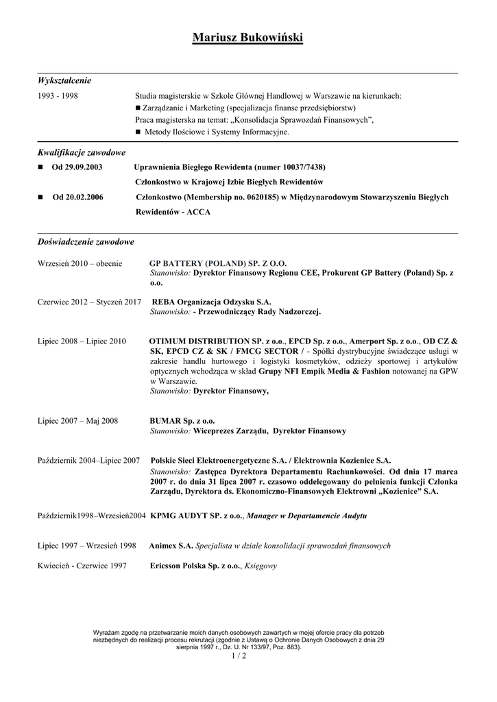 Mariusz Bukowiński Wykształcenie Studia magisterskie w Szkole Głównej Handlowej w Warszawie na kierunkach: Zarządzanie i Marketing (specjalizacja finanse przedsiębiorstw) Praca magisterska na temat: „Konsolidacja Sprawozdań Finansowych”, Metody Ilościowe i Systemy Informacyjne. 1993 - 1998 Kwalifikacje zawodowe Od 29.09.2003 Uprawnienia Biegłego Rewidenta (numer 10037/7438) Członkostwo w Krajowej Izbie Biegłych Rewidentów Od 20.02.2006 Członkostwo (Membership no. 0620185) w Międzynarodowym Stowarzyszeniu Biegłych Rewidentów - ACCA Doświadczenie zawodowe Wrzesień 2010 – obecnie GP BATTERY (POLAND) SP. Z O.O. Stanowisko: Dyrektor Finansowy Regionu CEE, Prokurent GP Battery (Poland) Sp. z o.o. Czerwiec 2012 – Styczeń 2017 REBA Organizacja Odzysku S.A. Stanowisko: - Przewodniczący Rady Nadzorczej. Lipiec 2008 – Lipiec 2010 OTIMUM DISTRIBUTION SP. z o.o., EPCD Sp. z o.o., Amerport Sp. z o.o., OD CZ & SK, EPCD CZ & SK / FMCG SECTOR / - Spółki dystrybucyjne świadczące usługi w zakresie handlu hurtowego i logistyki kosmetyków, odzieży sportowej i artykułów optycznych wchodząca w skład Grupy NFI Empik Media & Fashion notowanej na GPW w Warszawie. Stanowisko: Dyrektor Finansowy, Lipiec 2007 – Maj 2008 BUMAR Sp. z o.o. Stanowisko: Wiceprezes Zarządu, Dyrektor Finansowy Październik 2004–Lipiec 2007 Polskie Sieci Elektroenergetyczne S.A. / Elektrownia Kozienice S.A. Stanowisko: Zastępca Dyrektora Departamentu Rachunkowości. Od dnia 17 marca 2007 r. do dnia 31 lipca 2007 r. czasowo oddelegowany do pełnienia funkcji Członka Zarządu, Dyrektora ds. Ekonomiczno-Finansowych Elektrowni „Kozienice” S.A. Październik1998–Wrzesień2004 KPMG AUDYT SP. z o.o., Manager w Departamencie Audytu Lipiec 1997 – Wrzesień 1998 Animex S.A. Specjalista w dziale konsolidacji sprawozdań finansowych Kwiecień - Czerwiec 1997 Ericsson Polska Sp. z o.o., Księgowy Wyrażam zgodę na przetwarzanie moich danych osobowych zawartych w mojej ofercie pracy dla potrzeb niezbędnych do realizacji procesu rekrutacji (zgodnie z Ustawą o Ochronie Danych Osobowych z dnia 29 sierpnia 1997 r., Dz. U. Nr 133/97, Poz. 883). 1/2 Członkostwo w Radach Nadzorczych W latach 2005 – 2012 zasiadałem / zasiadam w Radach Nadzorczych: REBA Organizacja Odzysku S.A. (od 1 kwietnia 2012 do stycznia 2017), Wydawnictwa Szkolne i Pedagogiczne S.A. ZM Bumar Łabędy S.A. (Przewodniczący RN, spółka zależna w Grupie Bumar), Lot Ground Services Sp. z o.o. (Spółka zależna w Grupie PLL LOT S.A.), Zakłady Chemiczne Nitro-Chem S.A. w Bydgoszczy (Spółka zależna w Grupie Bumar), Centralwings (Nowy Przewoźnik Sp. z o.o.– Spółka zależna w Grupie PLL LOT S.A.), Elektrownia „Kozienice” S.A., (od dnia 17 marca 2007 r. oddelegowany do pełnienia funkcji Członka Zarządu, Dyrektora ds. Ekonomiczno-Finansowych Elektrowni „Kozienice” S.A.), NOM Sp. z o.o. (Spółka zależna w Grupie Exatel S.A.). Znajomość języków obcych j. angielski bardzo dobra w mowie i piśmie; j. rosyjski bardzo dobra w mowie i piśmie (Certyfikat Instytutu Puszkina w Moskwie); Wyrażam zgodę na przetwarzanie moich danych osobowych zawartych w mojej ofercie pracy dla potrzeb niezbędnych do realizacji procesu rekrutacji (zgodnie z Ustawą o Ochronie Danych Osobowych z dnia 29 sierpnia 1997 r., Dz. U. Nr 133/97, Poz. 883). 2/2
