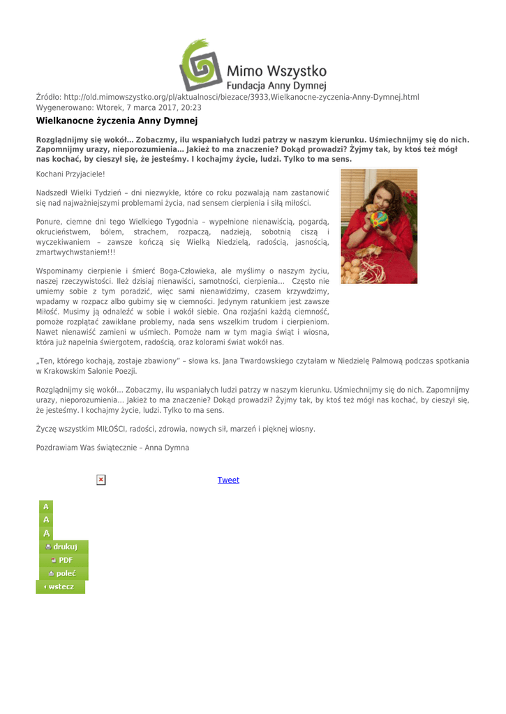 Źródło: http://old.mimowszystko.org/pl/aktualnosci/biezace/3933,Wielkanocne-zyczenia-Anny-Dymnej.html Wygenerowano: Wtorek, 7 marca 2017, 20:23 Wielkanocne życzenia Anny Dymnej Rozglądnijmy się wokół… Zobaczmy, ilu wspaniałych ludzi patrzy w naszym kierunku. Uśmiechnijmy się do nich. Zapomnijmy urazy, nieporozumienia… Jakież to ma znaczenie? Dokąd prowadzi? Żyjmy tak, by ktoś też mógł nas kochać, by cieszył się, że jesteśmy. I kochajmy życie, ludzi. Tylko to ma sens. Kochani Przyjaciele! Nadszedł Wielki Tydzień – dni niezwykłe, które co roku pozwalają nam zastanowić się nad najważniejszymi problemami życia, nad sensem cierpienia i siłą miłości. Ponure, ciemne dni tego Wielkiego Tygodnia – wypełnione nienawiścią, pogardą, okrucieństwem, bólem, strachem, rozpaczą, nadzieją, sobotnią ciszą i wyczekiwaniem – zawsze kończą się Wielką Niedzielą, radością, jasnością, zmartwychwstaniem!!! Wspominamy cierpienie i śmierć Boga-Człowieka, ale myślimy o naszym życiu, naszej rzeczywistości. Ileż dzisiaj nienawiści, samotności, cierpienia… Często nie umiemy sobie z tym poradzić, więc sami nienawidzimy, czasem krzywdzimy, wpadamy w rozpacz albo gubimy się w ciemności. Jedynym ratunkiem jest zawsze Miłość. Musimy ją odnaleźć w sobie i wokół siebie. Ona rozjaśni każdą ciemność, pomoże rozplątać zawikłane problemy, nada sens wszelkim trudom i cierpieniom. Nawet nienawiść zamieni w uśmiech. Pomoże nam w tym magia świąt i wiosna, która już napełnia świergotem, radością, oraz kolorami świat wokół nas. „Ten, którego kochają, zostaje zbawiony” – słowa ks. Jana Twardowskiego czytałam w Niedzielę Palmową podczas spotkania w Krakowskim Salonie Poezji. Rozglądnijmy się wokół… Zobaczmy, ilu wspaniałych ludzi patrzy w naszym kierunku. Uśmiechnijmy się do nich. Zapomnijmy urazy, nieporozumienia… Jakież to ma znaczenie? Dokąd prowadzi? Żyjmy tak, by ktoś też mógł nas kochać, by cieszył się, że jesteśmy. I kochajmy życie, ludzi. Tylko to ma sens. Życzę wszystkim MIŁOŚCI, radości, zdrowia, nowych sił, marzeń i pięknej wiosny. Pozdrawiam Was świątecznie – Anna Dymna Tweet