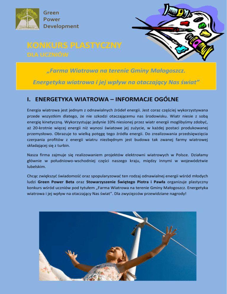 Green Power Development KONKURS PLASTYCZNY DLA UCZNIÓW „Farma Wiatrowa na terenie Gminy Małogoszcz. Energetyka wiatrowa i jej wpływ na otaczający Nas świat” I. ENERGETYKA WIATROWA – INFORMACJE OGÓLNE Energia wiatrowa jest jednym z odnawialnych źródeł energii. Jest coraz częściej wykorzystywana przede wszystkim dlatego, że nie szkodzi otaczającemu nas środowisku. Wiatr niesie z sobą energię kinetyczną. Wykorzystując jedynie 10% niesionej przez wiatr energii moglibyśmy zdobyć, aż 20-krotnie więcej energii niż wynosi światowe jej zużycie, w każdej postaci produkowanej przemysłowo. Obrazuje to wielką potęgę tego źródła energii. Do zrealizowania przedsięwzięcia czerpania profitów z energii wiatru niezbędnym jest budowa tak zwanej farmy wiatrowej składającej się z turbin. Nasza firma zajmuje się realizowaniem projektów elektrowni wiatrowych w Polsce. Działamy głównie w południowo-wschodniej części naszego kraju, między innymi w województwie lubelskim. Chcąc zwiększyć świadomość oraz spopularyzować ten rodzaj odnawialnej energii wśród młodych ludzi Green Power Beta oraz Stowarzyszenie Świętego Piotra i Pawła organizuje plastyczny konkurs wśród uczniów pod tytułem „Farma Wiatrowa na terenie Gminy Małogoszcz. Energetyka wiatrowa i jej wpływ na otaczający Nas świat”. Dla zwycięzców przewidziane nagrody! Green Power Development II. KONKURS 1. Organizator Spółka Green Power Beta Sp. z o.o. oraz Stowarzyszenie Świętego Piotra i Pawła ma przyjemność zaprosić dzieci (z podziałem na kategorie wiekowe: od 0 do 12 lat oraz od 13 do 18) do udziału w Konkursie, na podstawie niniejszego Regulaminu. 2. Cel Konkursu Wszyscy wiemy jak ważna jest ochrona środowiska naturalnego na naszej planecie. Bardzo istotnym zagadnieniem jest wytwarzanie energii elektrycznej, a ponieważ potrzebujemy jej coraz więcej, czysty sposób jej pozyskiwania np. poprzez wykorzystanie energii wiatru ma pozytywny wpływ na środowisko. Pokażmy innym jak ważna jest świadomość ludzi na temat potrzeby ochrony otaczającego nas świata, dzięki której wspólnie przyczynimy się do poprawy życia na naszej planecie! 3. Zasady Konkursu KATEGORIE Uczniowie mogą wziąć udział w Konkursie w następujących kategoriach wiekowych: Kategoria 1: 0 – 12 lat Kategoria 2: 13 – 18 lat WYMOGI TECHNICZNE WYMOGI FORMALNE Technika: dowolna (rysunek, malunek, szkic itp.) Materiały: dowolne (ołówek, farby, kredki itp.) Rozmiar: A4, A3, A2 Osoba chcąca wziąć udział w Konkursie może zgłosić jedną (1) własnoręcznie przygotowaną pracę. Praca musi być opisana z tyłu w następujący sposób: Imię i Nazwisko, wiek uczestnika, adres zamieszkania. Prace przyjmowane będą do dnia 29 lutego 2012. Wykonaną pracę należy złożyć w Kancelarii Parafialnej w Rembieszycach lub przesłać na adres Kancelarii: Rembieszyce 13, 28-366 Małogoszcz. Green Power Development 4. Wyłonienie zwycięzców Jury, składające się z trzech członków, będzie składało się z: Przedstawiciela Stowarzyszenia Świętego Piotra i Pawła, Przedstawiciela Parafii w Rembieszycach oraz Przedstawiciela firmy Green Power Beta. Zwycięzcy Konkursu wyłonieni zostaną do dnia 15 marca 2012. Wyniki ogłoszone zostaną do dnia 20 marca 2012. Razem z wynikami zostanie podana informacja dotycząca daty oraz miejsca rozdania nagród. 5. Nagrody Nagrodzeni zostaną autorzy trzech najlepszych prac z każdej kategorii wiekowej (w sumie 6 zwycięzców). Nagrody to: I miejsce – cyfrowy aparat fotograficzny II miejsce – urządzenie wielofunkcyjne III miejsce – zestaw bezprzewodowy (klawiatura + myszka) oraz dyplomy 6. Wymogi prawne Uczestnictwo w Konkursie jest bezpłatne i dobrowolne. Każdy uczestnik przyjmuje do wiadomości i potwierdza, że praca zgłoszona do Konkursu musi być wykonana osobiście przez każdego uczestnika. Prace uczestników nie naruszą żadnych praw stron trzecich, w szczególności jakichkolwiek praw własności intelektualnej i/lub autorskich. Każdy uczestnik wyraża zgodę na przeniesienie na rzecz Organizatora praw do pracy zgłoszonej do Konkursu potrzebnych do korzystania z niej polegającego na kopiowaniu, druku, publikacji, wykorzystywania podczas prezentacji lub wystaw publicznych. SERDECZNIE ZAPRASZAMY DO UDZIAŁU!