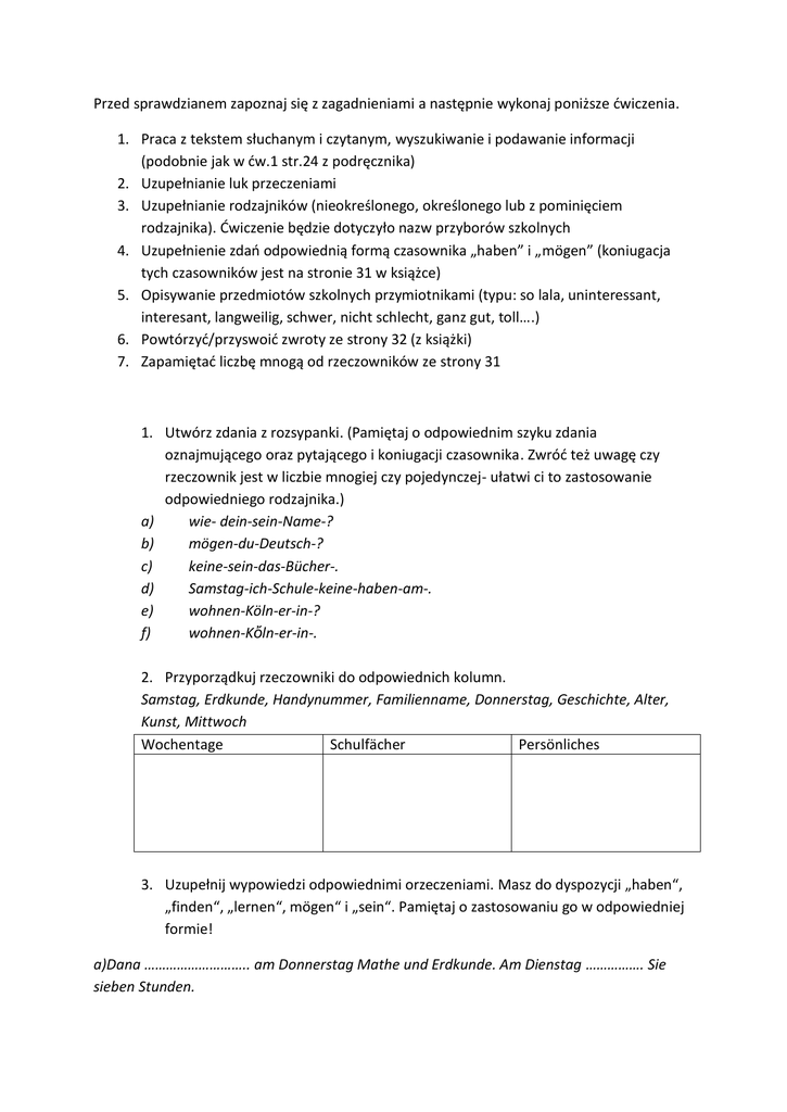 Przed sprawdzianem zapoznaj się z zagadnieniami a następnie wykonaj poniższe ćwiczenia. 1. Praca z tekstem słuchanym i czytanym, wyszukiwanie i podawanie informacji (podobnie jak w ćw.1 str.24 z podręcznika) 2. Uzupełnianie luk przeczeniami 3. Uzupełnianie rodzajników (nieokreślonego, określonego lub z pominięciem rodzajnika). Ćwiczenie będzie dotyczyło nazw przyborów szkolnych 4. Uzupełnienie zdań odpowiednią formą czasownika „haben” i „mögen” (koniugacja tych czasowników jest na stronie 31 w książce) 5. Opisywanie przedmiotów szkolnych przymiotnikami (typu: so lala, uninteressant, interesant, langweilig, schwer, nicht schlecht, ganz gut, toll….) 6. Powtórzyć/przyswoić zwroty ze strony 32 (z książki) 7. Zapamiętać liczbę mnogą od rzeczowników ze strony 31 1. Utwórz zdania z rozsypanki. (Pamiętaj o odpowiednim szyku zdania oznajmującego oraz pytającego i koniugacji czasownika. Zwróć też uwagę czy rzeczownik jest w liczbie mnogiej czy pojedynczej- ułatwi ci to zastosowanie odpowiedniego rodzajnika.) a) wie- dein-sein-Name-? b) mögen-du-Deutsch-? c) keine-sein-das-Bücher-. d) Samstag-ich-Schule-keine-haben-am-. e) wohnen-Köln-er-in-? f) wohnen-Kὄln-er-in-. 2. Przyporządkuj rzeczowniki do odpowiednich kolumn. Samstag, Erdkunde, Handynummer, Familienname, Donnerstag, Geschichte, Alter, Kunst, Mittwoch Wochentage Schulfächer Persönliches 3. Uzupełnij wypowiedzi odpowiednimi orzeczeniami. Masz do dyspozycji „haben“, „finden“, „lernen“, mögen“ i „sein“. Pamiętaj o zastosowaniu go w odpowiedniej formie! a)Dana ……………………….. am Donnerstag Mathe und Erdkunde. Am Dienstag ……………. Sie sieben Stunden. b)Peters Lieblingsfächer ……………………. Chemie und Bio. In Bio …………… er eine Eins, in Chemie ………………….. er noch keine Note. Er ……………….. noch Physik. c)Sonja ……………………….. Fremdsprachen sehr. In der Schule ………………… sie Englisch und Französisch. Sie ……………… Englisch sehr interessant. Französisch ……………….. leider etwas schwer. d)Was ………………. du in deinem Mäppchen? – Ich ……………………. Zwei Kulis. e)Welchen Wochentag …………………. Nelly und Lena? – Ich glaube, sie ………….. den Samstag. 3. Zapisz całym zdaniem co znajduje się w twoim piórniku. W kolejnym zdaniu zapisz, czego jeszcze potrzebujesz. (Pamiętaj o użyciu odpowiedniego rodzajnika w odpowiednim przypadku!) ……………………………………………………………………………………………………………………………………… ………………………………………………………………………………………………………………………………………. ……………………………………………………………………………………………………………………………………. ………………………………………………………………………………………………………………………………………… 4. Dopisz odpowiedni rodzajnik określony rzeczownika w mianowniku. ………….. Kuli, ………………… Bleistift, ……………… Bild, ………….. Schultasche, ……………. Handy, …………………. Buch, …………………. Bücher, …………..Hefte 5. Odpowiedz pełnym zdaniem na każde pytanie. a)Wie findest du Kunst? ………………………………………………………. b)Was hast du in Polnisch? ……………………………………………………… c)Was ist das? …………………………………………………………………. d)Was ist in der Schultasche? ………………………………………………………….. e)Ist das ein Spitzer? …………………………………………………………… f)Welche Schulfächer hast du am Donnerstag? ………………………………………………… …………………………………………………………………………………………………………………………. g)Wie viele Stunden hast du am Montag? ………………………………………………….. h)Findest du Mathe schwer? …………………………………………………………………. i)Was ist dein Lieblingsfach? ……………………………………………………………………. 6. Uzupełnij tabelkę brakującymi znaczeniami i formami czasowników. Singular (l.poj.) ich du er/sie/es …………………. (być) bin finden mögen …………………….. (………………………) (………………………) (mieć) habe findest mag 7. Połącz pasujące zdania. Napisz je w miejscu wykropkowanym. Jedno zdanie nie pasuje! 1.Kommst du aus der Schweiz? 2. Wann hat er Physik? 3.Am Freitag hat Peter fünf Stunden. 4.Ist das ein Handy? 5.Was ist in deinem Mäppchen? A.Mathe ist uninteressant. B.Nein, das ist ein MP4-Player. C.Nur ein Kuli. D.Ich mag Fußball. E.Er findet Mathe toll. F.Er hat zwei Stunden Deutsch und je eine Stunde Mathe, Bio und Sozi. 6.Wie alt seid ihr? 7. Sport ist mein Hobby. 8. Er findet Mathe langweilig. G.13 H.Nein, aus Polen. I.Am Mittwoch. ……………………………………………………………………………………………………………….. ………………………………………………………………………………………………………………. …………………………………………………………………………………………………………….. ……………………………………………………………………………………………………………… ………………………………………………………………………………………………………………. ……………………………………………