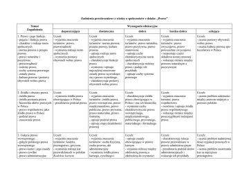 Zadnienia powtórzeniowe z wiedzy o społeczeństw z działu: „Prawo” Temat Zagadnienia Wymagania edukacyjne dopuszczająca dostateczna dobra bardzo dobra celująca 1. Prawo i jego funkcje. - pojęcie i funkcje prawa - charakter i rodzaje norm społecznych - norma prawna a przepis prawny - prawo naturalne i pozytywne - praworządność - rodziny prawa - cechy systemu prawnego - zasady prawa - kultura prawna i postawy obywateli wobec prawa Uczeń: - wyjaśnia znaczenie terminów: prawo, praworządność - wymienia rodzaje norm społecznych - wymienia postawy obywateli wobec prawa Uczeń: - wyjaśnia znaczenie terminów: norma prawna, przepis prawny, kultura prawna - opisuje rodzaje norm społecznych - charakteryzuje funkcje prawa - wymienia i opisuje najczęściej stosowane zasady prawa wywodzące się z prawa rzymskiego - charakteryzuje postawy obywateli wobec prawa Uczeń: - wyjaśnia znaczenie terminów: prawo naturalne, prawo pozytywne, prawo stanowione - opisuje cechy charakterystyczne norm społecznych - charakteryzuje rodziny prawa i podaje ich przykłady - opisuje cechy systemu prawnego Uczeń: - wyjaśnia znaczenie terminów: prawo zwyczajowe, prawo powszechne zwyczajowe - rozpoznaje części składowe normy prawnej - wskazuje różnice między prawem naturalnym a pozytywnym Uczeń: - ocenia postawy obywateli wobec prawa - ocenia kulturę prawną społeczeństwa w Polsce 2. Źródła i obszary prawa. - źródła prawa - źródła poznania prawa - hierarchia aktów prawnych w Polsce - prawo wspólnotowe jako źródło prawa w Polsce - podział prawa - stosowanie prawa Uczeń: - wymienia źródła prawa obowiązujące w Polsce - przedstawia podział prawa Uczeń: - wyjaśnia znaczenie terminów: źródła prawa, prawo wewnętrzne, prawo międzynarodowe, prawo publiczne, prawo prywatne, prawo materialne, prawo formalne - opisuje podział prawa - opisuje etapy działalności prawnej Uczeń: - charakteryzuje źródła prawa obowiązujące w Polsce i zna ich hierarchię - wymienia cechy charakterystyczne prawa wewnętrznego, międzynarodowego, publicznego, prywatnego, materialnego i formalnego Uczeń: - wyjaśnia znaczenie terminu: prawo wspólnotowe - rozróżnia i opisuje źródła prawa wspólnotowego - wskazuje różnice między poszczególnymi rodzajami prawa Uczeń: - ocenia problem zależności między prawem unijnym a prawem polskim 3. Gałęzie prawa wewnętrznego . - gałęzie polskiego prawa wewnętrznego - prawo karne i jego zasady - prawo cywilne - prawo administracyjne Uczeń: - wyjaśnia znaczenie terminów: kodeks, przestępstwo, grzywna - wymienia rodzaje kar przewidzianych w polskim Kodeksie karnym Uczeń: - wyjaśnia znaczenie terminów: osoba fizyczna, osoba prawna, akt administracyjny - wymienia źródła prawa karnego, cywilnego i Uczeń: - opisuje zasady obowiązujące w prawie karnym - wyjaśnia różnicę między zdolnością prawną a zdolnością do czynności Uczeń: - charakteryzuje relacje prawne przewidziane w prawie administracyjnym - przedstawia podział aktów administracyjnych i wskazuje ich przykłady Uczeń: - ocenia problem nadmiernej ilości regulacji prawnych w Polsce - ocenia problem zaostrzania kar za najcięższe przestępstwa - inne ważniejsze gałęzie prawa w Polsce i ich cechy charakterystyczne. administracyjnego - przedstawia cechy charakterystyczne prawa karnego, cywilnego i administracyjnego - wymienia inne niż prawo karne, cywilne i administracyjne gałęzie prawa w Polsce prawnych - opisuje podział prawa cywilnego - charakteryzuje inne niż prawo karne, cywilne i administracyjne gałęzie prawa w Polsce 4. Władza sądownicza w Polsce. - charakterystyka władzy sądowniczej - dwuinstancyjność sądownictwa - struktura władzy sądowniczej w Polsce - Krajowa Rada Sądownictwa - Sąd Najwyższy - sądy powszechne - sędziowie sądów powszechnych - ławnicy - sądy administracyjne i wojskowe - Trybunał Konstytucyjny - Trybunał Stanu Uczeń: - wyjaśnia znaczenie terminów: sędzia, ławnik - charakteryzuje strukturę władzy sądowniczej w Polsce Uczeń: - wyjaśnia znaczenie terminów: kasacja, apelacja, skarga konstytucyjna - omawia zasady funkcjonowania wymiaru sprawiedliwości w Polsce - wyjaśnia, na czym polega immunitet sędziowski oraz konstytucyjne zasady niezawisłości i nieusuwalności sędziów - omawia zadania ławników Uczeń: - omawia zasady, jakimi powinni kierować się sędziowie i członkowie trybunałów - przedstawia warunki, jakie musi spełniać kandydat na ławnika i sposób jego wyboru - opisuje zadania Sądu Najwyższego, sądów powszechnych, wojskowych i administracyjnych - przedstawia uprawnienia Trybunału Konstytucyjnego i Trybunału Stanu Uczeń: - charakteryzuje skład i zadania Krajowej Rady Sądownictwa - opisuje strukturę Sądu Najwyższego, Trybunału Konstytucyjnego i Trybunału Stanu - charakteryzuje procedurę wszczynania postępowania przed Trybunałem Konstytucyjnym i Trybunałem Stanu Uczeń: - ocenia rolę ławników w systemie sądownictwa polskiego 5. Postępowanie sądowe. - postępowanie sądowe - sprawy cywilne - sprawy karne -sprawy administracyjne - proces cywilny - pozew w procesie cywilnym - proces karny - zawiadomienie o popełnieniu przestępstwa - sądy polubowne Uczeń: - wyjaśnia znaczenie terminów: postępowanie sądowe, strona powodowa (powód), strona pozwana (pozwany), - wymienia uczestników procesu cywilnego i procesu karnego Uczeń: - wyjaśnia znaczenie terminów: przestępstwo, wykroczenie, mediacja, sąd polubowny - wskazuje przykłady spraw rozpatrywanych przez sądy cywilne, karne i administracyjne - wymienia prawa ofiary, świadka i oskarżonego w procesie karnym Uczeń: - charakteryzuje przebieg procesu cywilnego i procesu karnego - wskazuje różnice między procesem cywilnym i karnym - wyjaśnia sposób postępowania po złożeniu zawiadomienia o popełnieniu przestępstwa - wymienia cechy dobrego Uczeń: - wyjaśnia znaczenie terminów: postępowan