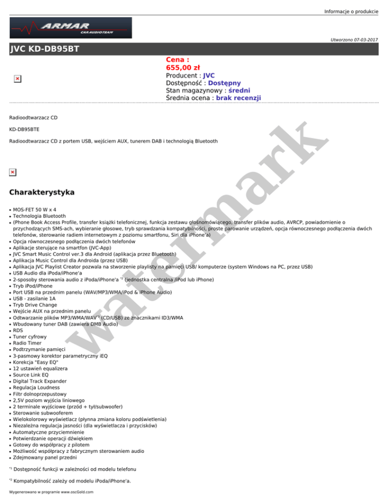 Informacje o produkcie Utworzono 07-03-2017 JVC KD-DB95BT Cena : 655,00 zł Producent : JVC Dostępność : Dostępny Stan magazynowy : średni Średnia ocena : brak recenzji Radioodtwarzacz CD KD-DB95BTE Charakterystyka ● ● ● ● ● ● ● ● ● ● ● ● ● ● ● ● ● ● ● ● ● ● ● ● ● ● ● ● ● ● ● ● ● ● ● ● MOS-FET 50 W x 4 Technologia Bluetooth (Phone Book Access Profile, transfer książki telefonicznej, funkcja zestawu głośnomówiącego, transfer plików audio, AVRCP, powiadomienie o przychodzących SMS-ach, wybieranie głosowe, tryb sprawdzania kompatybilności, proste parowanie urządzeń, opcja równoczesnego podłączenia dwóch telefonów, sterowanie radiem internetowym z poziomu smartfonu, Siri dla iPhone'a) Opcja równoczesnego podłączenia dwóch telefonów Aplikacje sterujące na smartfon (JVC-App) JVC Smart Music Control ver.3 dla Android (aplikacja przez Bluetooth) Aplikacja Music Control dla Androida (przez USB) Aplikacja JVC Playlist Creator pozwala na stworzenie playlisty na pamięci USB/ komputerze (system Windows na PC, przez USB) USB Audio dla iPoda/iPhone'a 2-sposoby sterowania audio z iPoda/iPhone'a *2 (jednostka centralna /iPod lub iPhone) Tryb iPod/iPhone Port USB na przednim panelu (WAV/MP3/WMA/iPod & iPhone Audio) USB - zasilanie 1A Tryb Drive Change Wejście AUX na przednim panelu Odtwarzanie plików MP3/WMA/WAV*3 (CD/USB) ze znacznikami ID3/WMA Wbudowany tuner DAB (zawiera DMB Audio) RDS Tuner cyfrowy Radio Timer Podtrzymanie pamięci 3-pasmowy korektor parametryczny iEQ Korekcja "Easy EQ" 12 ustawień equalizera Source Link EQ Digital Track Expander Regulacja Loudness Filtr dolnoprzepustowy 2,5V poziom wyjścia liniowego 2 terminale wyjściowe (przód + tył/subwoofer) Sterowanie subwooferem Wielokolorowy wyświetlacz (płynna zmiana koloru podświetlenia) Niezależna regulacja jasności (dla wyświetlacza i przycisków) Automatyczne przyciemnienie Potwierdzanie operacji dźwiękiem Gotowy do współpracy z pilotem Możliwość współpracy z fabrycznym sterowaniem audio Zdejmowany panel przedni at ● w ● er m ar k Radioodtwarzacz CD z portem USB, wejściem AUX, tunerem DAB i technologią Bluetooth *1 Dostępność funkcji w zależności od modelu telefonu *2 Kompatybilność zależy od modelu iPoda/iPhone'a. Wygenerowano w programie www.oscGold.com *3 Niedostępne dla CD Specyfikacja techniczna KD-DB95BTE - Radioodtwarzacz CD Media Playback MP3/WMA kompatybilne z ID3 Tag/WMA CD / USB WAV kompatybilne ze znacznikami USB AAC kompatybilne ze znacznikami CD / USB Odtwarzacz CD Kompatybilny z CD-R/RW MP3/WMA kompatybilne z ID3 Tag/WMA Funkcja CD Text Odtwarzanie losowe/ powtarzanie 20 - 20,000Hz (+/-1dB) Dynamika 90dB Stosunek sygnału do szumu Separacja kanałów er m ar k Charakterystyka częstotliwościowa 105dB (1kHz) 85dB Kołysanie i drżenie Below measureable limit Bluetooth Bluetooth Control [5] (wbudowany, mikrofon w zestawie) Tryb sprawdzania kompatybilności Opcja równoczesnego podłączenia dwóch telefonów Hands Free Call (HFP) Przesyłanie plików audio i sterowanie (A2DP, AVRCP) Wyświetlanie wiadomości / SMS (Short Message Service) (możliwy tylko odbiór) Wybieranie głosowe (wymagany kompatybilny model telefonu) Siri Eyes Free Mode for iPod/iPhone Phone Book Access Profile (PBAP) Transfer książki telefonicznej Radio internetowe i sterowanie smartfonem (A2DP, AVRCP) JVC Smart Music Control (App) Wyświetlanie wiadomości / SMS (Short Message Service) Mikrofon Obsługiwane aplikacje/ oprogramowanie at JVC Smart Music Control (App) Yes (Android) ver.3 (możliwy tylko odbiór) Yes (Android via Bluetooth(R) & USB) ver.3 JVC Music Control (App) Yes (Android via USB) JVC Playlist Creator (Windows(R) PC software) Yes (USB Memory/Thumb Drive via USB) Android Control Yes (AUDIO MODE)[7] JVC Smart Music Control Yes (via Bluetooth(R)) w Android AUDIO MODE and AUTO MODE Ładowanie (USB: 1A maks.) Sterowanie iPodem/iPhone'em Odtwarzanie muzyki z iPoda/iPhone'a Odtwarzanie losowe/ powtarzanie Text Ładowanie (USB: 1A maks.) Sterowanie iPodem/iPhone'em (USB) 2-Way Control for iPod/iPhone (Head Unit/iPod or iPhone Mode) [2] (USB: tylko audio) Tryb iPod/iPhone (USB) USB Pozycja Przód Odtwarzanie losowe/ powtarzanie USB - zasilanie 1A JVC Playlist Creator (Windows(R) PC software) Yes (USB Memory/Thumb Drive) Pamięć masowa USB (pliki muzyczne) Drive Change Mode for Mass Storage Class (selectable from internal/external memory) Yes (Up to 5 Slots) MP3/WMA kompatybilne z ID3 Tag/WMA Kompatybilne z AAC/WAV [1] Yes (WAV only) iPod/iPhone Playback JVC Smart Music Control (App) (Android) Informacje o produkcie JVC Music Control (App) (Android) Tuner Built-In DAB Tuner Yes (including DMB Audio) Radio Data System (RDS) Yes (with Radio Text Plus) Typ tunera Tuner cyfrowy Pamięć stacji 18FM + 6MW/LW + 18DAB Strong Station Memory (for FM) Radio Timer Yes (Once/Daily/Weekly) Tuner Preset Memory (for power disconnection) DAB Zakres częstotliwości Band lll: 174.928 - 239.200MHz, L-Band: 1,452.960 - 1,490.624MHz FM 87.5 - 108.0MHz (50kHz) Czułość 8.2dBf (0.71uV/75 ohms) Czułość wyciszenia 46dB 17.2dBf (2.0uV/75 ohms) Separacja stereo 40dB SSM (dla FM) MW Zakres częstotliwości er m ar k Zakres częstotliwości 531 - 1,611kHz (9kHz) Czułość 28.2uV LW Zakres częstotliwości 153 - 279kHz (9kHz) Czułość 50uV Audio Maksymalna moc wyjściowa Moc wyjściowa 50W x 4 30W x 4 (PWR DIN45324, +B=14.4V) Wzmacniacz MOS-FET Audio DAC EQ 3-pasmowy korektor parametryczny iEQ Łatwe ustawienia equalizera Ustawienia EQ Yes (12-preset) Source Link EQ Digital Track Expander Yes (Off/Low/High) at Regulacja Loudness Filtr górnoprzepustowy/ filtr dolnoprzepustowy - /Yes Nominalna impedancja 4 omy (4 - 8 omów) Poziom przed-wyjścia 2.5V Impedancja wyjścia liniowego Poniżej 600 omów Poziom wyjścia subwoofera 2.5V w Przełącznik do wyłączania wzmacniacza Wejście AUX 1 (przód) Terminale wyjścia liniowego 2 par