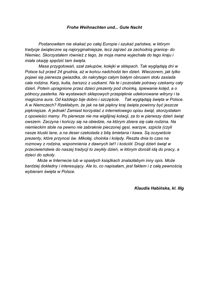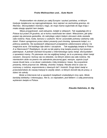 Frohe Weihnachten und... Gute Nacht Postanowiłam nie skakać po całej Europie i szukać państwa, w którym tradycje świąteczne są najoryginalniejsze, lecz zajrzeć za zachodnią granicę- do Niemiec. Skorzystałem również z tego, że moja mama wyjechała do tego kraju i miała okazję spędzić tam święta. Masa przygotowań, szał zakupów, kolejki w sklepach. Tak wyglądają dni w Polsce tuż przed 24 grudnia, aż w końcu nadchodzi ten dzień. Wieczorem, jak tylko pojawi się pierwsza gwiazdka, do nakrytego całym białym obrusem stołu zasiada cała rodzina. Karp, kutia, barszcz z uszkami. Na te i pozostałe potrawy czekamy cały dzień. Potem upragnione przez dzieci prezenty pod choinką, śpiewanie kolęd, a o północy pasterka. Na wystawach sklepowych przepięknie udekorowane witryny i ta magiczna aura. Od każdego bije dobro i szczęście. Tak wyglądają święta w Polsce. A w Niemczech? Rzekłabym, że jak na tak piękny kraj święta powinny być jeszcze piękniejsze. A jednak! Zamiast korzystać z internetowego opisu świąt, skorzystałam z opowieści mamy. Po pierwsze nie ma wigilijnej kolacji, za to w pierwszy dzień świąt owszem. Zaczyna i kończy się na obiedzie, na którym zbiera się cała rodzina. Na niemieckim stole na pewno nie zabraknie pieczonej gęsi, warzyw, szpicla (czyli nasze kluski lane, a na deser czekolada z bitą śmietana i kawa. Są oczywiście prezenty, które przynosi św. Mikołaj, choinka i kolędy. Reszta dnia to czas na rozmowy z rodzina, wspomnienia z dawnych lat1 i kościół. Drugi dzień świąt w przeciwieństwie do naszej tradycji to zwykły dzień, w którym dorośli idą do pracy, a dzieci do szkoły. Może w Internecie lub w opasłych książkach znalazłabym inny opis. Może bardziej dokładny i interesujący. Ale to, co napisałam, jest faktem i z całą pewnością wybieram święta w Polsce. Klaudia Habińska, kl. IIIg