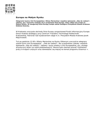 Europa na Małym Rynku Odegranie hymnu Unii Europejskiej z Wieży Mariackiej i wspólne śpiewanie „Ody do radości", zabawy, gry i koncerty znalazły się w programie Dnia Europy, który odbył się 9 maja na Małym Rynku. W inauguracji Dnia Europy wzięła udział Zastępca Prezydenta Miasta Krakowa Elżbieta Koterba. W Krakowie uroczyste obchody Dnia Europy zorganizował Punkt Informacyjny Europe Direct Kraków działający przy Centrum Transferu Technologii Politechniki Krakowskiej. Patronat nad wydarzeniem objął m.in. Prezydent Miasta Krakowa Jacek Majchrowski. Tuż po godzinie 12.00 z Wieży Mariackiej na Rynku Głównym uroczyście odegrany został hymn Unii Europejskiej - „Oda do radości". Na uczestników czekały: wspólne śpiewanie „Ody do radości", zabawy i quizy wiedzy o Unii Europejskiej, gry, występ artystyczny dzieci ze szkół podstawowych. Mozna było również poznać możliwości pracy w krajach unijnych oraz dowiedzieć się więcej na temat programu Erasmus +. Powered by TCPDF (www.tcpdf.org)