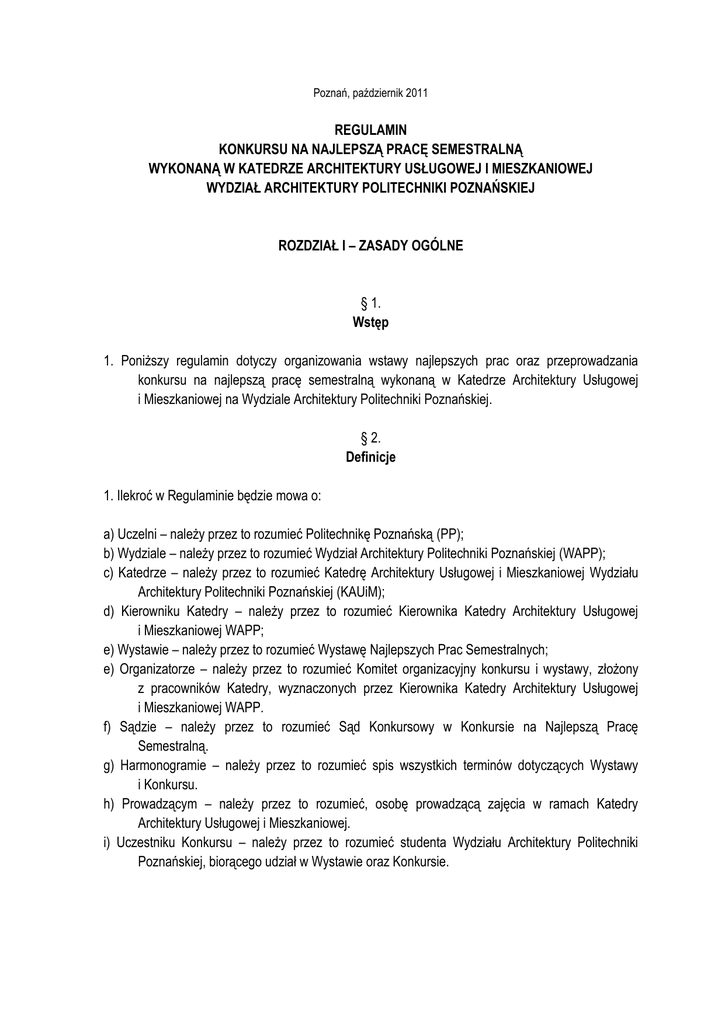Poznań, październik 2011 REGULAMIN KONKURSU NA NAJLEPSZĄ PRACĘ SEMESTRALNĄ WYKONANĄ W KATEDRZE ARCHITEKTURY USŁUGOWEJ I MIESZKANIOWEJ WYDZIAŁ ARCHITEKTURY POLITECHNIKI POZNAŃSKIEJ ROZDZIAŁ I – ZASADY OGÓLNE § 1. Wstęp 1. Poniższy regulamin dotyczy organizowania wstawy najlepszych prac oraz przeprowadzania konkursu na najlepszą pracę semestralną wykonaną w Katedrze Architektury Usługowej i Mieszkaniowej na Wydziale Architektury Politechniki Poznańskiej. § 2. Definicje 1. Ilekroć w Regulaminie będzie mowa o: a) Uczelni – należy przez to rozumieć Politechnikę Poznańską (PP); b) Wydziale – należy przez to rozumieć Wydział Architektury Politechniki Poznańskiej (WAPP); c) Katedrze – należy przez to rozumieć Katedrę Architektury Usługowej i Mieszkaniowej Wydziału Architektury Politechniki Poznańskiej (KAUiM); d) Kierowniku Katedry – należy przez to rozumieć Kierownika Katedry Architektury Usługowej i Mieszkaniowej WAPP; e) Wystawie – należy przez to rozumieć Wystawę Najlepszych Prac Semestralnych; e) Organizatorze – należy przez to rozumieć Komitet organizacyjny konkursu i wystawy, złożony z pracowników Katedry, wyznaczonych przez Kierownika Katedry Architektury Usługowej i Mieszkaniowej WAPP. f) Sądzie – należy przez to rozumieć Sąd Konkursowy w Konkursie na Najlepszą Pracę Semestralną. g) Harmonogramie – należy przez to rozumieć spis wszystkich terminów dotyczących Wystawy i Konkursu. h) Prowadzącym – należy przez to rozumieć, osobę prowadzącą zajęcia w ramach Katedry Architektury Usługowej i Mieszkaniowej. i) Uczestniku Konkursu – należy przez to rozumieć studenta Wydziału Architektury Politechniki Poznańskiej, biorącego udział w Wystawie oraz Konkursie. § 3. Cel konkursu 1. Celem konkursu jest promowanie osiągnięć studentów wydziału oraz pracy dydaktycznej pracowników katedry, jak również zachęcenia studentów do tworzenia atrakcyjnych i profesjonalnie zaprezentowanych projektów. 2. Konkurs ma za zadanie wyłonienie studentów, którzy wykonali najlepsze prace zaliczeniowe w określonym semestrze. 3. Najlepsze prace semestralne wyłonione w drodze konkursu, będą publikowane w punktowanych Zeszytach naukowych Politechniki Poznańskiej. § 4. Przedmiot konkursu 1. Przedmiotem konkursu są tylko prace semestralne. 2. Konkurs organizowany jest cyklicznie, po każdym semestrze. § 5. Organizator 1. Organizatorem konkursu jest Katedra Architektury Usługowej i Mieszkaniowej WAPP, mieszcząca się na Wydziale Architektury Politechniki Poznańskiej, bud. D, pokój 201. 2. Kierownik katedry wyznacza spośród pracowników katedry członków komitetu organizacyjnego, do którego obowiązków należy organizacja wystawy i konkursu. 3. Kierownik katedry wyznacza sekretarza konkursu, który ma za zadanie kontaktowanie się z uczestnikami konkursu i prowadzącymi zajęcia. 4. Sposób kontaktowania się z organizatorem i sekretarzem konkursu: a) osobiście w Katedrze, b) e-mailowo – na adres: [email protected] 5. Harmonogram konkursu ogłaszany jest przez komitet organizacyjny najpóźniej do końca pierwszego miesiąca nowego semestru. 6. Harmonogram powinien zawierać: a) datę ogłoszenia konkursu, b) termin zgłaszania się do udziału w konkursie, c) termin dostarczenia do Katedry prac biorących udział w wystawie c) termin spotkania organizacyjnego – przygotowywania wystawy i montowania prac – najpóźniej w przeddzień dnia otwarcia wystawy. d) termin dnia otwarcia wystawy, e) termin ogłoszenia wyników konkursu, f) termin zakończenia wystawy, g) termin demontażu wystawy. § 6. Plakat 1. Organizator zobowiązany jest do stworzenia plakatu reklamującego poszczególną edycję konkursu i wystawy. 2. Plakat powinien zawierać podstawowe informacje dotyczące harmonogramu i miejsca wystawy. 3. Plakaty powinny zostać umieszczone na stronie internetowej Wydziału, tablicy informacyjnej oraz w innych miejscach na wydziale w dniu ogłoszenia konkursu. § 7. Warunki uczestnictwa 1. W wystawie i konkursie mogą brać udział tylko prace semestralne wykonane w ramach przedmiotów prowadzonych w katedrze. 2. Uprawnionymi do udziału w konkursie i wystawie są studenci, którzy uzyskali ocenę bardzo dobry. 3. Zgłoszenie pracy powinno zostać złożone w katedrze na formularzu zgłoszeniowym (zał. nr 1). 4. Zgłoszona praca powinna zostać zamontowana na Wystawie w terminie określonym przez organizatora (w harmonogramie konkursu). 5. Uczestnik ma obowiązek zapoznania się z niniejszym regulaminem. Udział w wystawie oraz konkursie jest jednoczesną akceptacją regulaminu. 6. Udział w konkursie jest bezpłatny. ROZDZIAŁ II – WYSTAWA § 8. Miejsce wystawy 1. Przewiduje się organizowanie wystawy na terenie wydziału. 2. Organizator zobowiązany jest do podania miejsca wystawy na plakatach reklamujących wydarzenie. 3. Organizator może wyznaczyć inne miejsce wystawy na terenie i poza uczelnią. § 9. Przygotowanie Wystawy 1. Organizator ustala termin dostarczenia do katedry przez uczestników konkursu prac biorących udział w wystawie. Dostarczenie prac powinno nastąpić nie później niż na tydzień przed dniem otwarcia wystawy. 2. Organizator zastrzega sobie prawo wycofania pracy semestralnej zgłoszonej w konkursie, w przypadku stwierdzenia uchybień lub braków formalnych. 3. Organizator ustala termin spotkania organizacyjnego, podczas którego uczestnicy konkursu wystawiają swoje prace na wskazane przez organizatora miejsce. 4. Spotkanie organizacyjne powinno zostać wyznaczone nie później niż na dzień przez dniem otwarcia wystawy. 5. Praca, która nie została dostarczona ani wystawiona we wskazanym przez organizatora terminie, nie bierze udziału w wystawie i tym samym w konkursie. § 10. Wystawa 1. Prace studenckie wystawiane będą przez okres dwóch tygodni. 2. Organizator przewiduje możliwość przedłużenia wystawy. 3. W wyznaczonym w harmonogramie terminie, orga